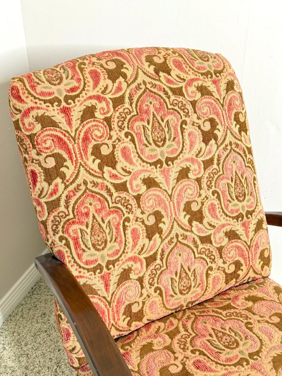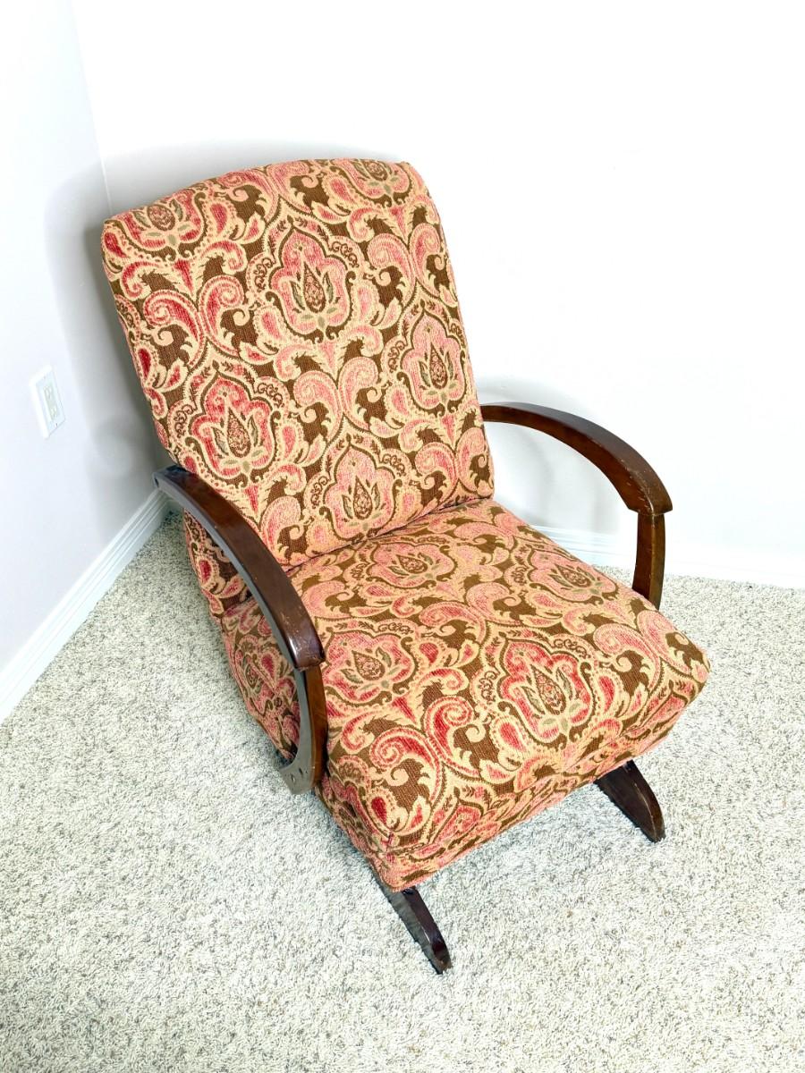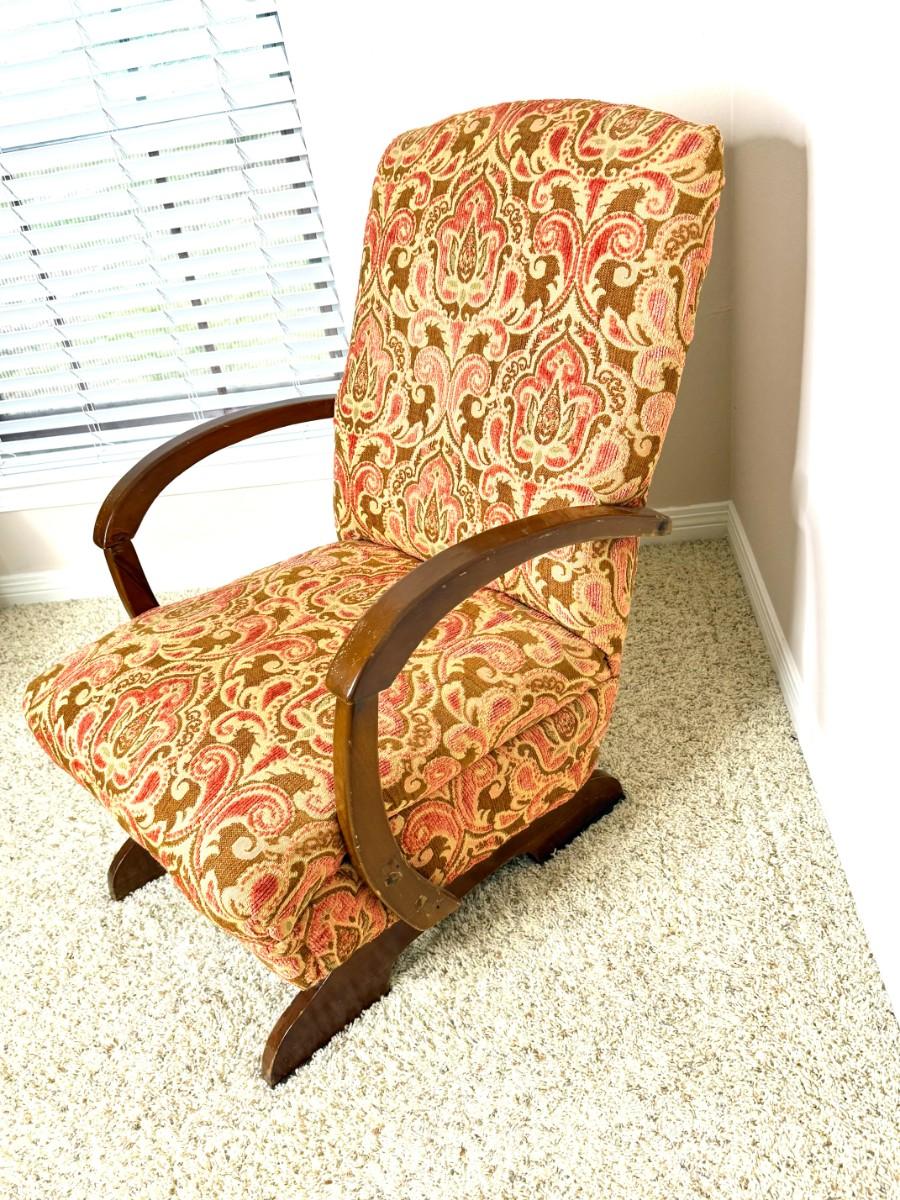 MCM Upholstered Glider with Wooden Arms and Chenille Flowers
