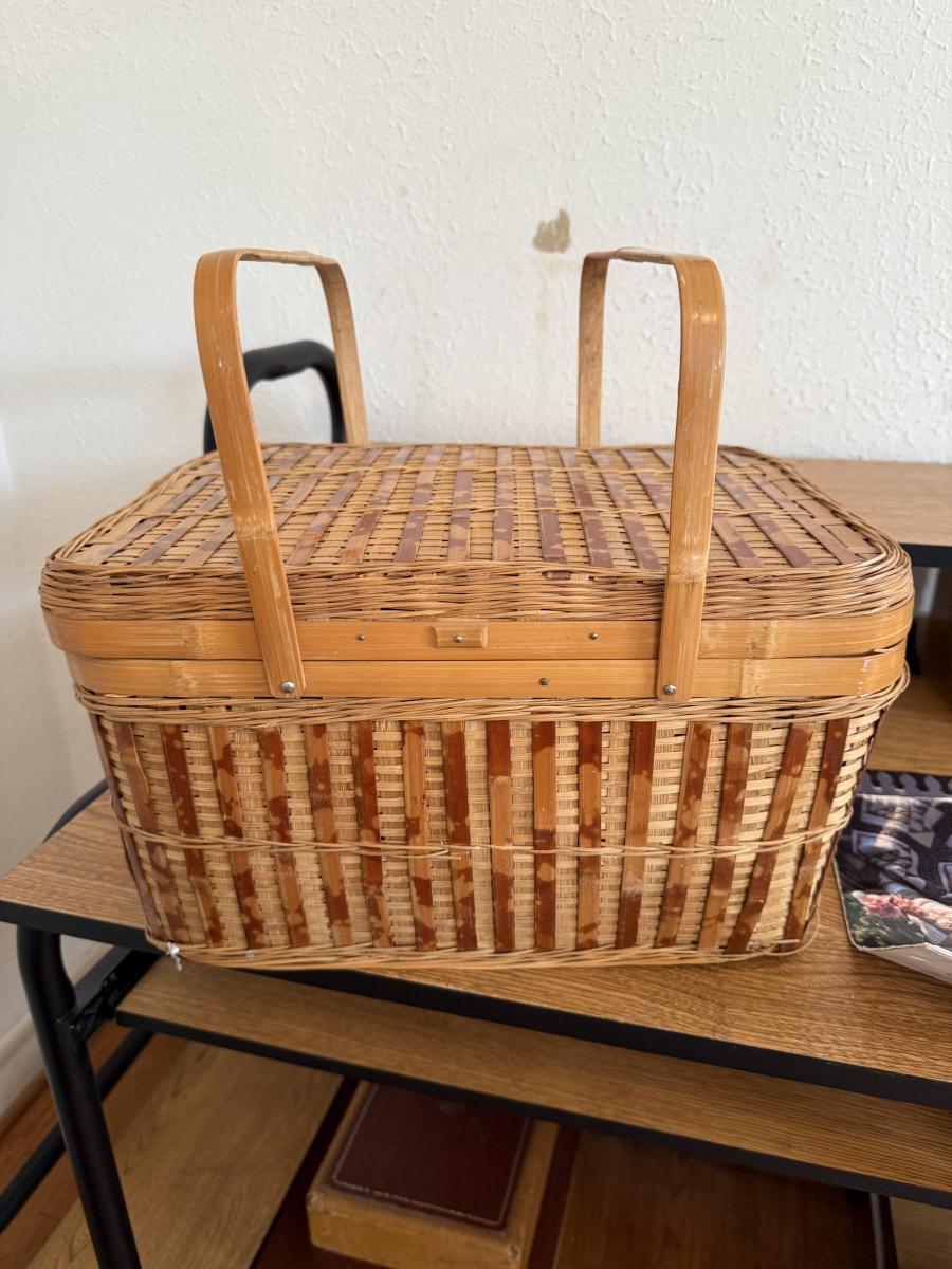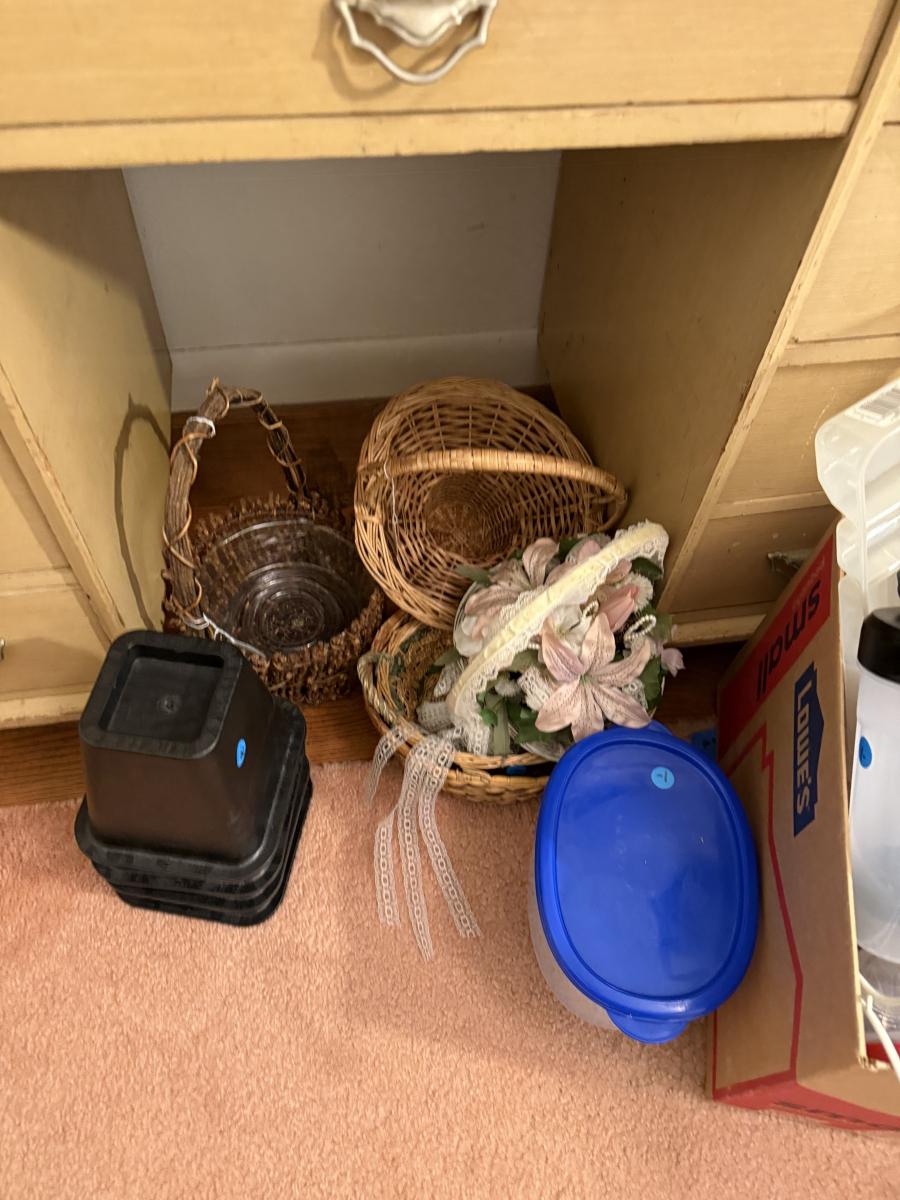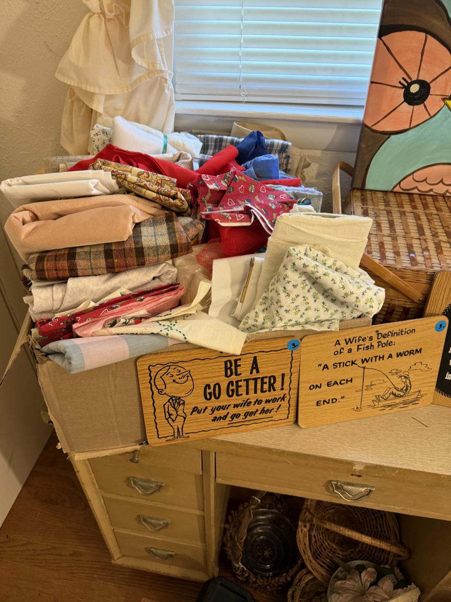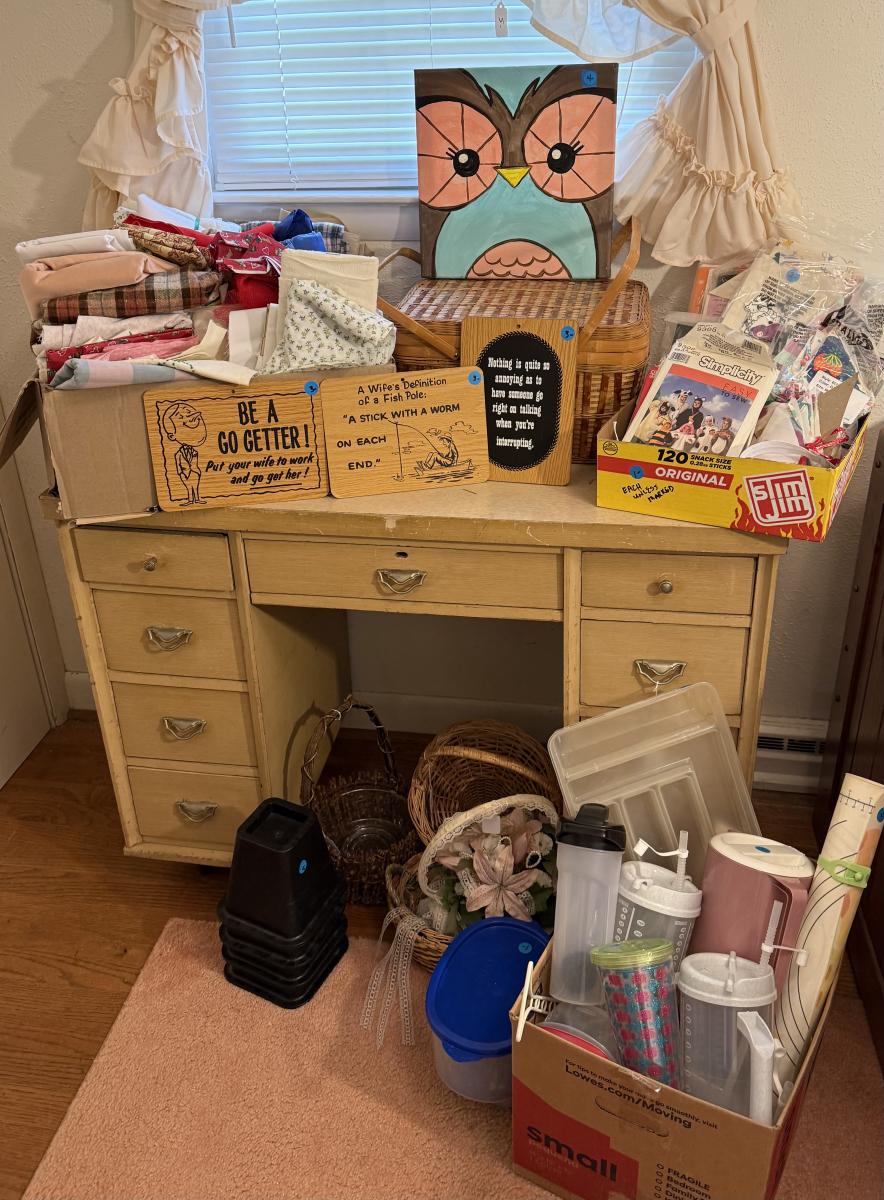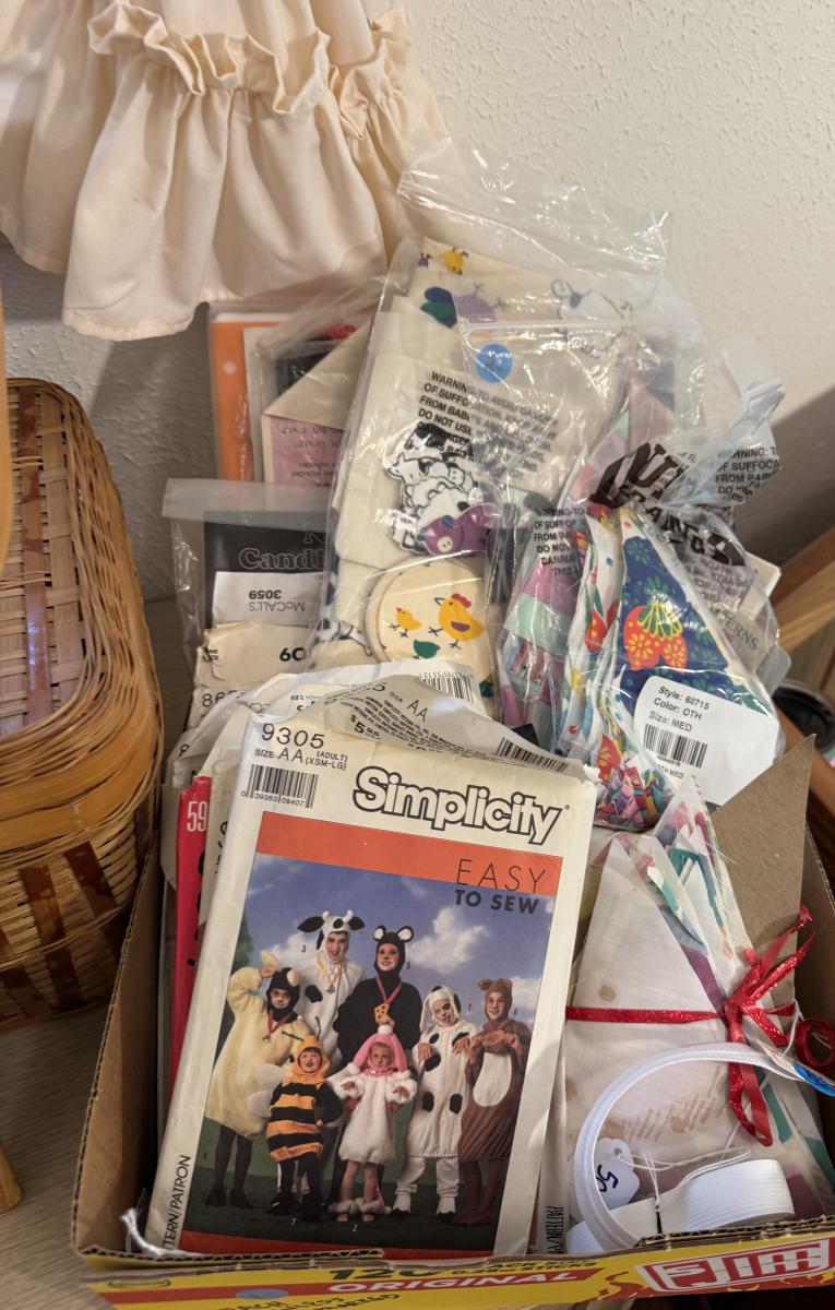 MCM vanity/desk, sewing material, patterns, art, baskets, bed risers, box plastic items
