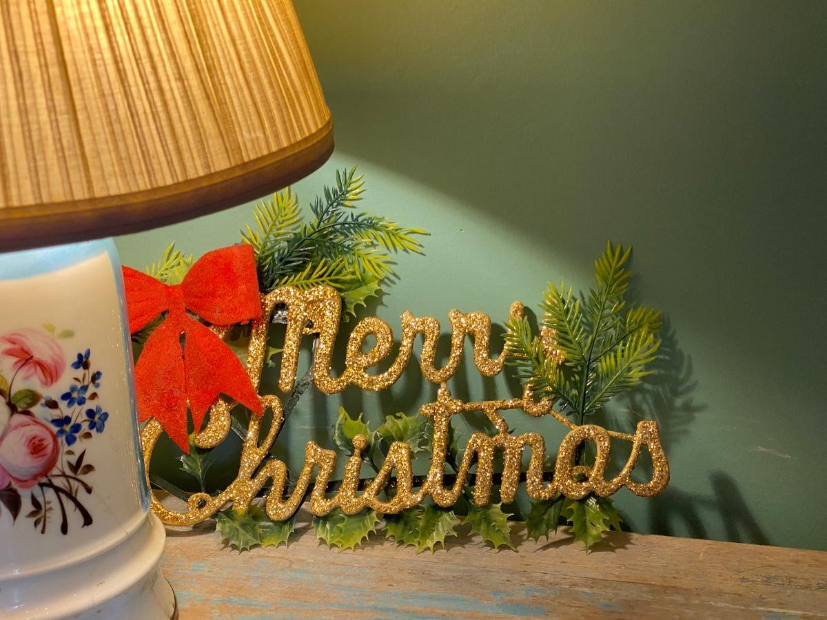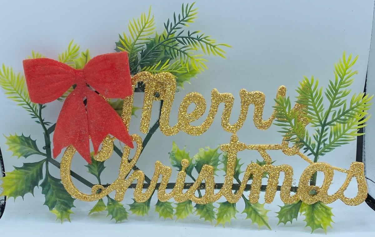 Soooo cute Merry Christmas decoration for your door, wall, entry, wherever! Heavy glitter lettering, faux plastic greenery and a red bow. Measures 14” x 8 x .5.