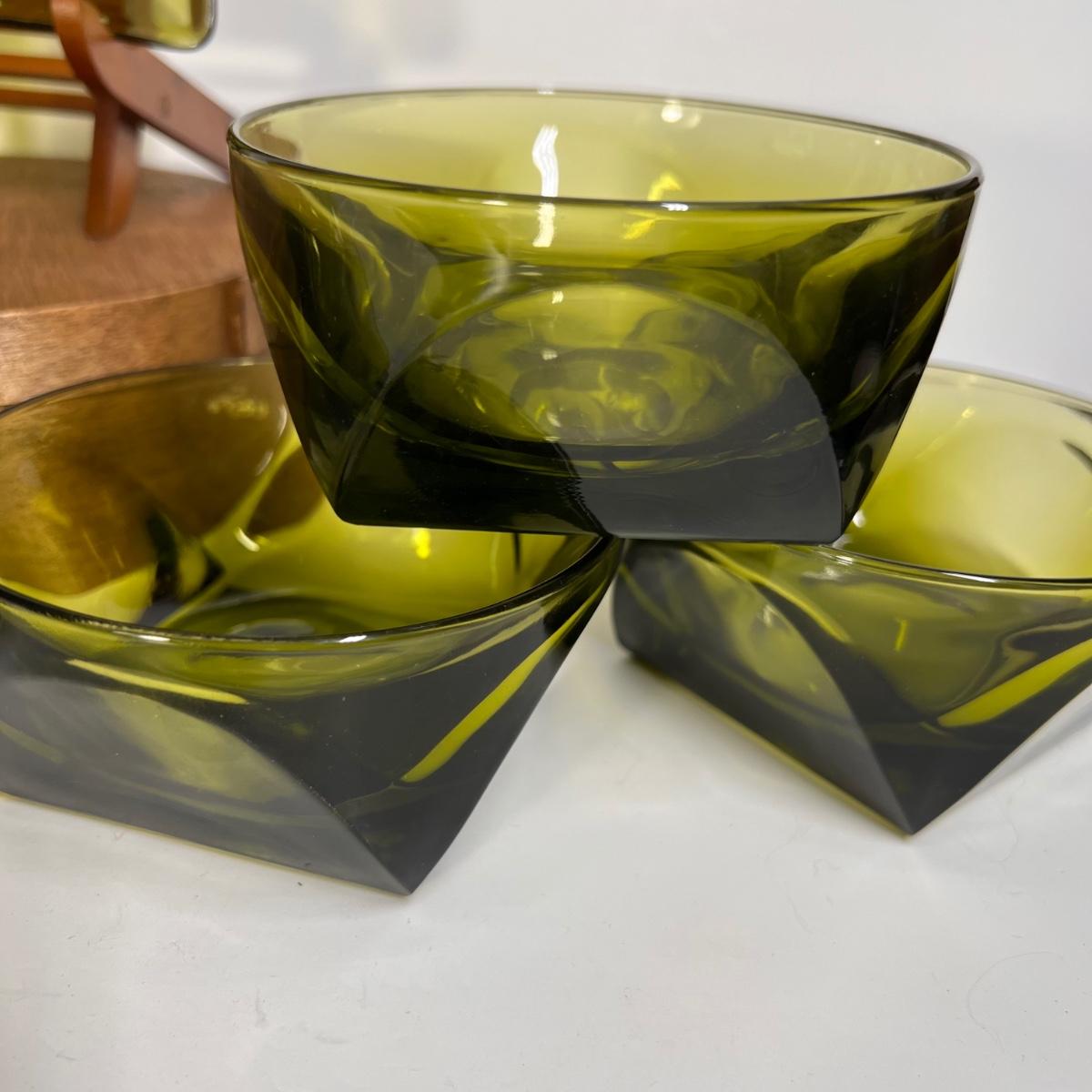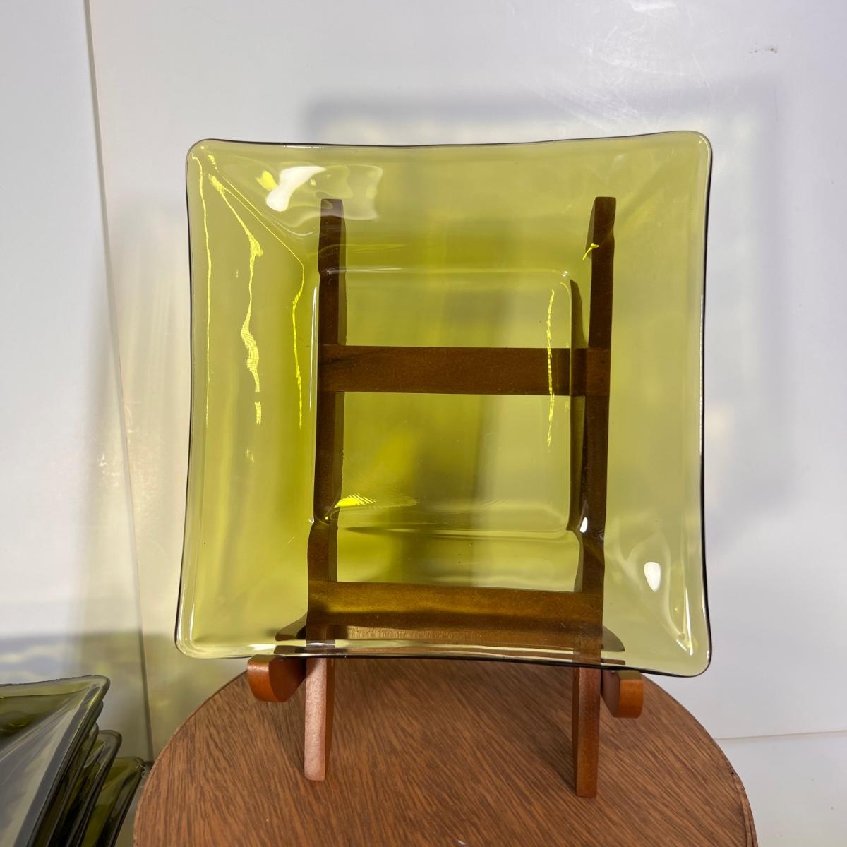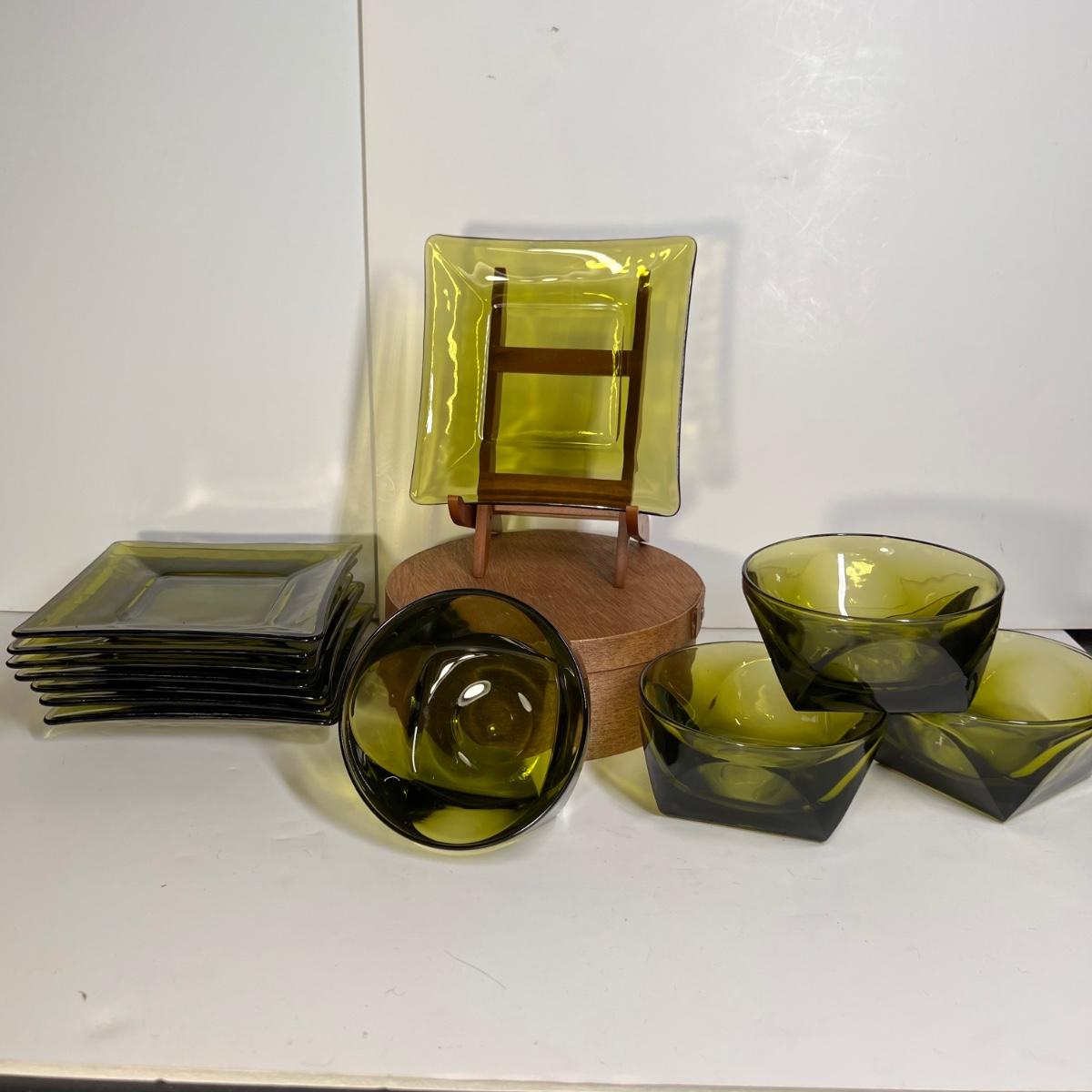 Awesome MidCentury Modern Set. 8 Green glass plates. 4 matching geometric shaped bowls. Note one bowl has small chip as shown in picture.