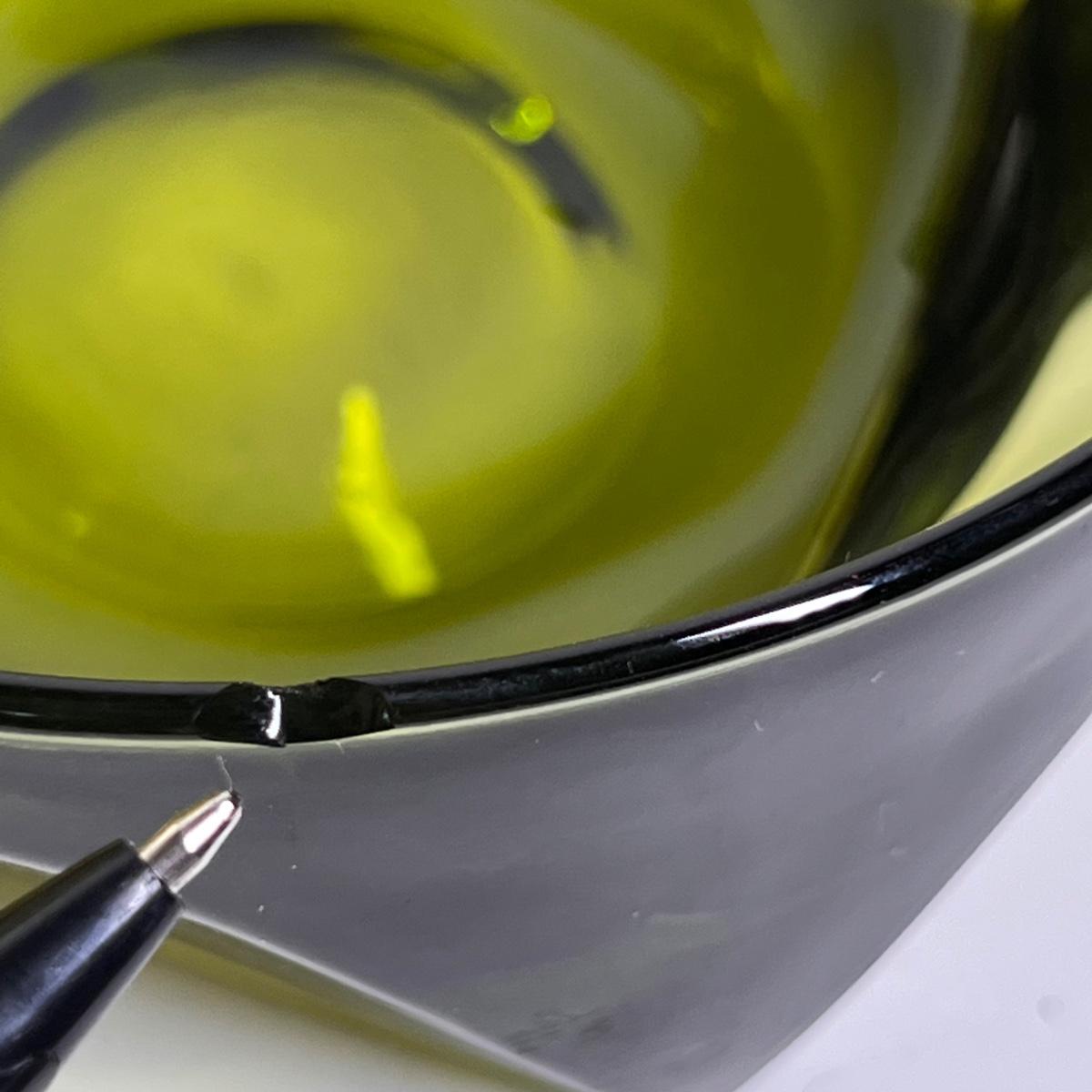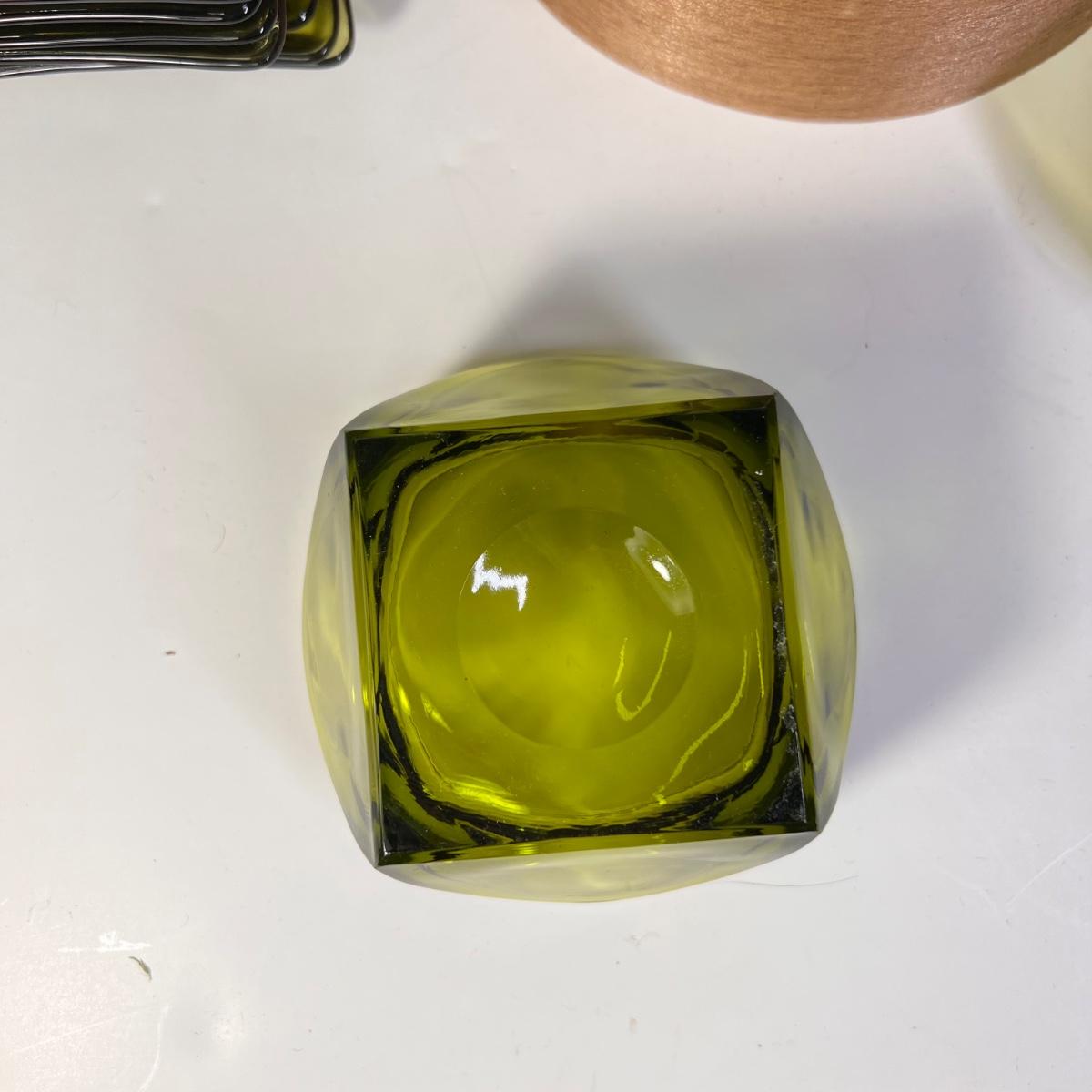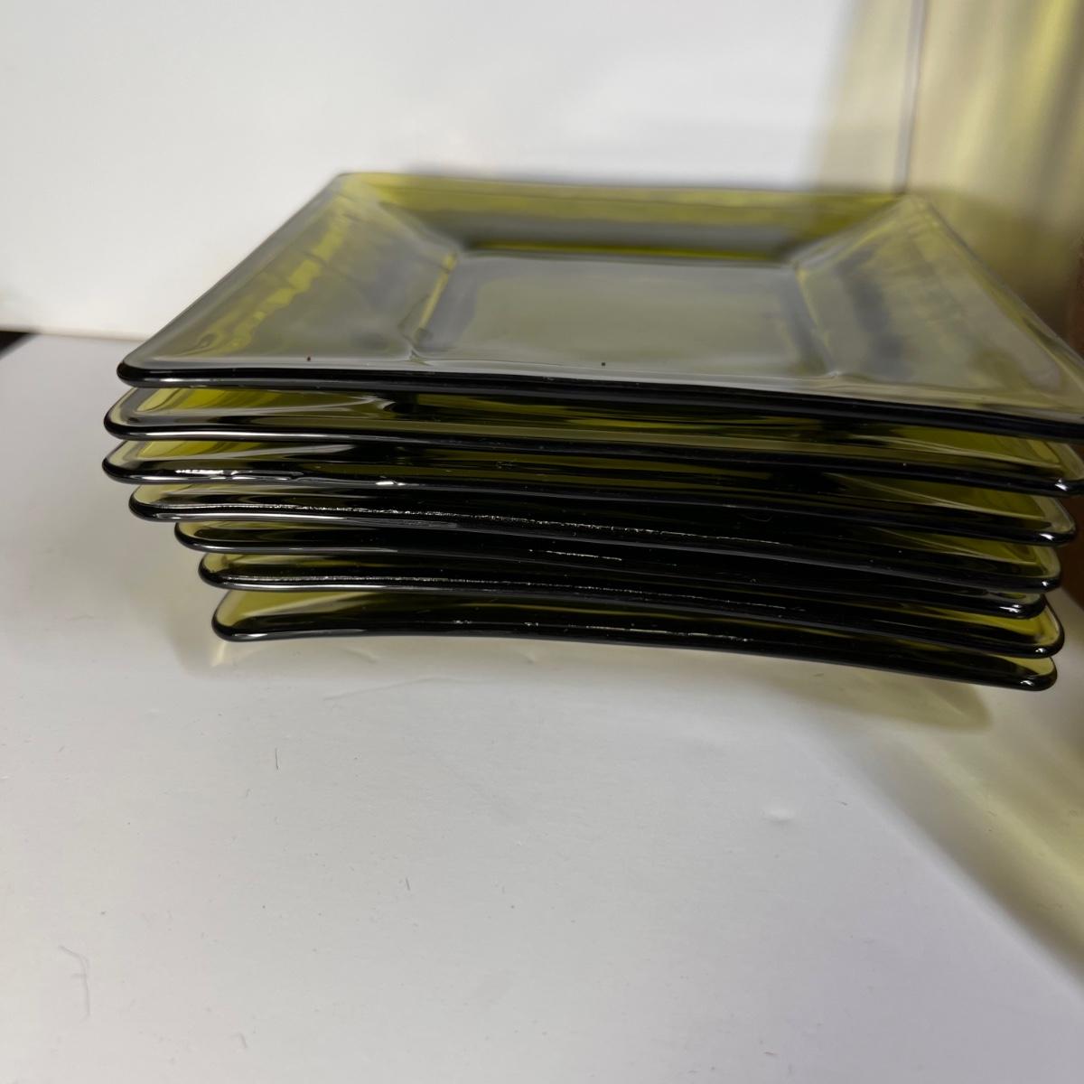 Awesome MidCentury Modern Set. 8 Green glass plates. 4 matching geometric shaped bowls. Note one bowl has small chip as shown in picture.