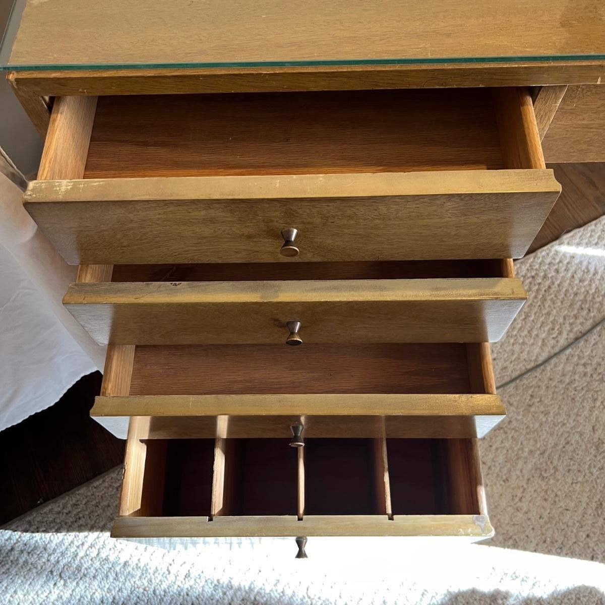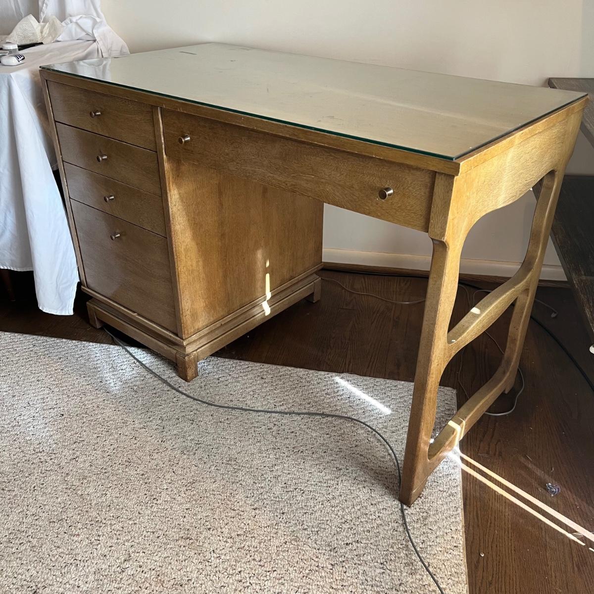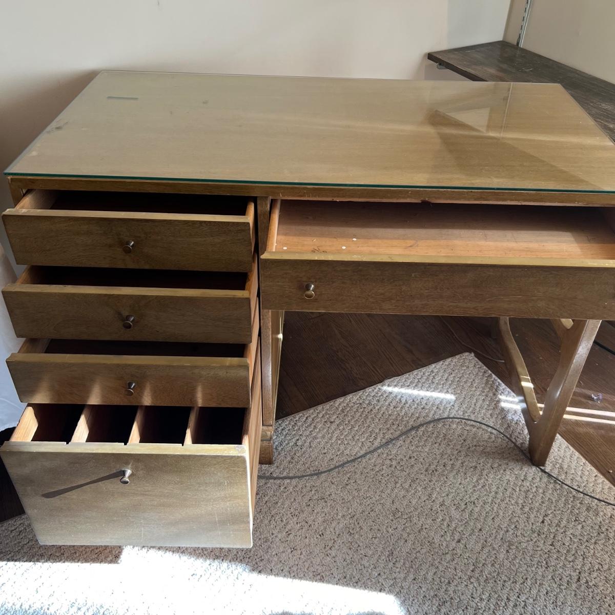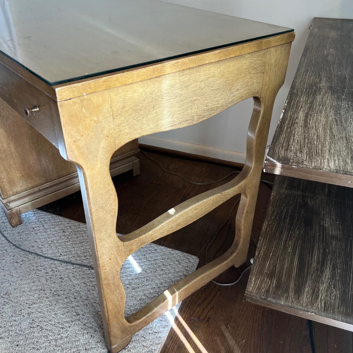 This stunning desk is made of a light colored solid wood with a unique cutout side panel on the right. Five drawers total with the largest on the lower left featuring compartments. Each dovetailed drawer has an aged brass colored metal pull. There are some minor signs of wear with a few nicks shown in images; one chip under the lower drawer, writing inside one drawer and a few pieces of old tape stuck on the back as well. Desk has a quarter inch thick removable glass protector pad which is included.