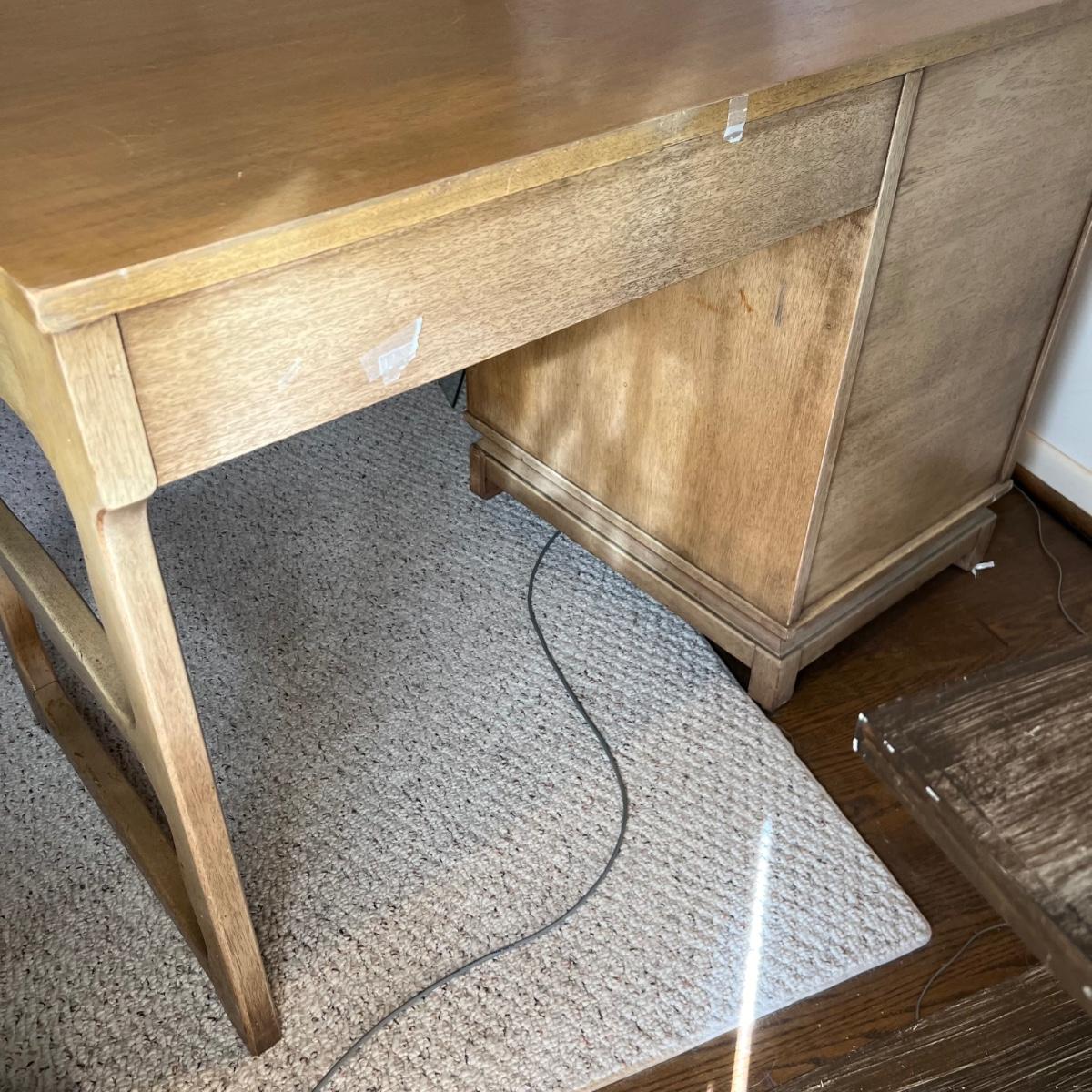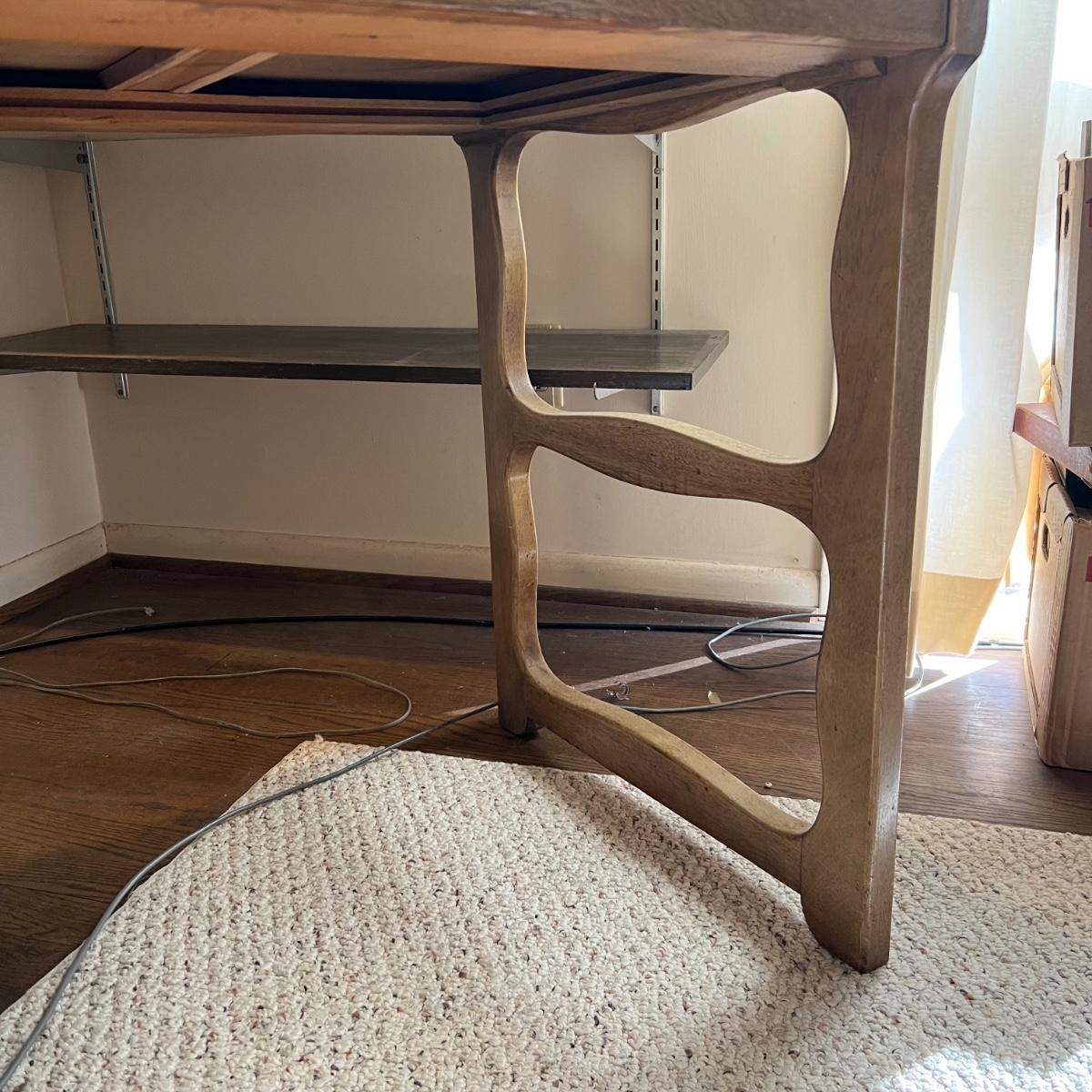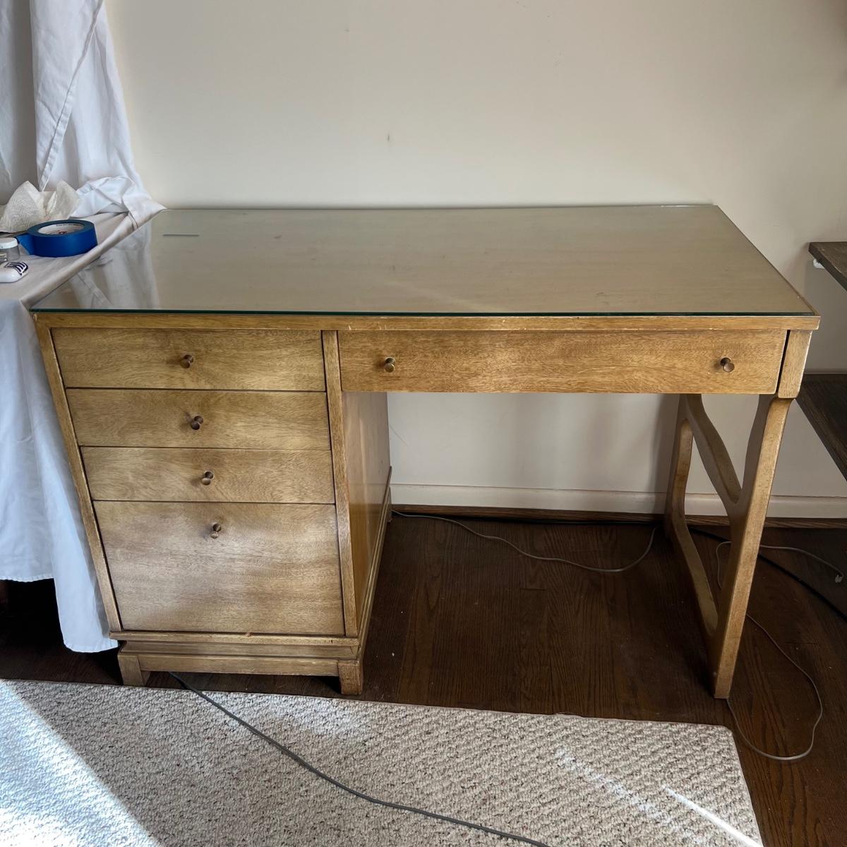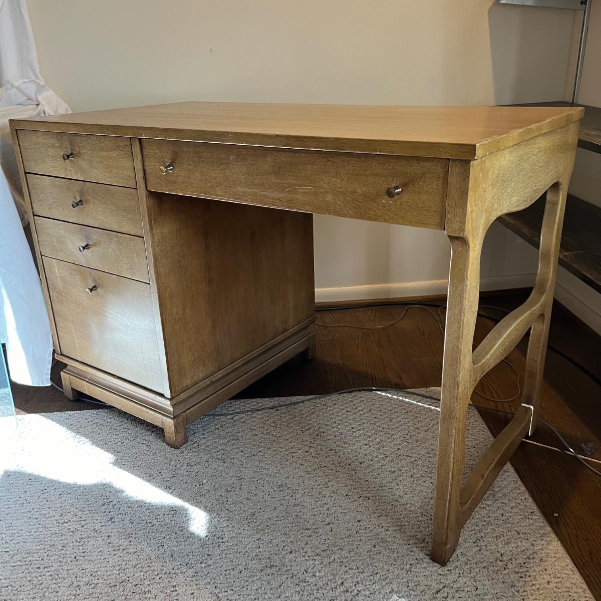 This stunning desk is made of a light colored solid wood with a unique cutout side panel on the right. Five drawers total with the largest on the lower left featuring compartments. Each dovetailed drawer has an aged brass colored metal pull. There are some minor signs of wear with a few nicks shown in images; one chip under the lower drawer, writing inside one drawer and a few pieces of old tape stuck on the back as well. Desk has a quarter inch thick removable glass protector pad which is included.