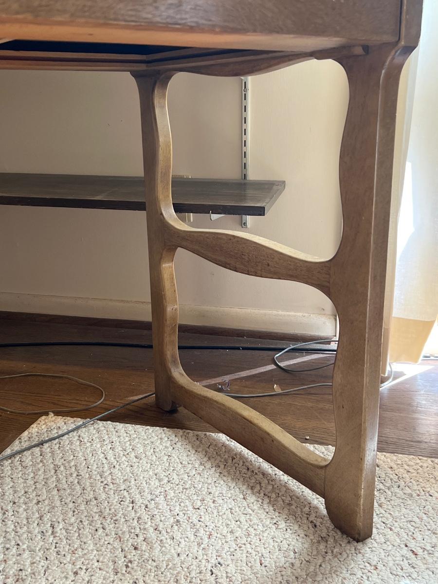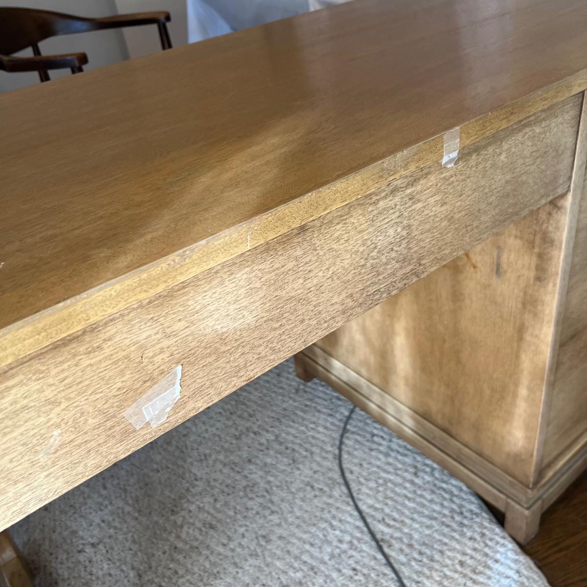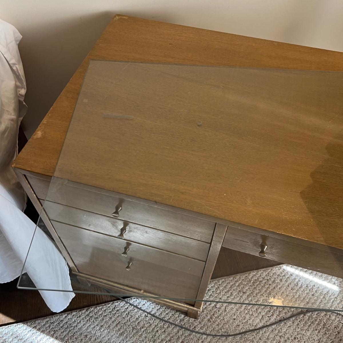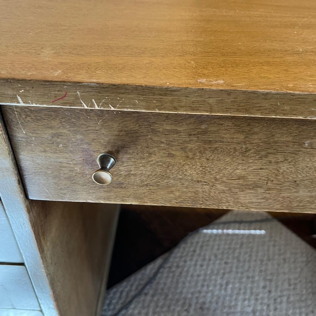 This stunning desk is made of a light colored solid wood with a unique cutout side panel on the right. Five drawers total with the largest on the lower left featuring compartments. Each dovetailed drawer has an aged brass colored metal pull. There are some minor signs of wear with a few nicks shown in images; one chip under the lower drawer, writing inside one drawer and a few pieces of old tape stuck on the back as well. Desk has a quarter inch thick removable glass protector pad which is included.