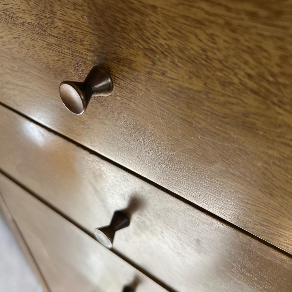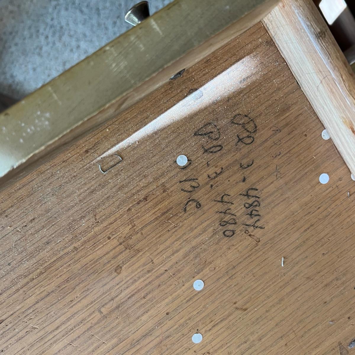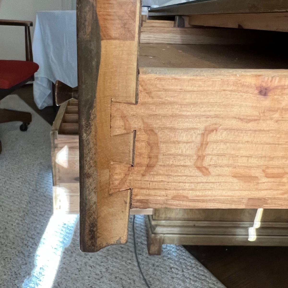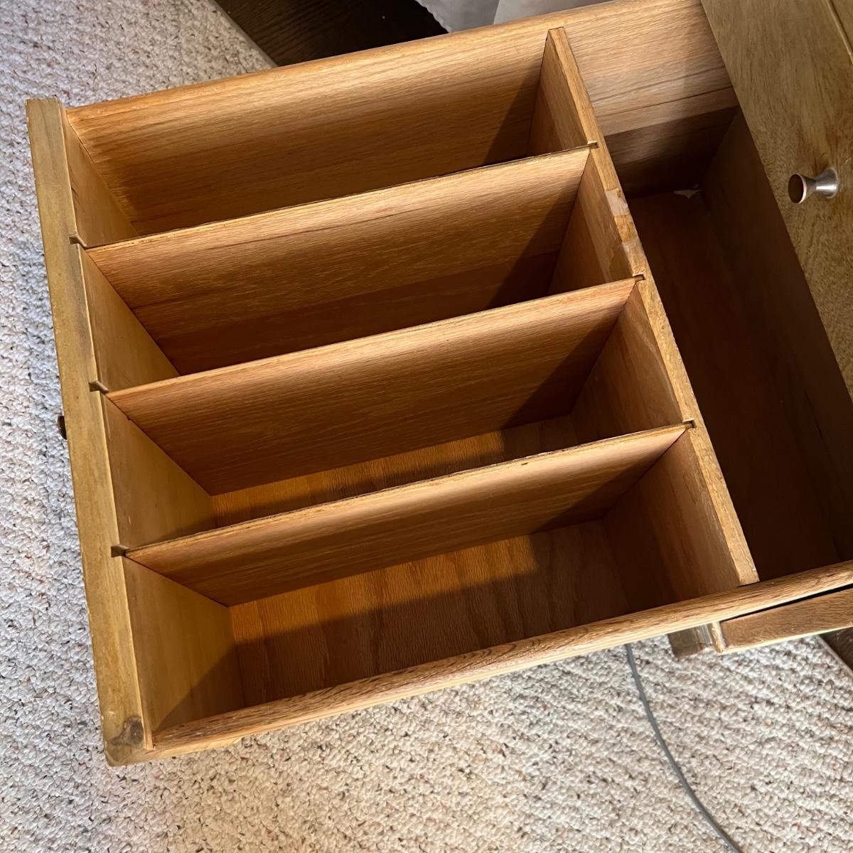 This stunning desk is made of a light colored solid wood with a unique cutout side panel on the right. Five drawers total with the largest on the lower left featuring compartments. Each dovetailed drawer has an aged brass colored metal pull. There are some minor signs of wear with a few nicks shown in images; one chip under the lower drawer, writing inside one drawer and a few pieces of old tape stuck on the back as well. Desk has a quarter inch thick removable glass protector pad which is included.