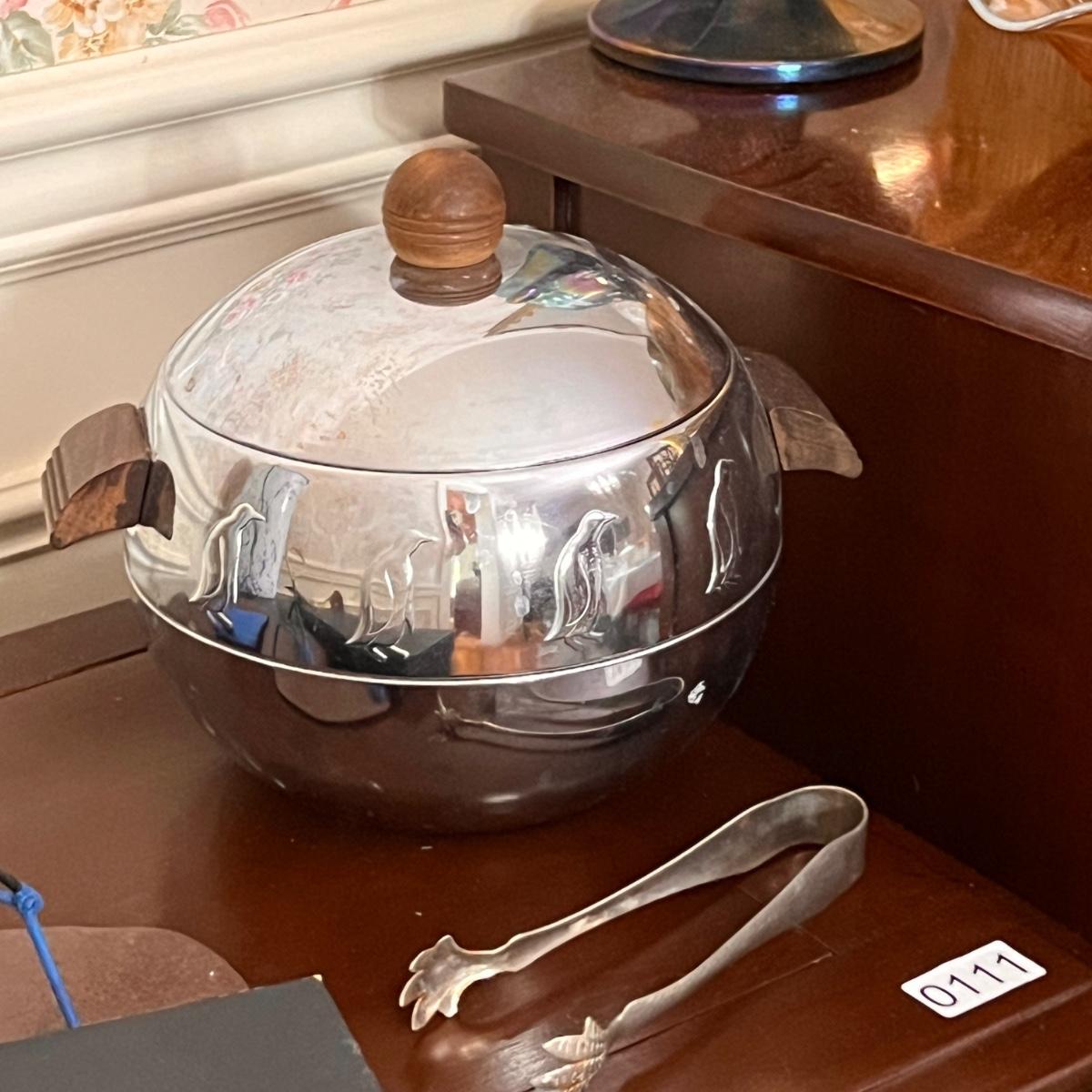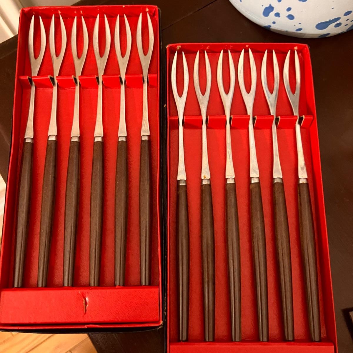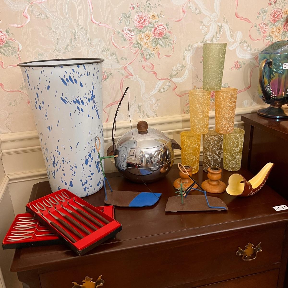 2 boxes teak handle fondue forks, splatter metal umbrella bucket, penguin west bend ice bucket, 6 spaghetti string glasses, Drostdy Ware South African pipe holder, wood candlestick holders, 2 metal wire sculptures,