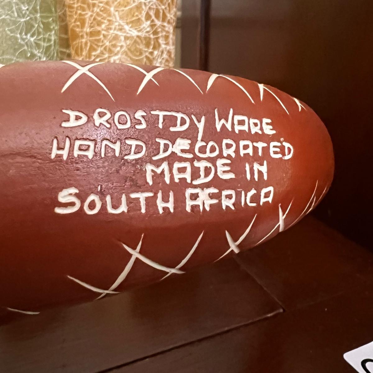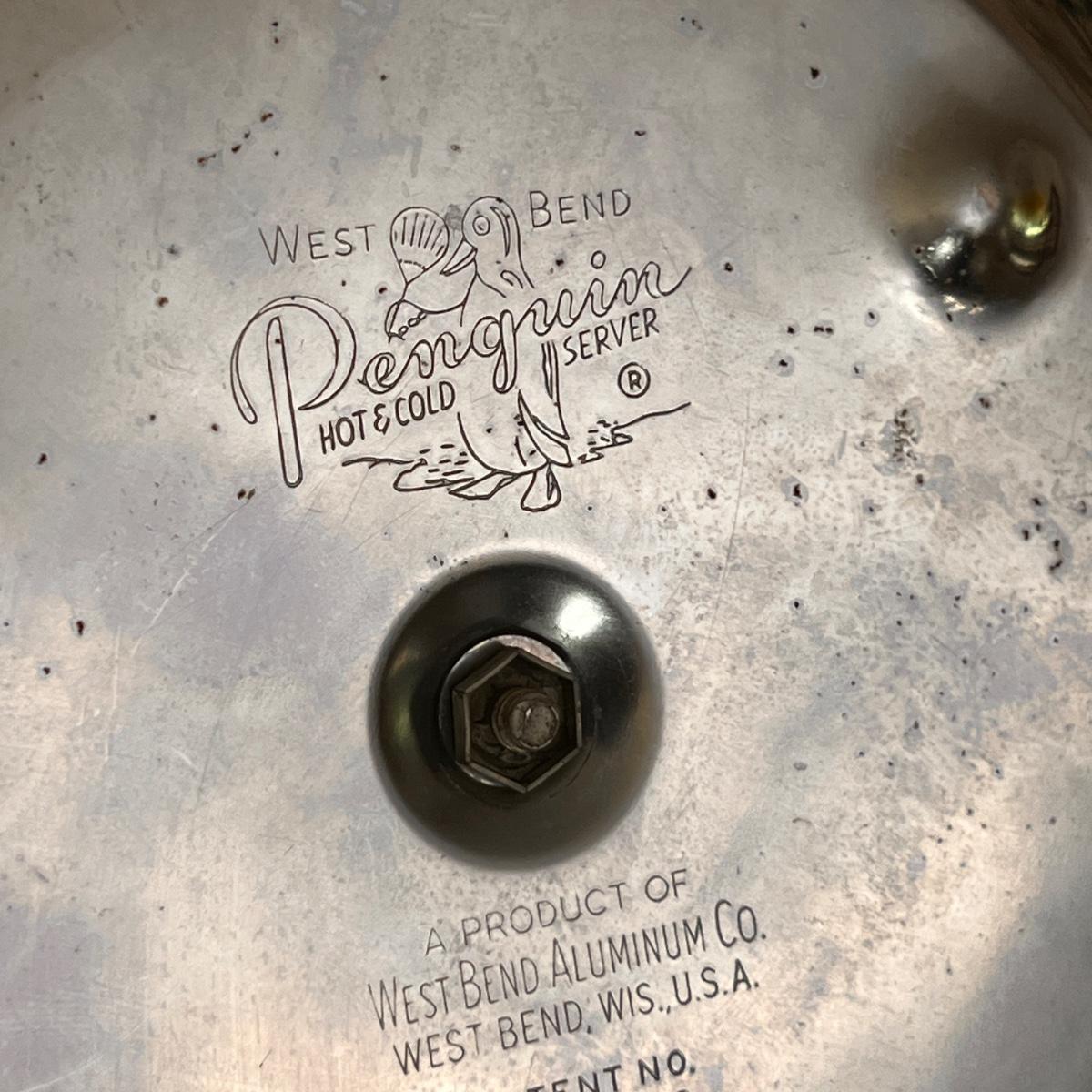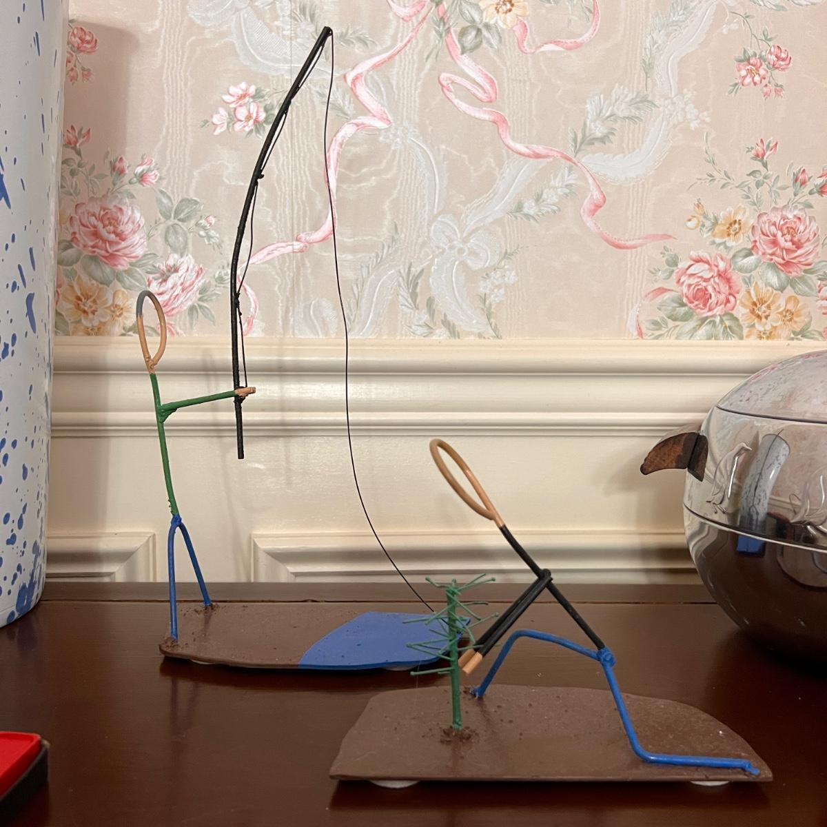 2 boxes teak handle fondue forks, splatter metal umbrella bucket, penguin west bend ice bucket, 6 spaghetti string glasses, Drostdy Ware South African pipe holder, wood candlestick holders, 2 metal wire sculptures,