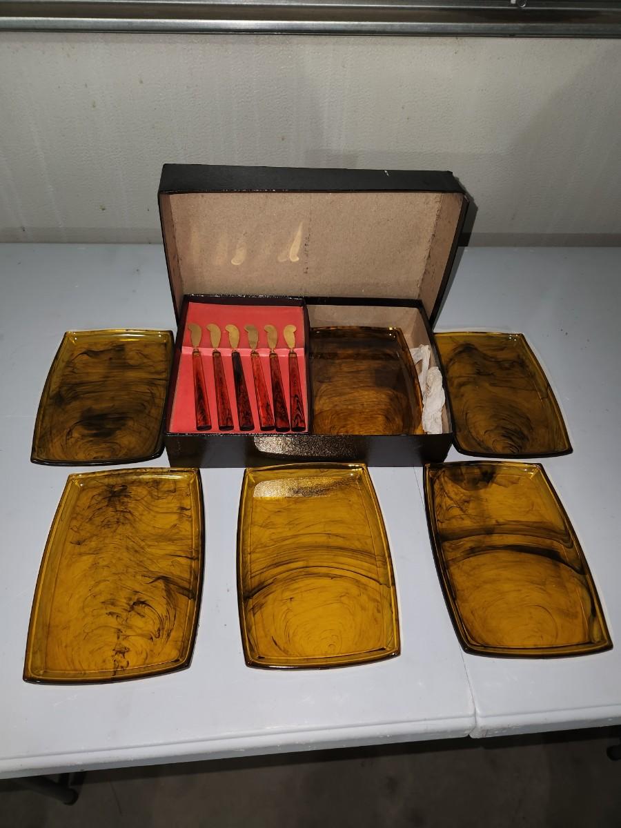 MCM Vintage Lucite Plates Tortoise Set Appetizer Plates & Forks 12 Pcs