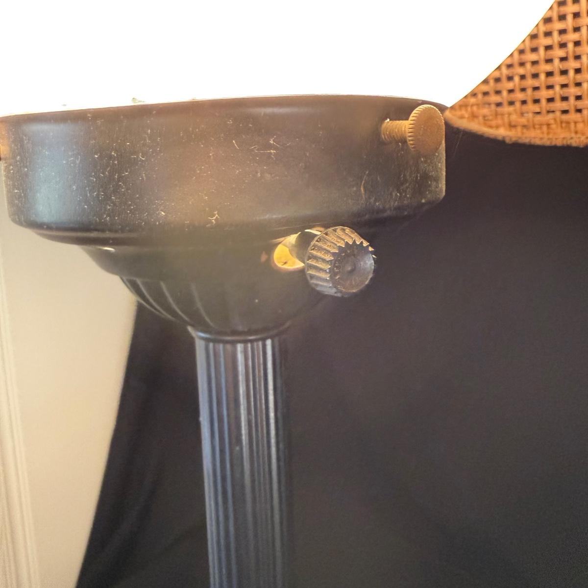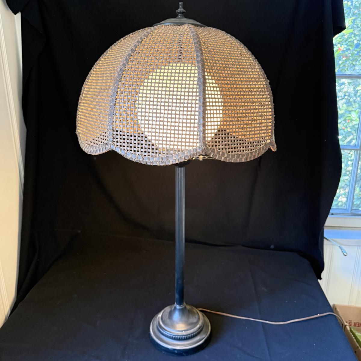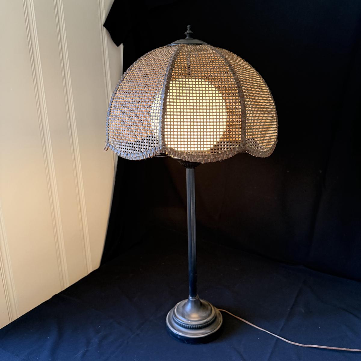 This lot contains a groovy table lamp with a gorgeous wicker scalloped edge shade, a globe light over the bulb and a metal stand. This piece measures 7.5”D at the base 19”D at the lampshade x 33.5”H. This piece powered on via a switch by the bulb and is a one way switch. Shipping available.