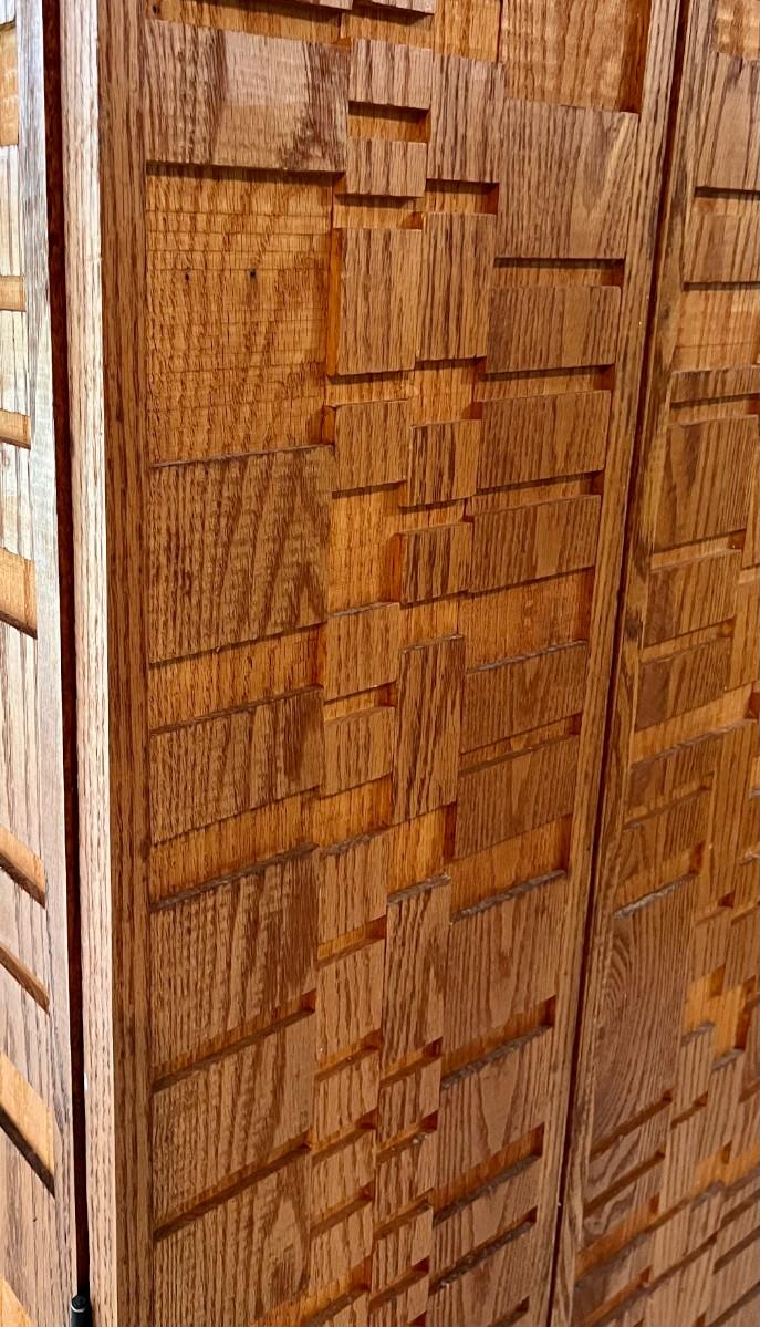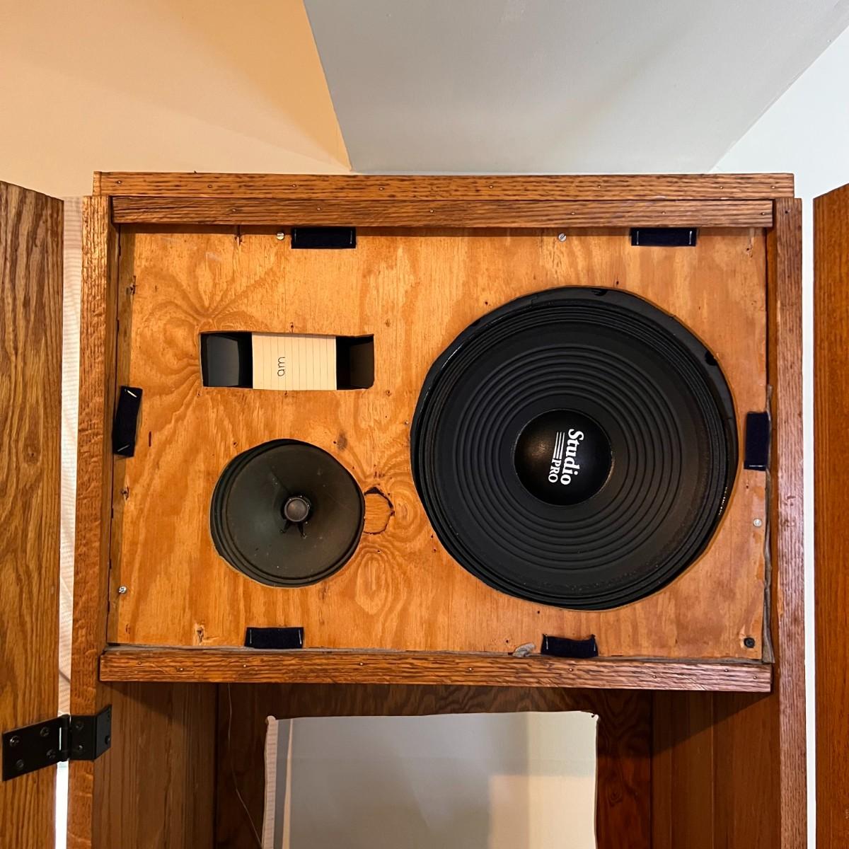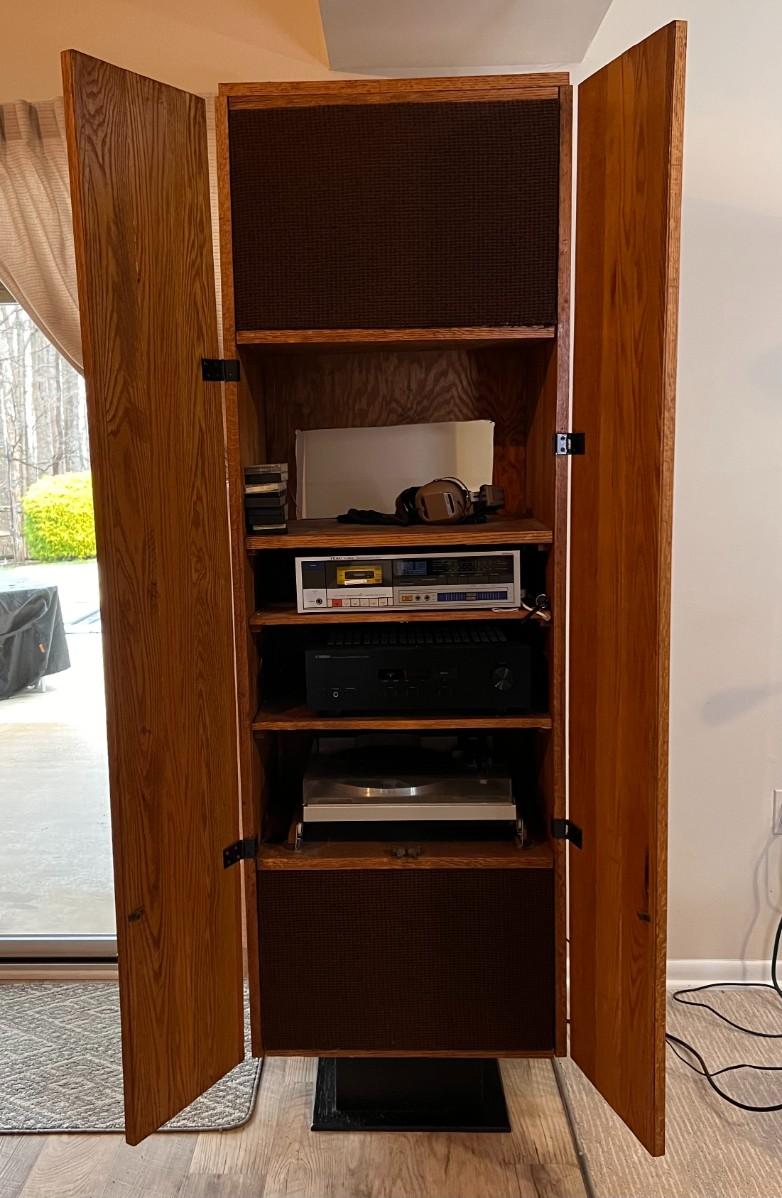 One of a kind carved wood audio cabinet with double open doors, black base, top and bottom Studio Pro speakers (comes with tweeter, woofer and midrange) and 4 shelves for equipment. Electronics not included. 78" tall, 24.5" wide, 18" deep. Sounds great!