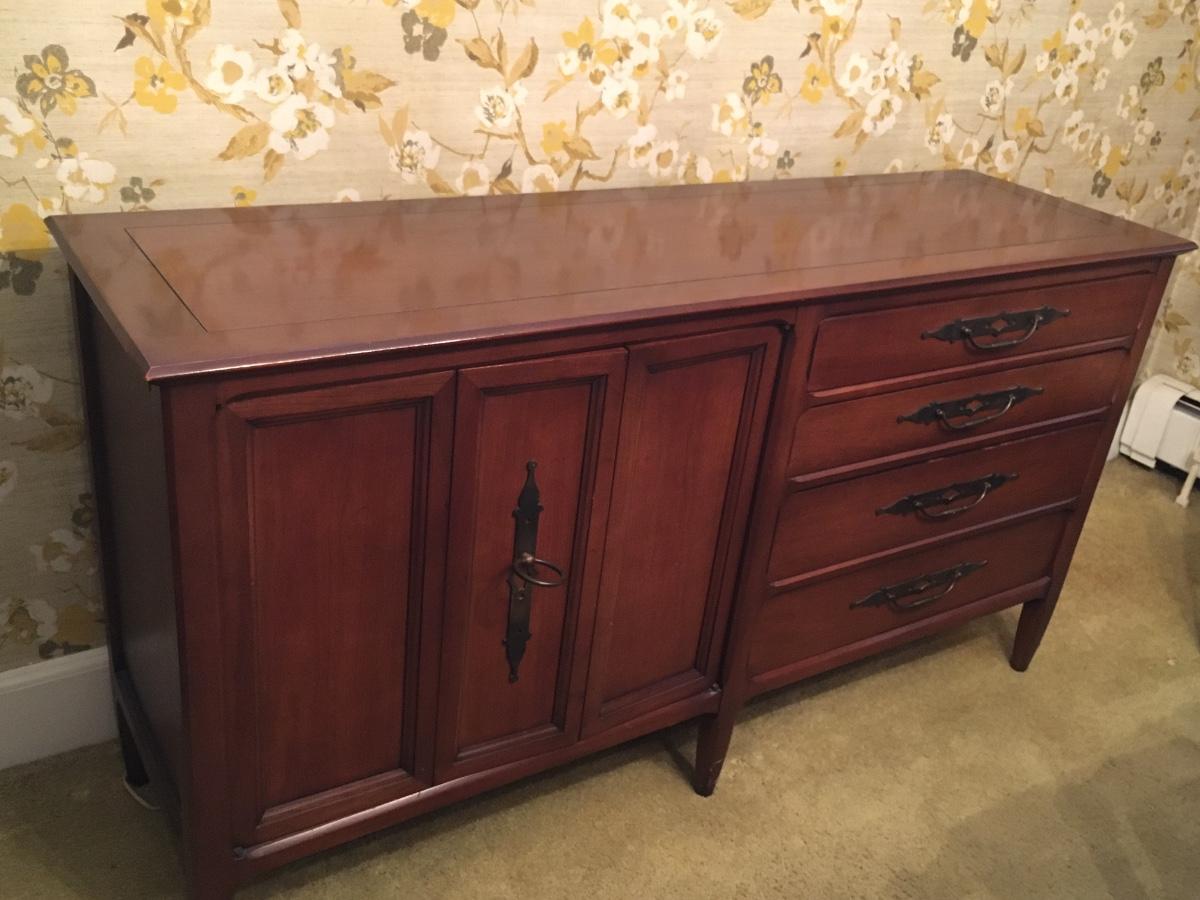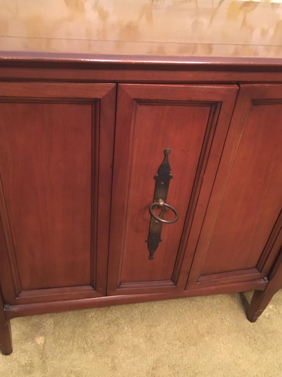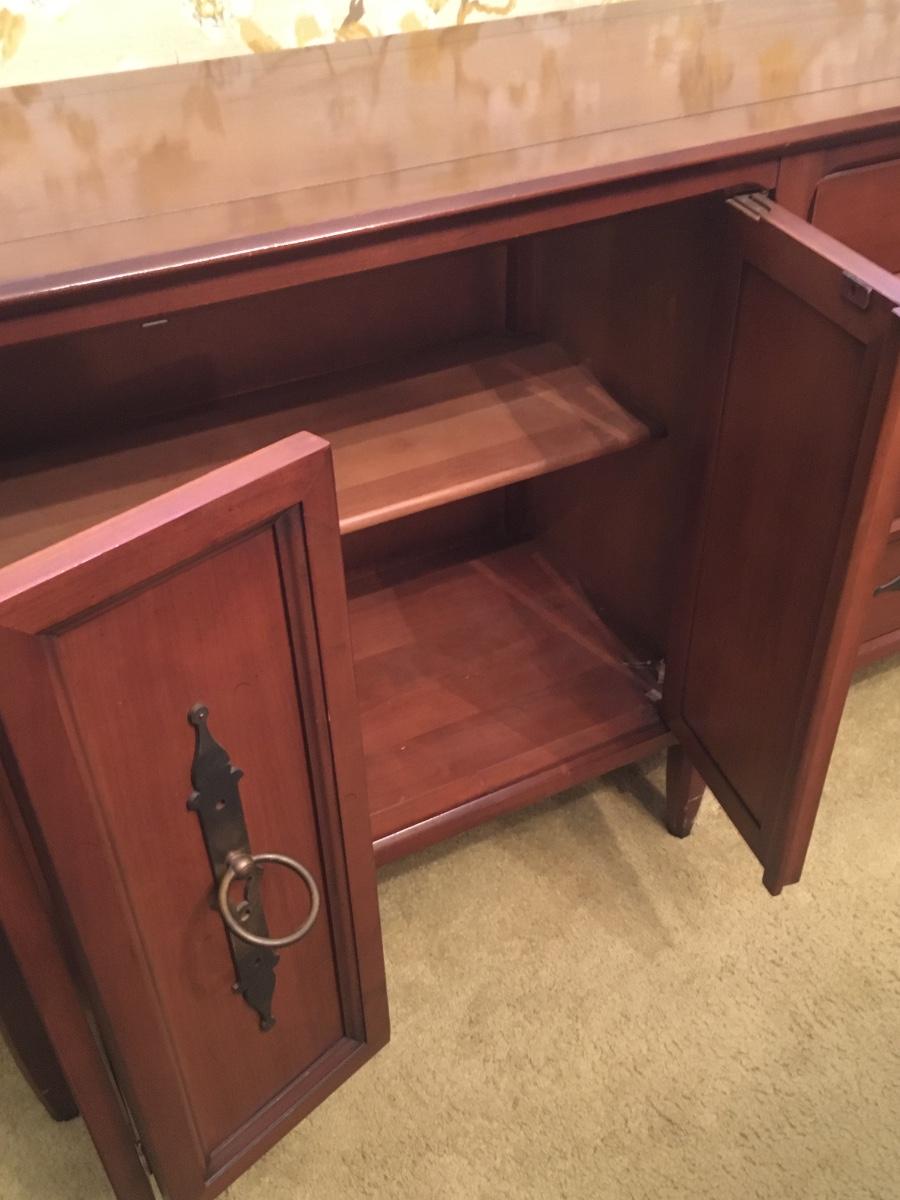 Wood sideboard with 4 drawers and cabiet door that opens for shelf storage