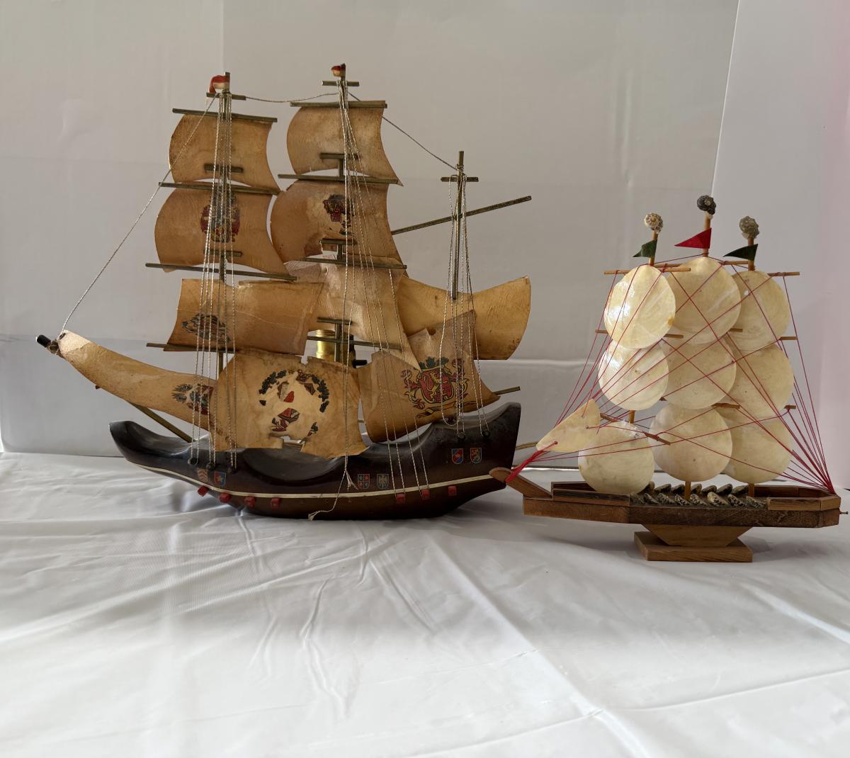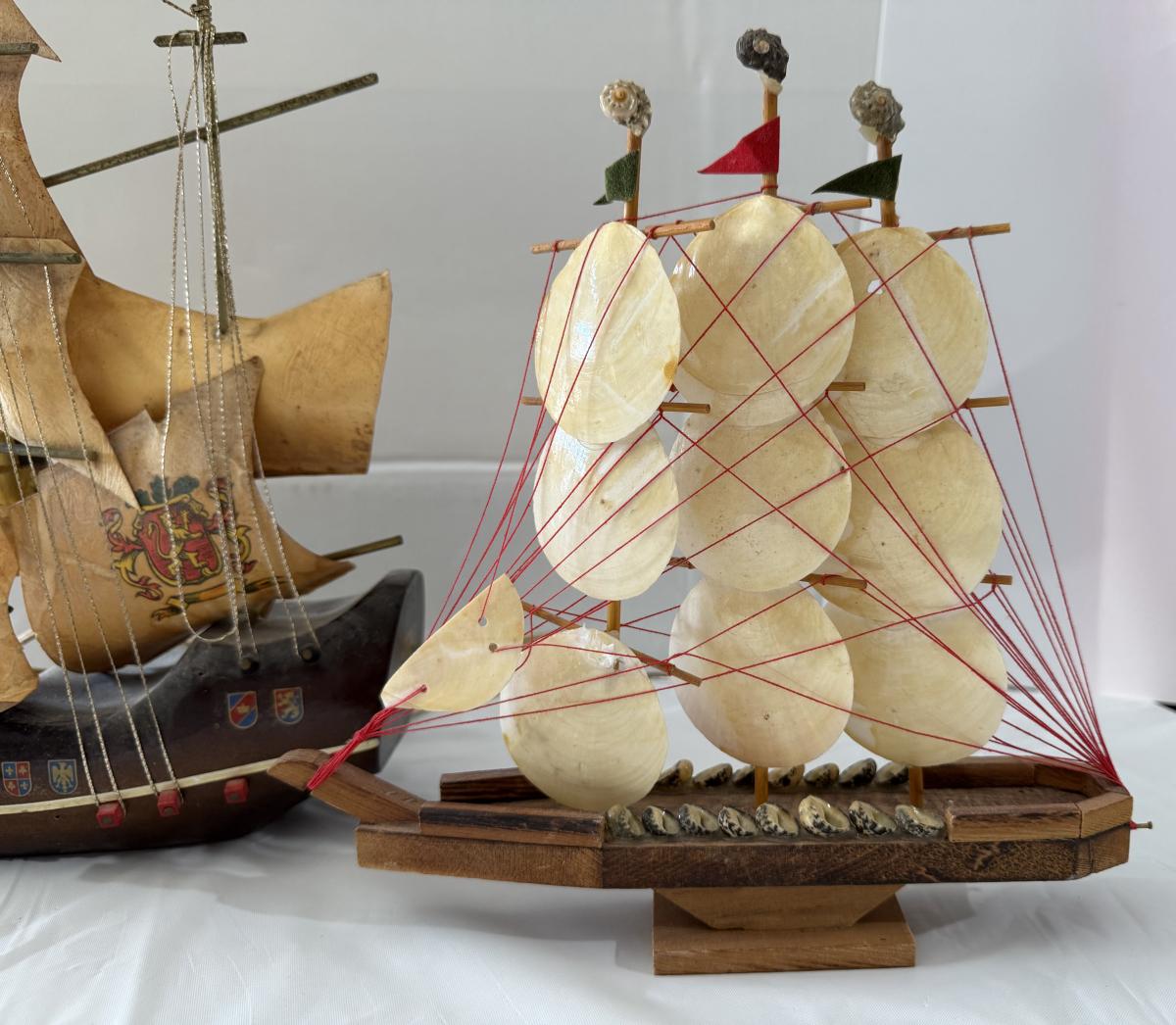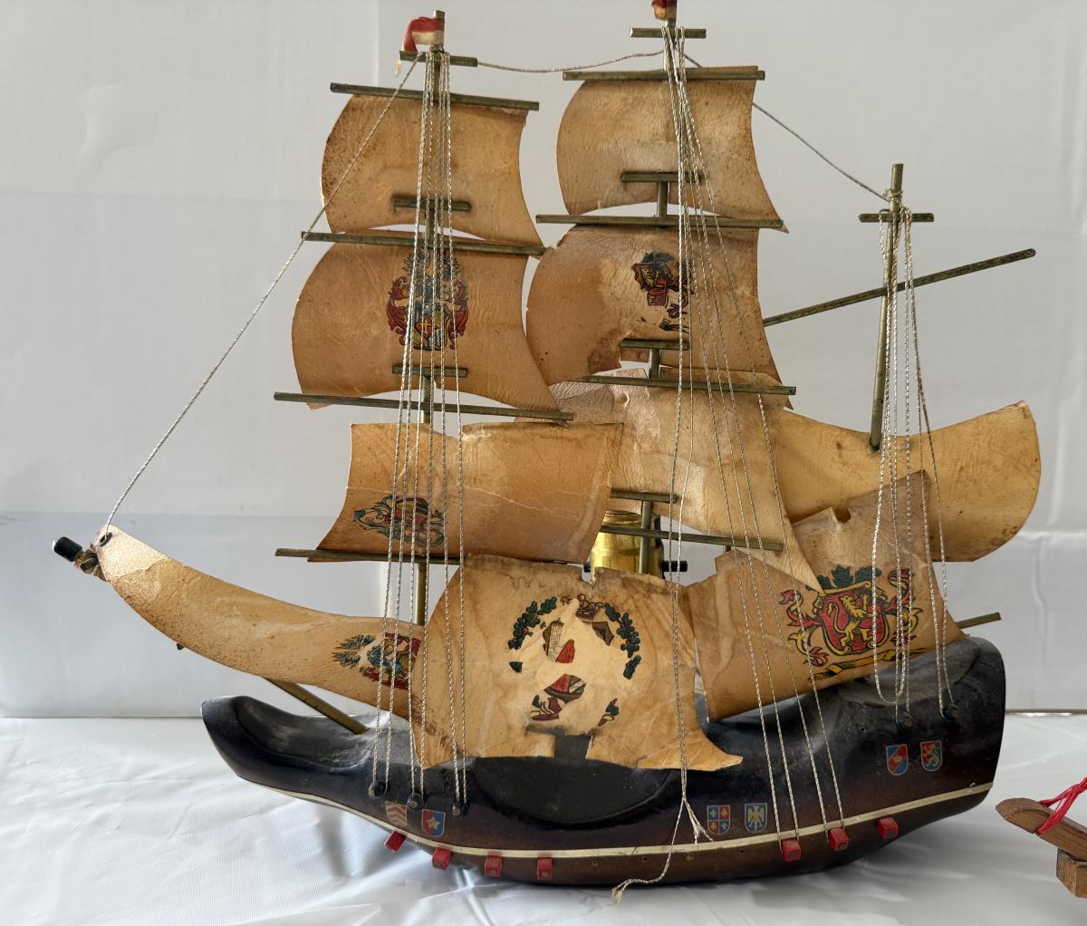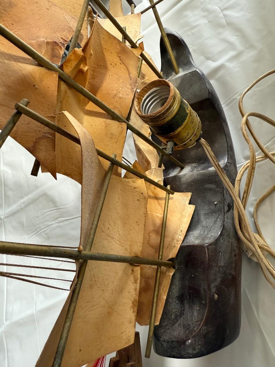 MCM Wooden Mayflower ship lamp, sailboat crafted w/genuine horn
