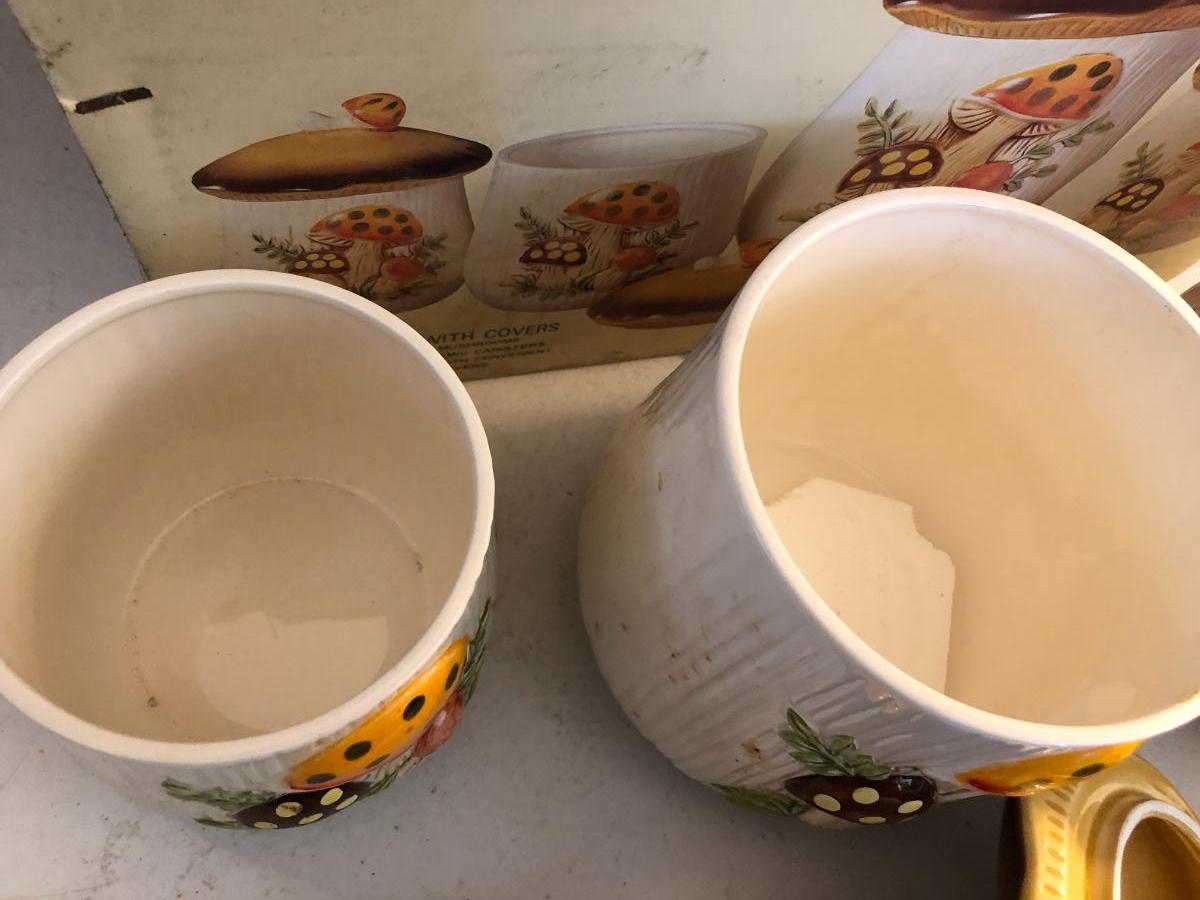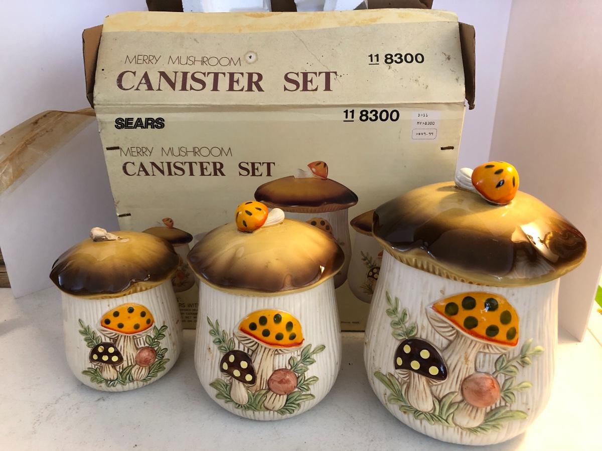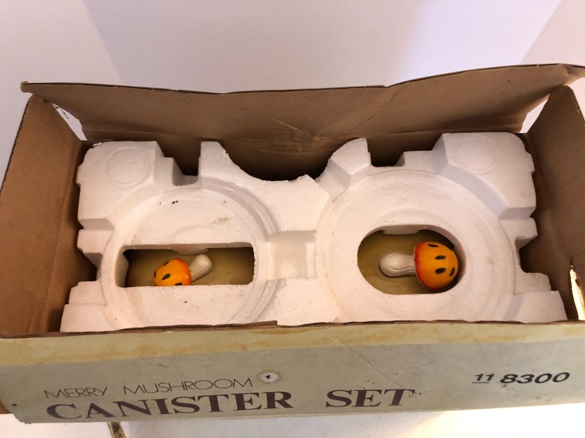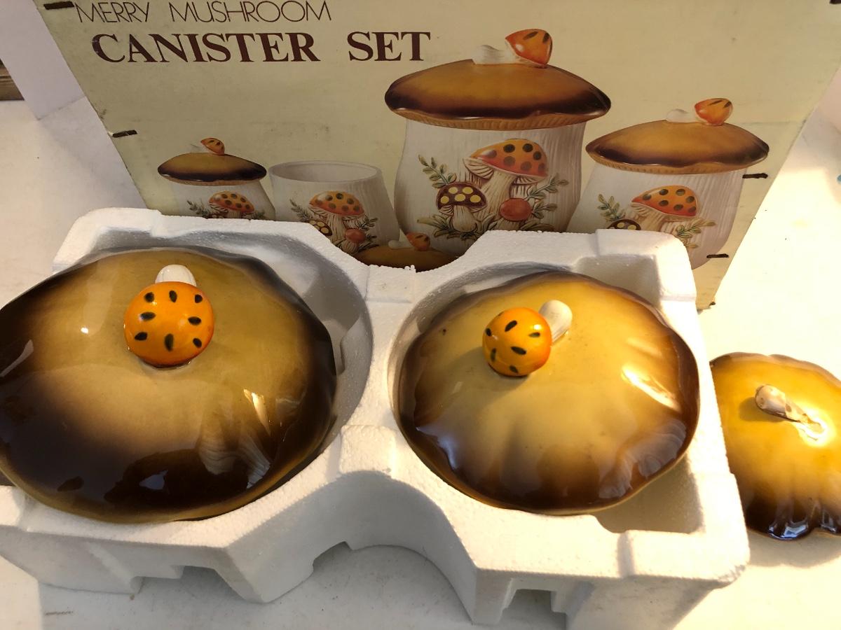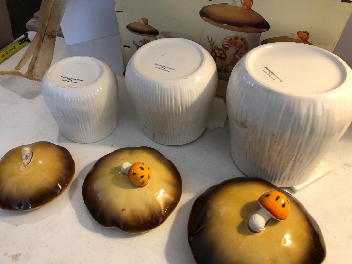 MCM-Three Merry Mushroom Canisters: Small lid Mushroom Broken