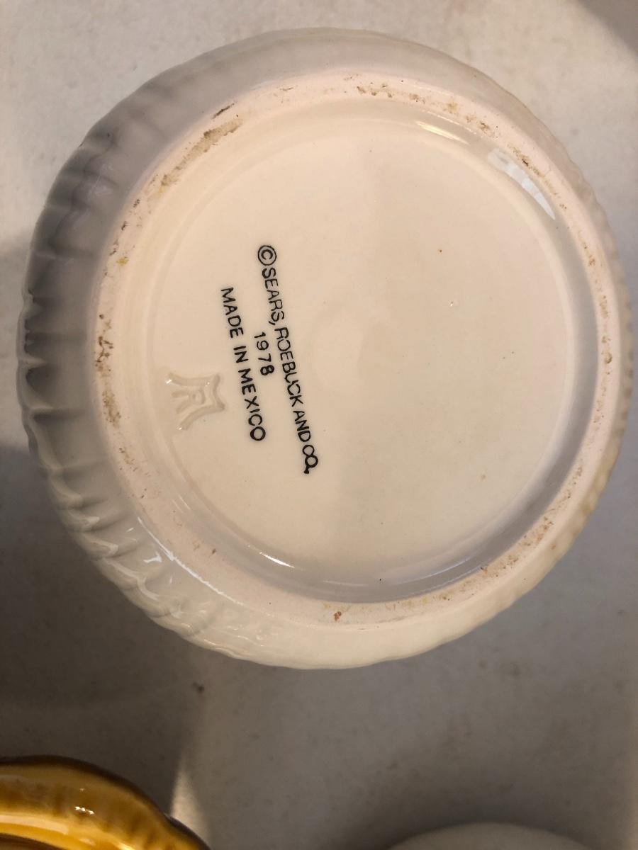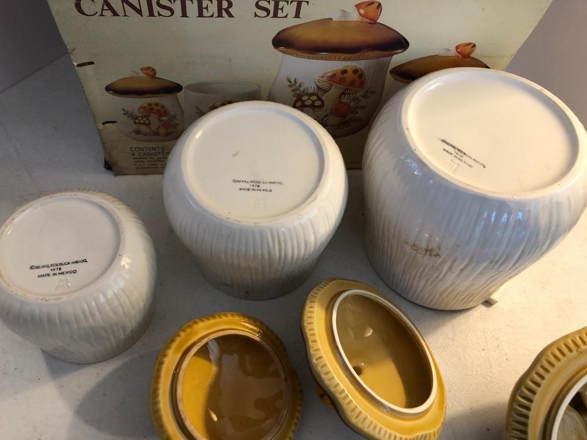 All items are sold as is, as found in the estate. Please see all photos for content, measurements and condition. Three (3) Canisters with two lids. The mushroom on the top of the third smaller lid is broken (as shown in the photos). Need to be cleaned.