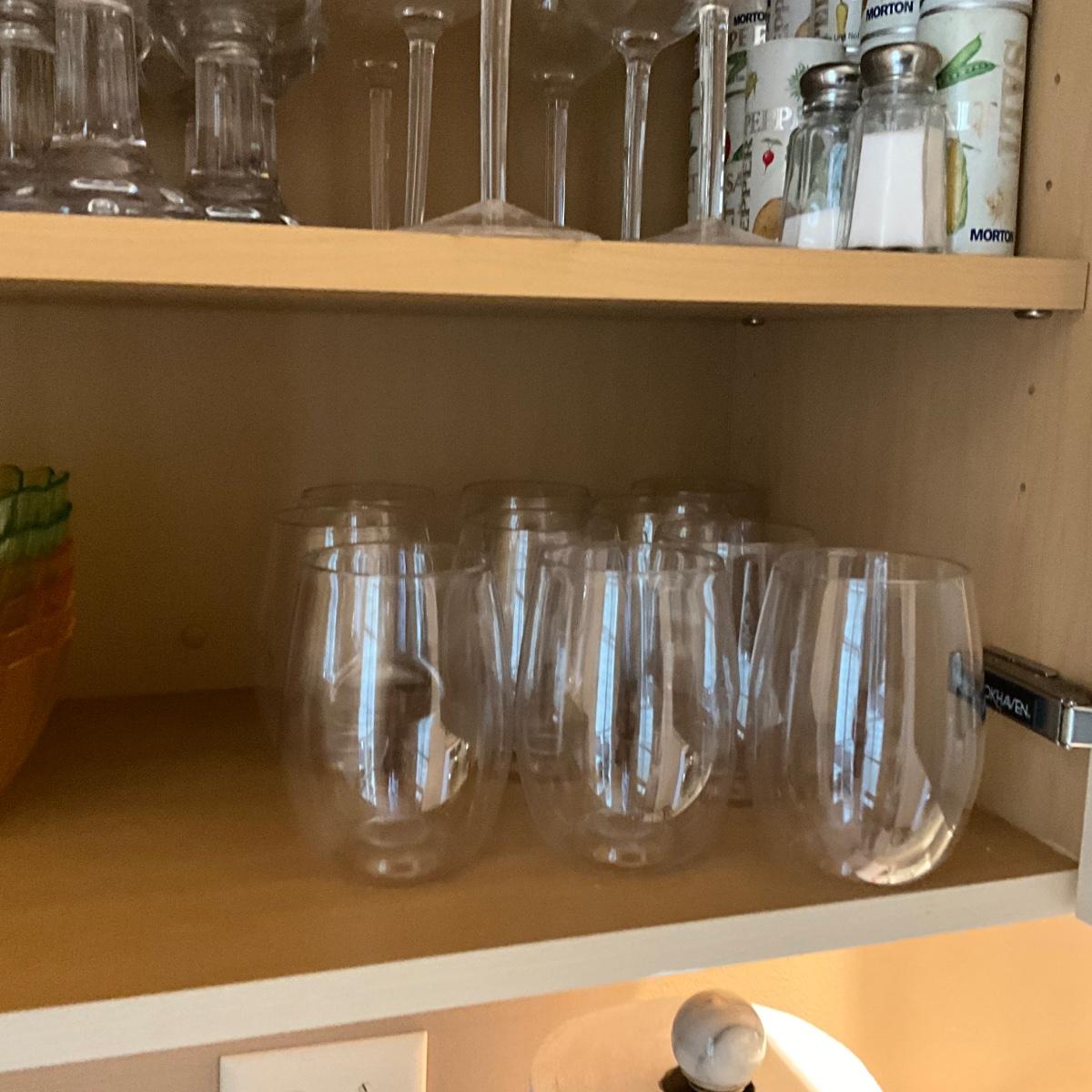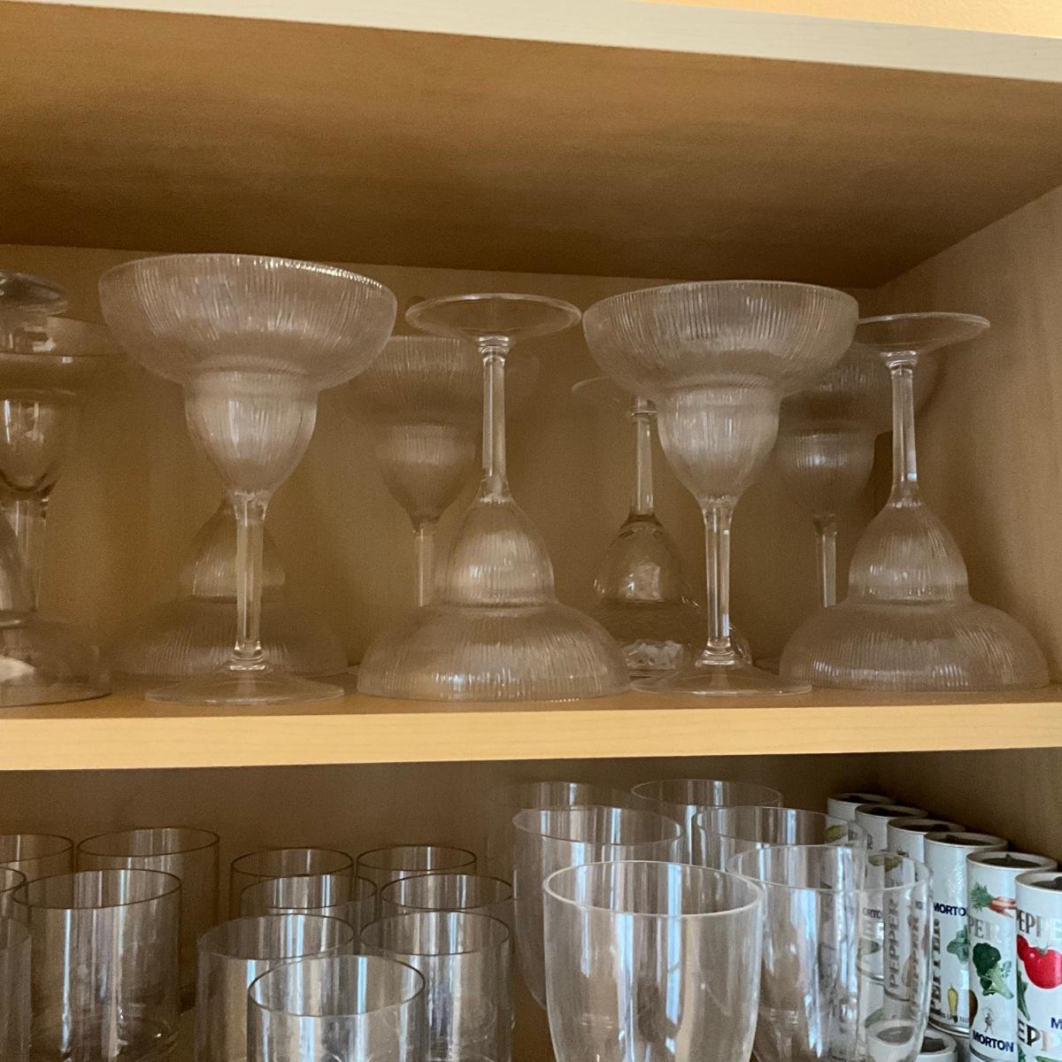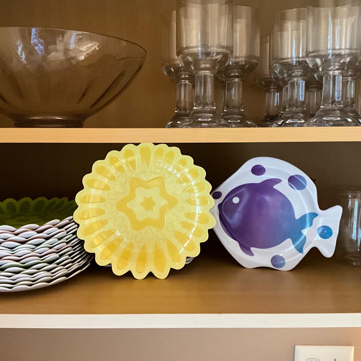 Several Marghrita Drinkware, Plastic Wine Goblets, large bowl, several multi colored flower plates and fish plates, bowls, and more