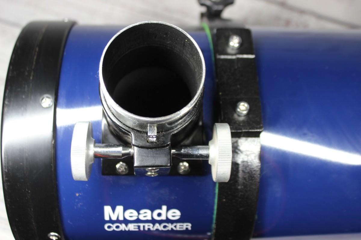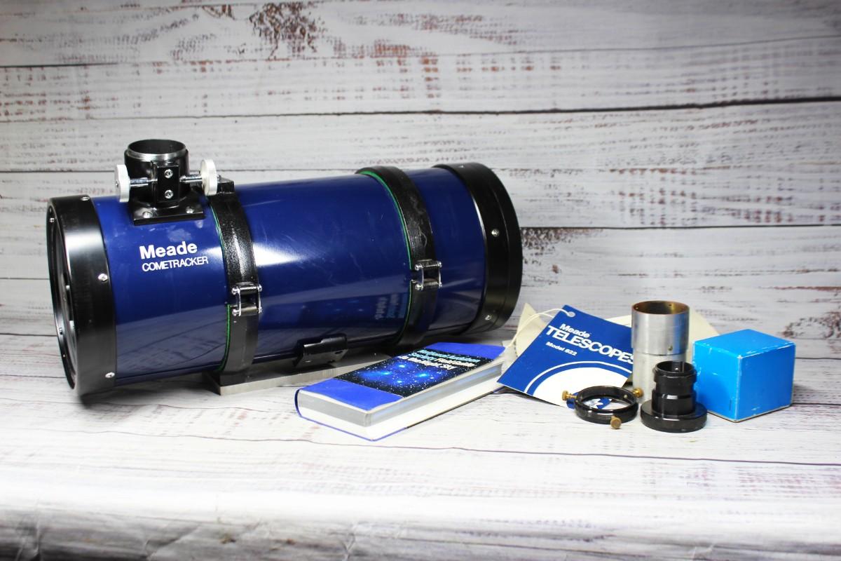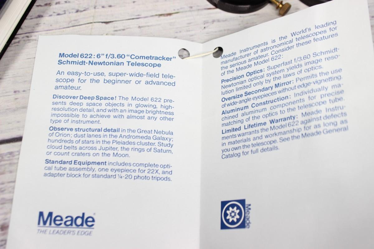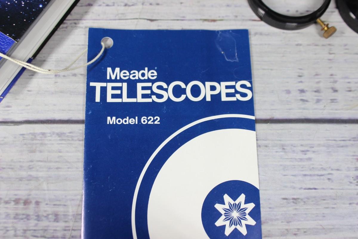 Meade Telescope Model 622 Cometracker, there are no significant dents or cracks to the body or the glass of the telescope and is in fair condition. Everything that is included in the box has been laid out like the field guide to the night sky pocket book and various accessories/parts that come with the telescope. Check pictures for more details and for sizing.