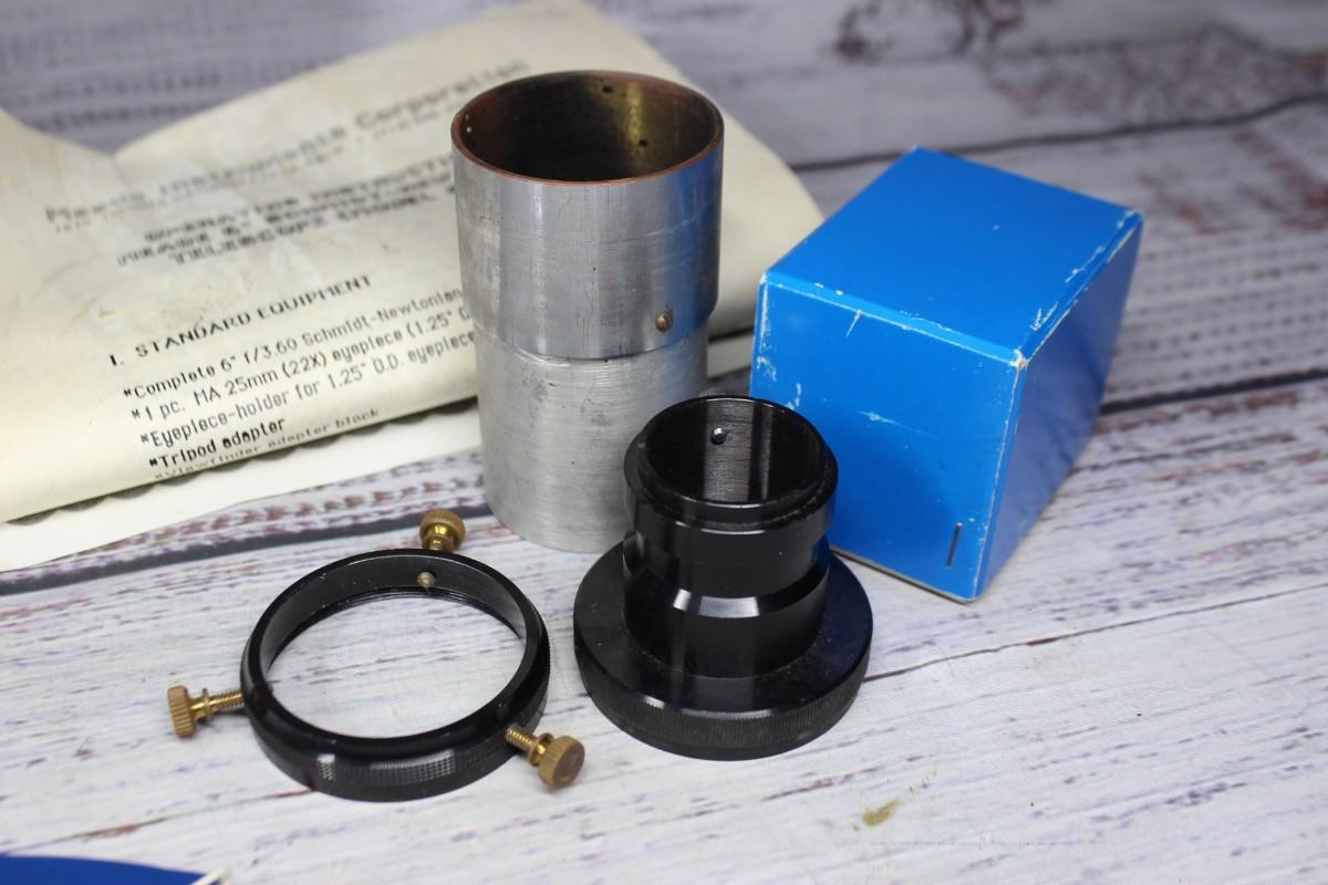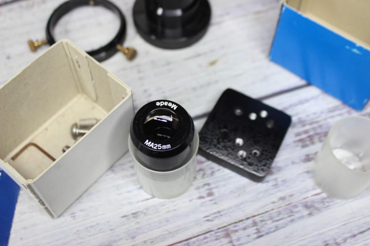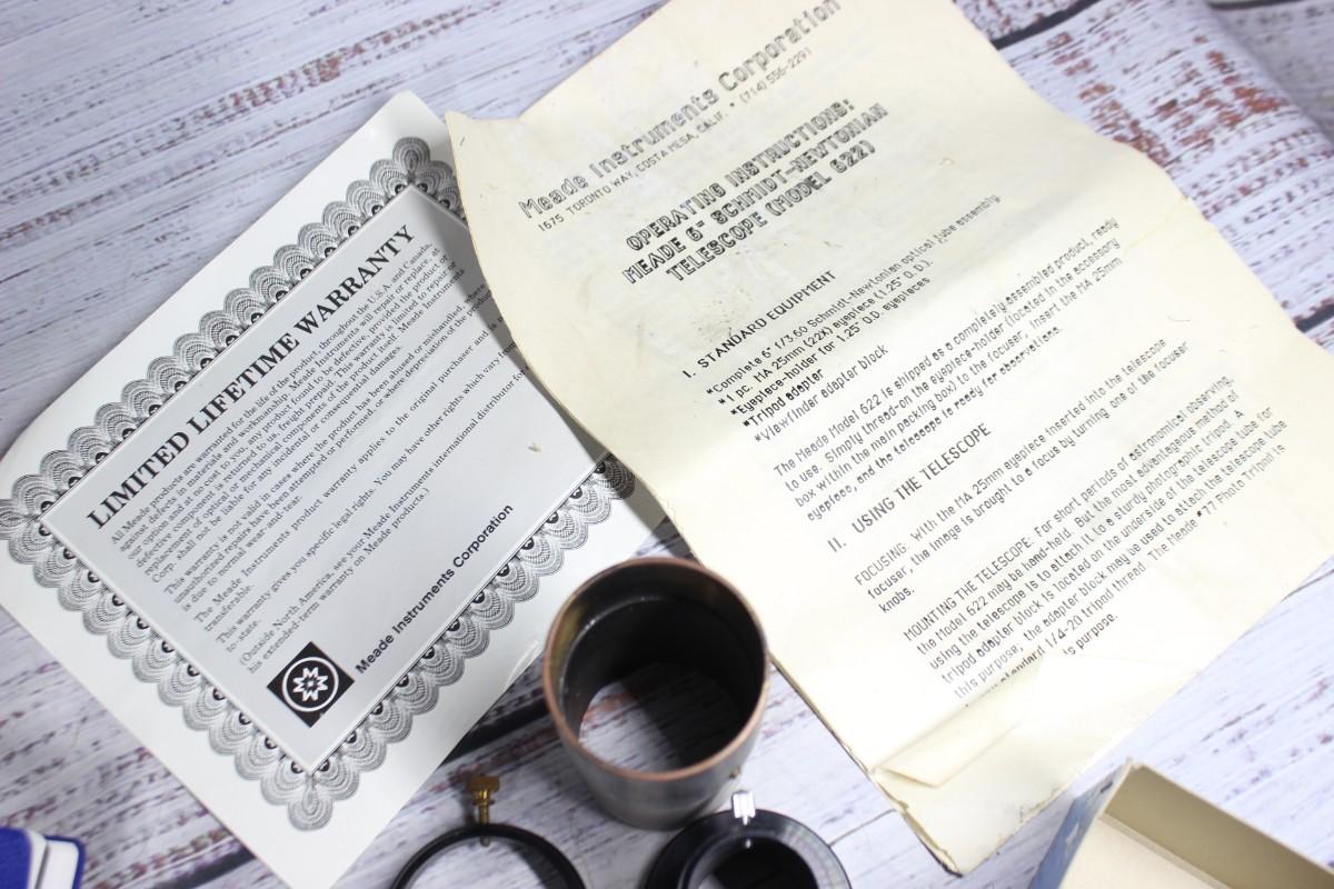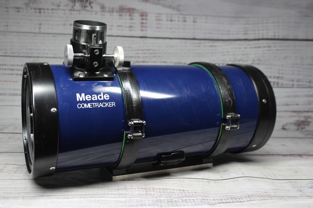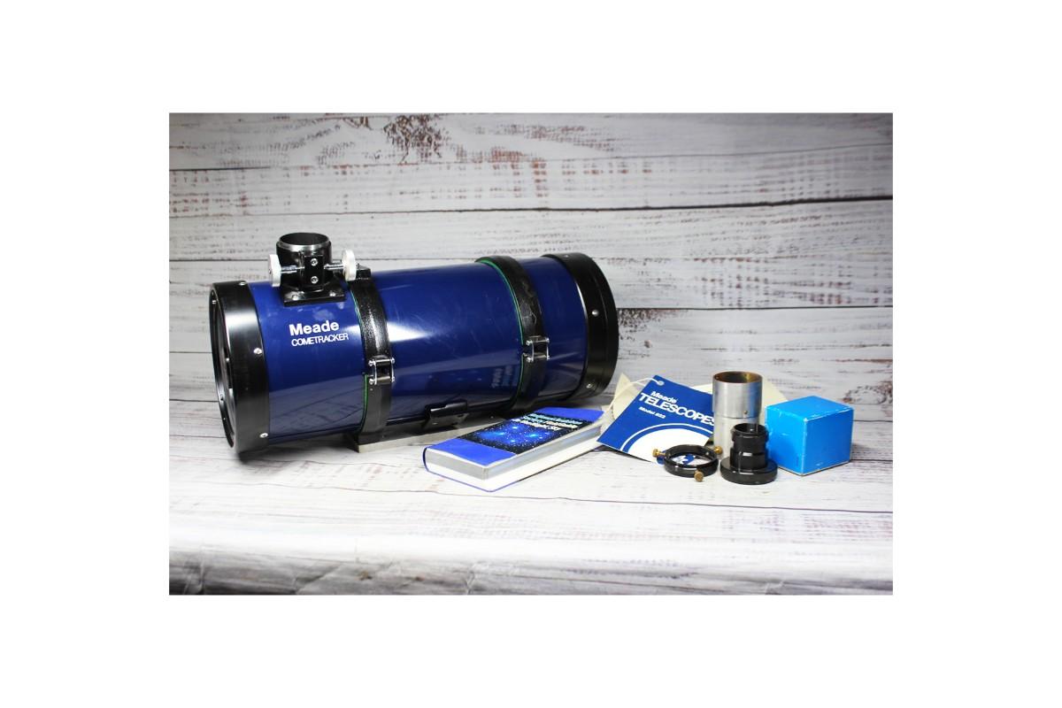 Meade Telescope Model 622 Cometracker, there are no significant dents or cracks to the body or the glass of the telescope and is in fair condition. Everything that is included in the box has been laid out like the field guide to the night sky pocket book and various accessories/parts that come with the telescope. Check pictures for more details and for sizing.