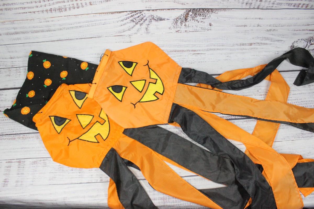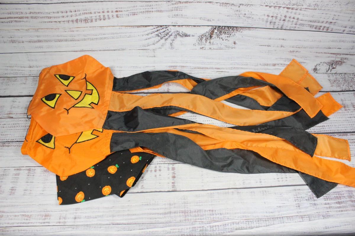 Pair of Pumpkin Outdoor Hangable Cloth Lantern Decoration, also comes with a pumpkin table cloth. There's no rips or tears to any of the pieces and is in good condition. Check pictures for more details and for sizing.