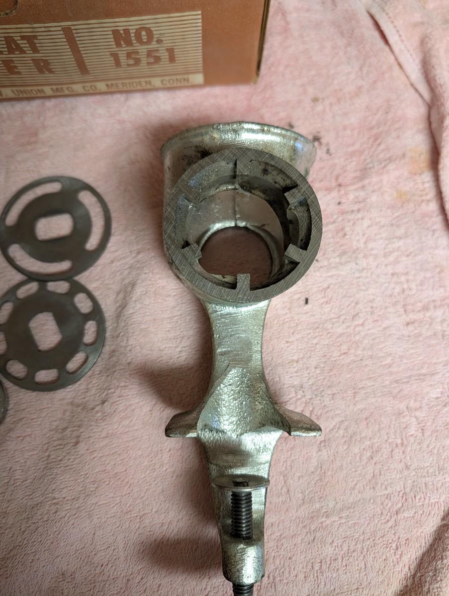 Meat and food chopper with long handle with different accessories. Made in the USA.
