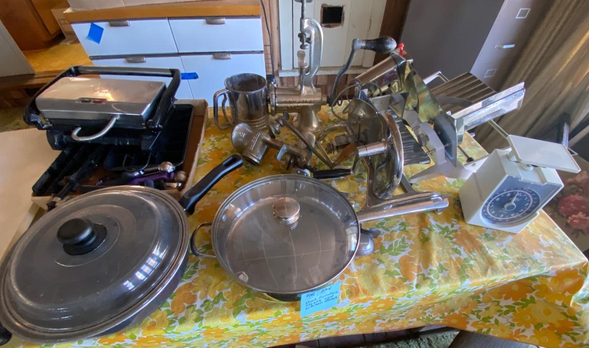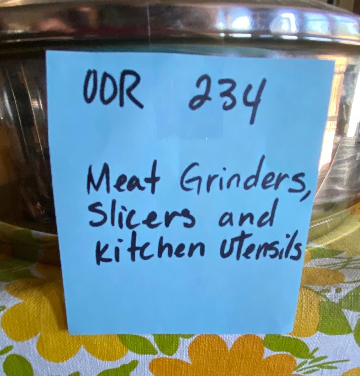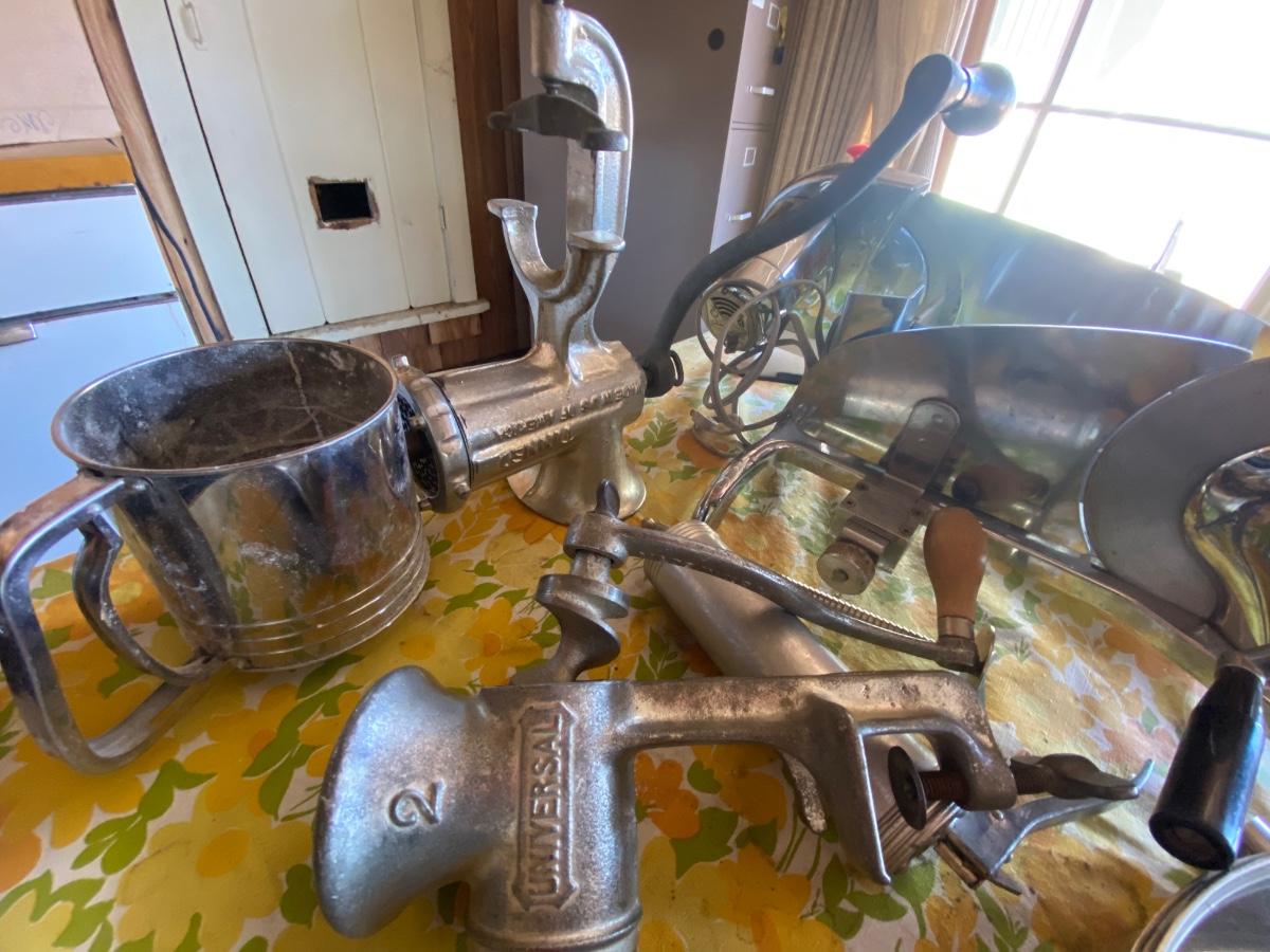 Meat grinder, slicer and kitchen utensils.