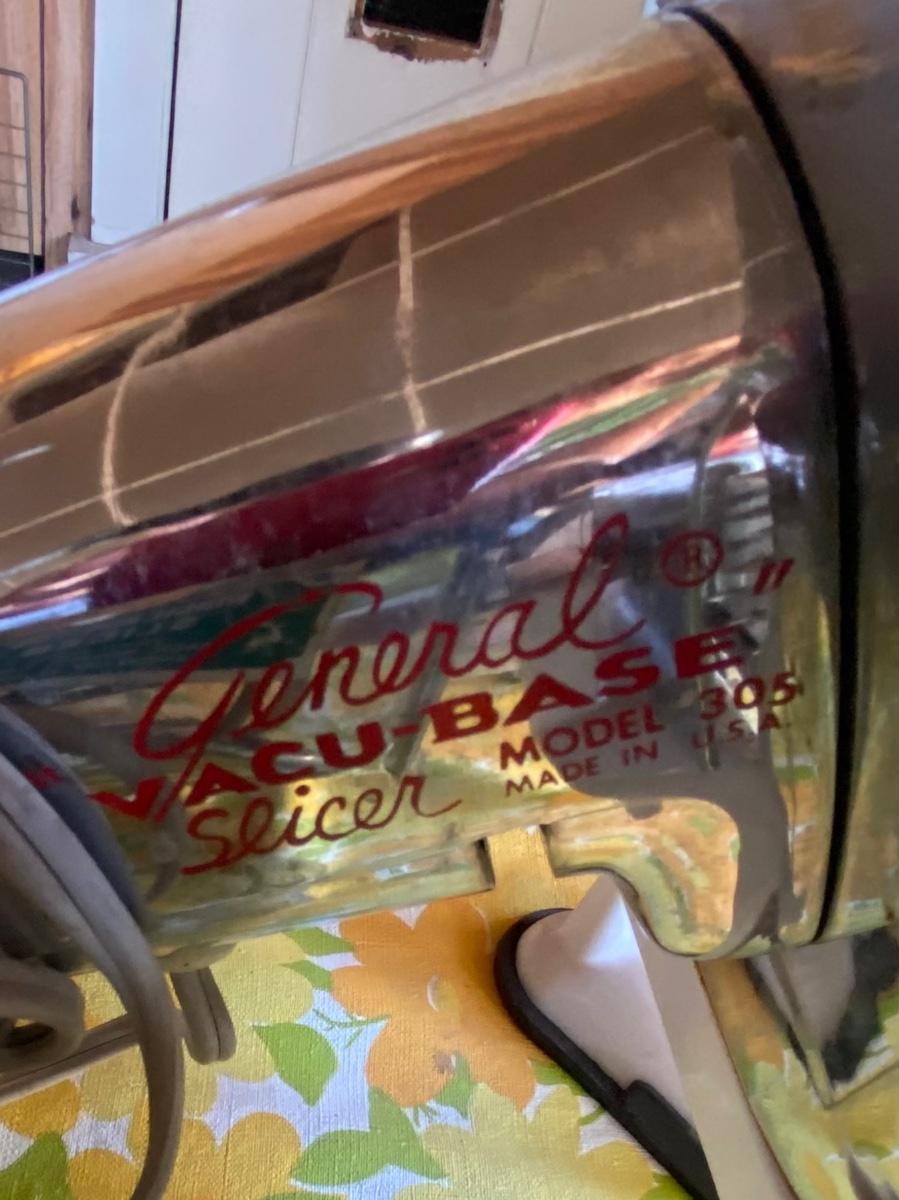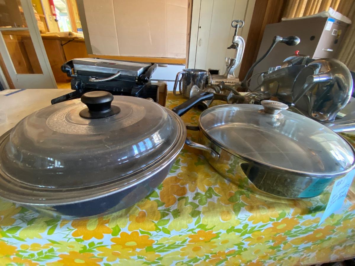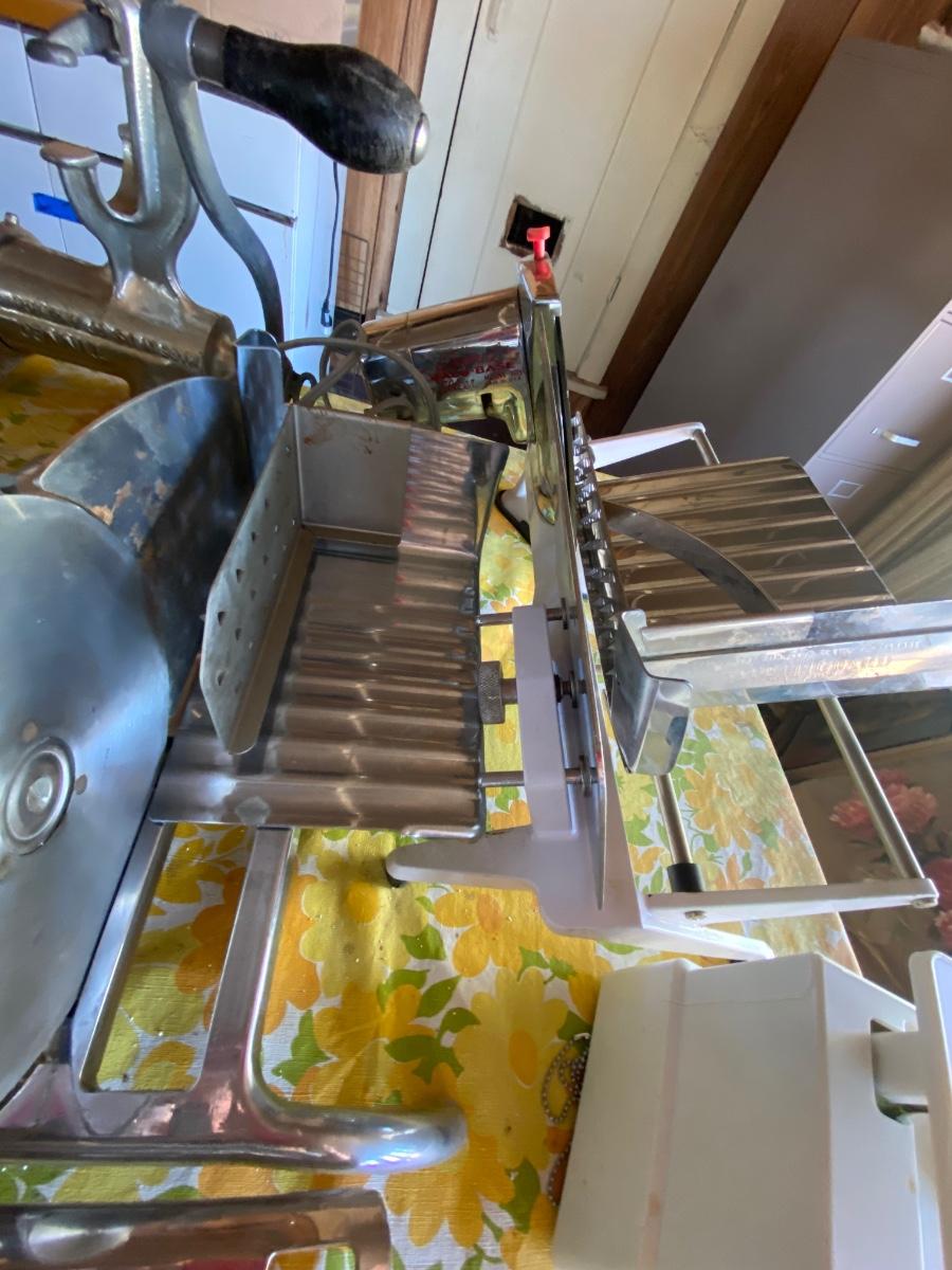 Meat grinder, slicer and kitchen utensils.
