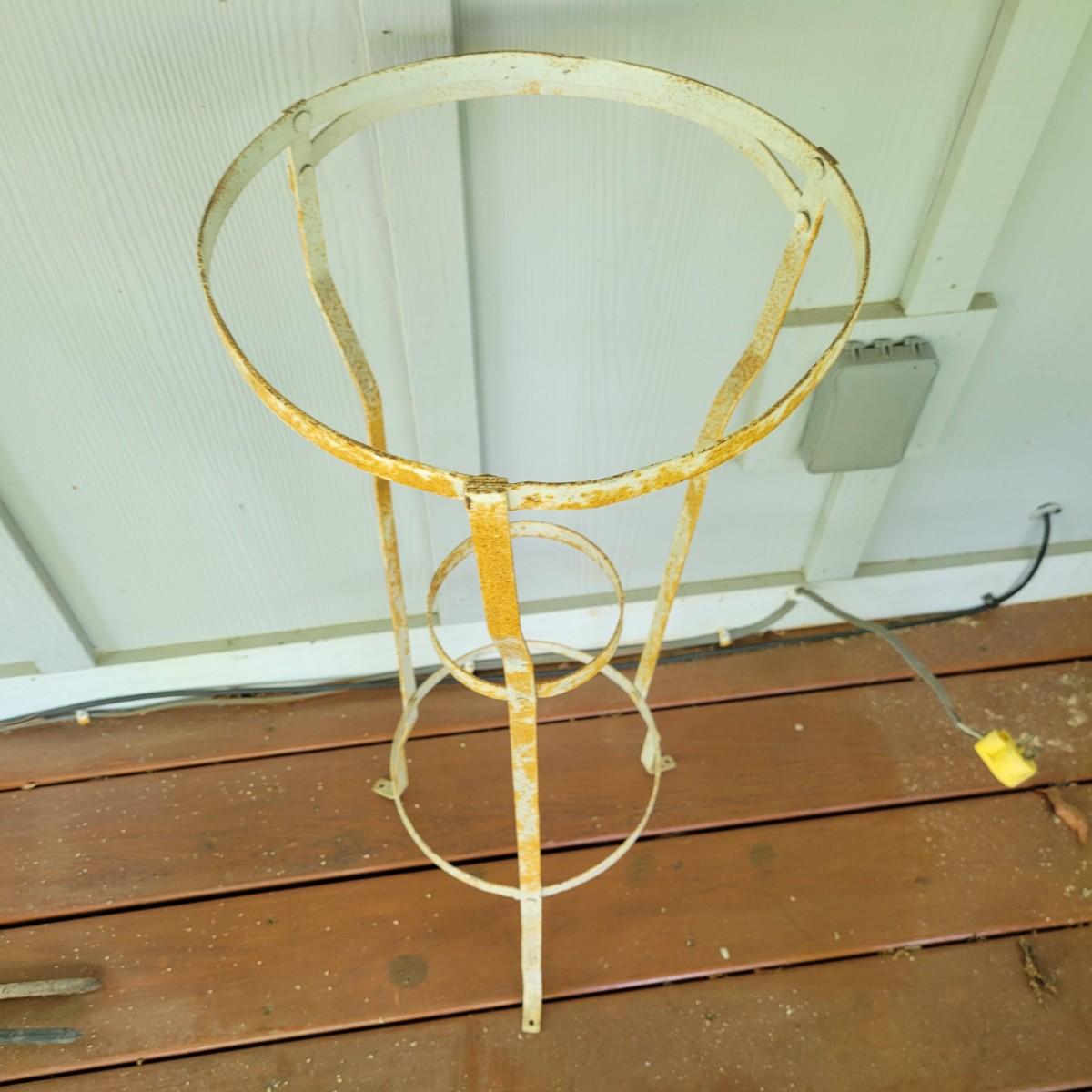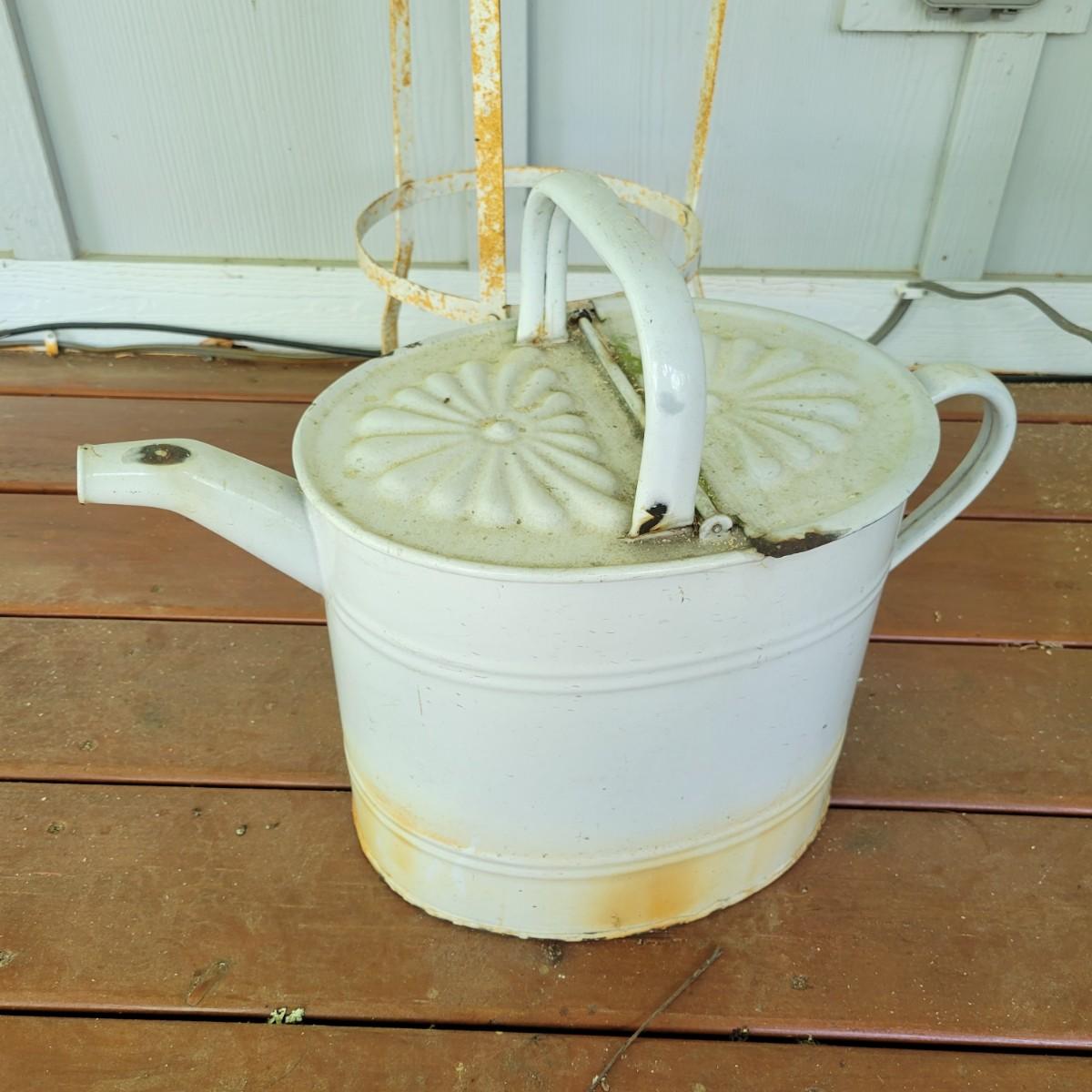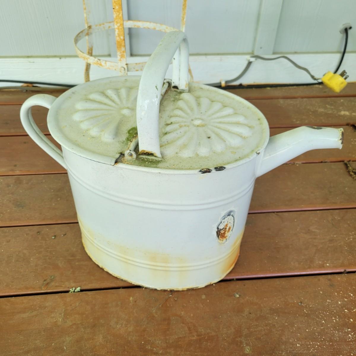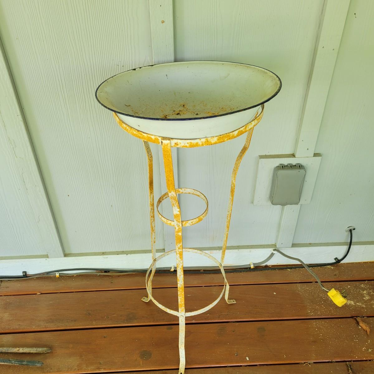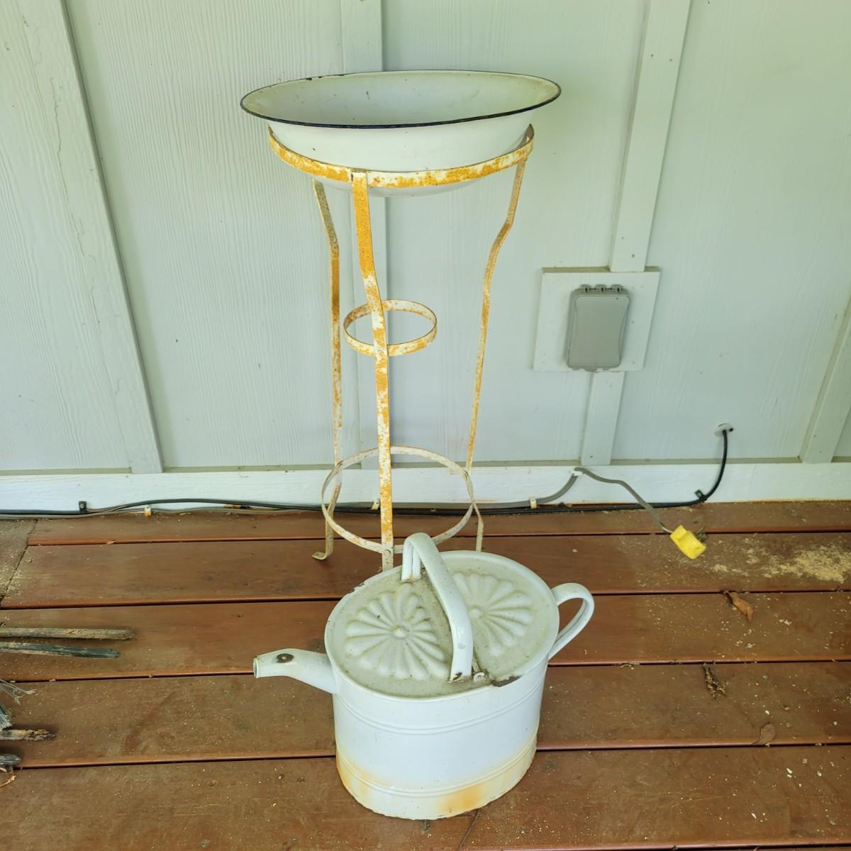 A metal wash basin stand that is painted white and showing rust. It comes with a metal enameled basin. Also includes a metal enameled watering can. The basin and stand measure approximately 14"D x 32"H. Local pickup only