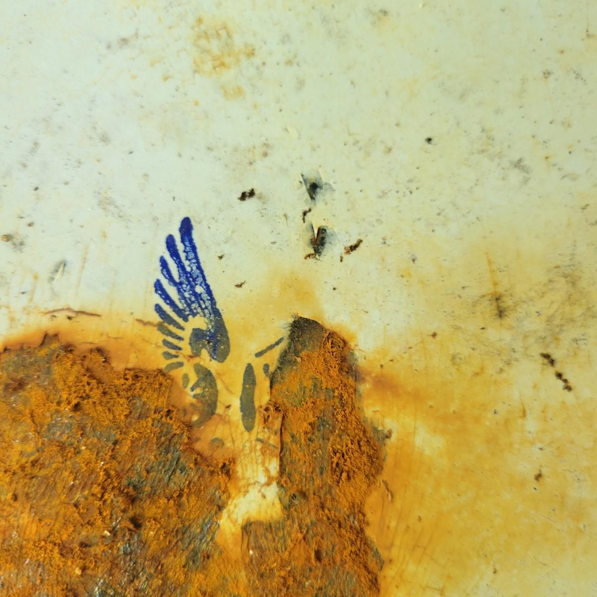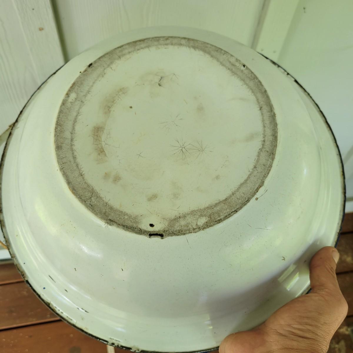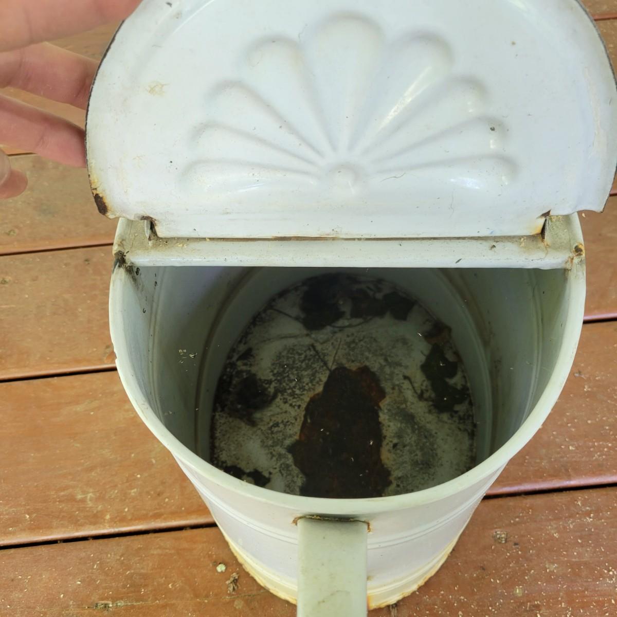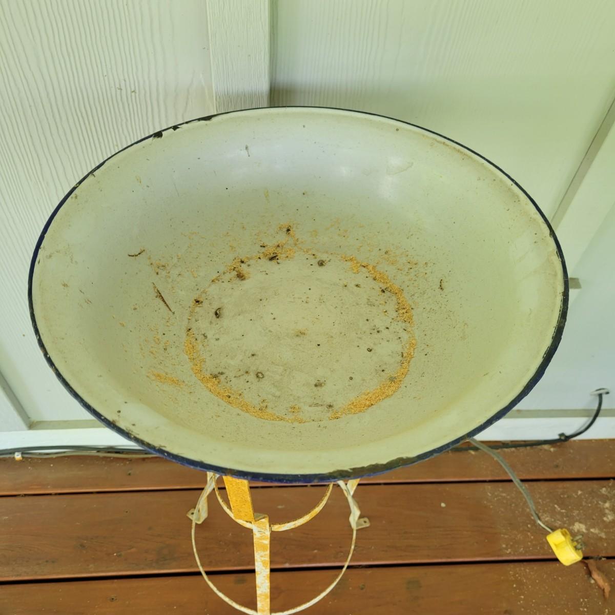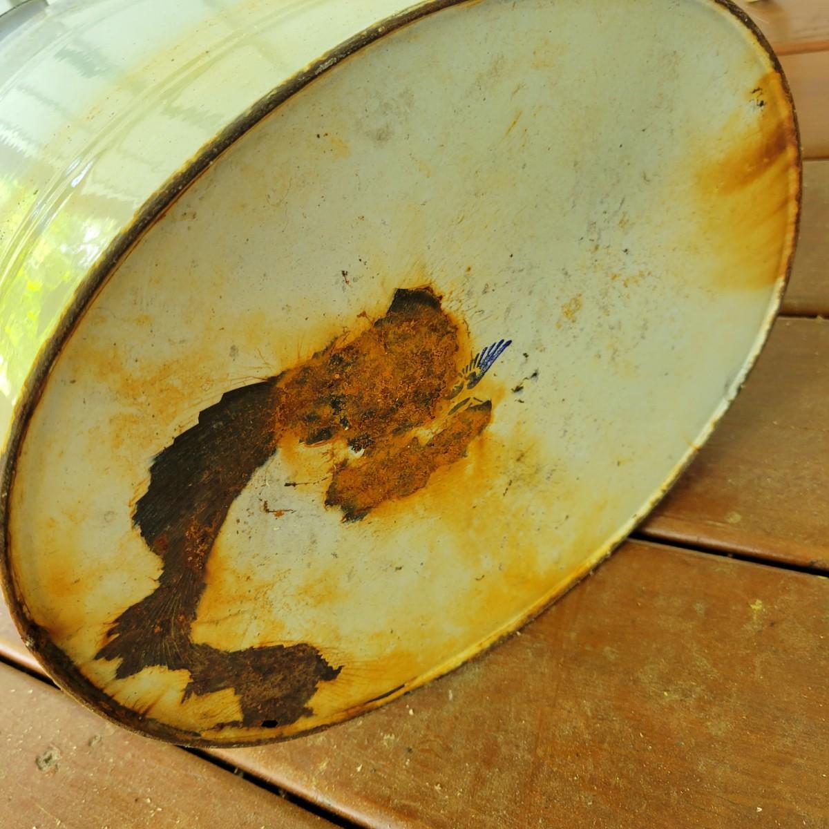 A metal wash basin stand that is painted white and showing rust. It comes with a metal enameled basin. Also includes a metal enameled watering can. The basin and stand measure approximately 14"D x 32"H. Local pickup only