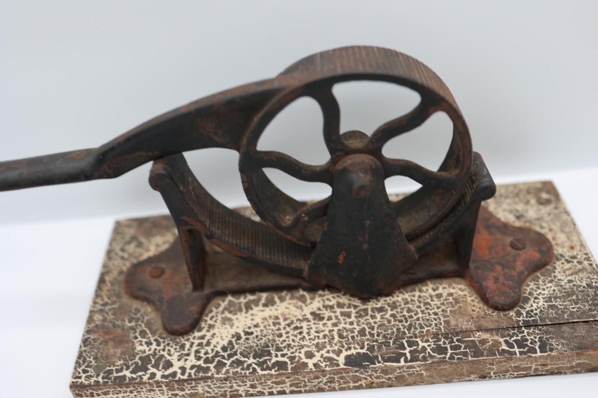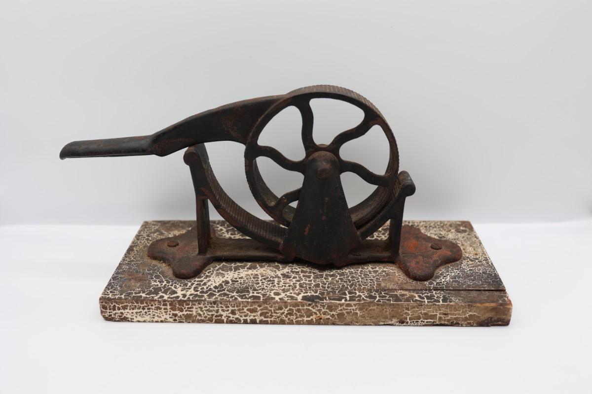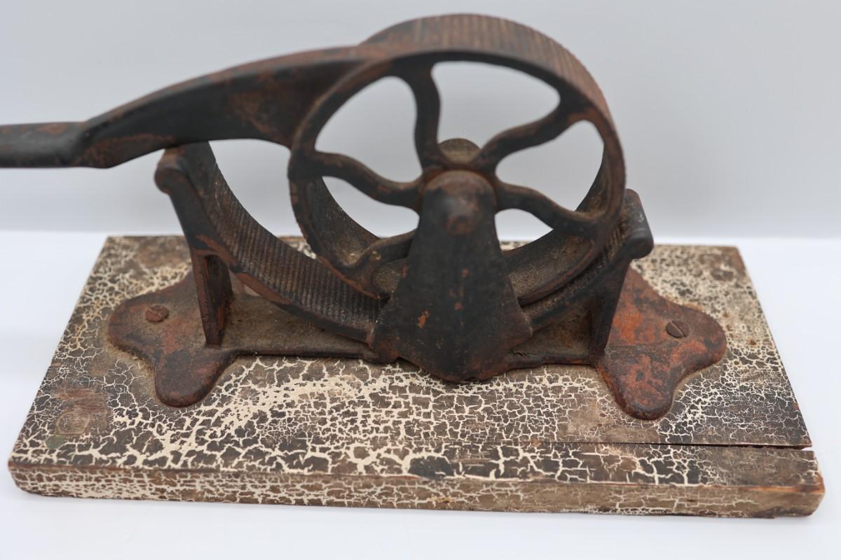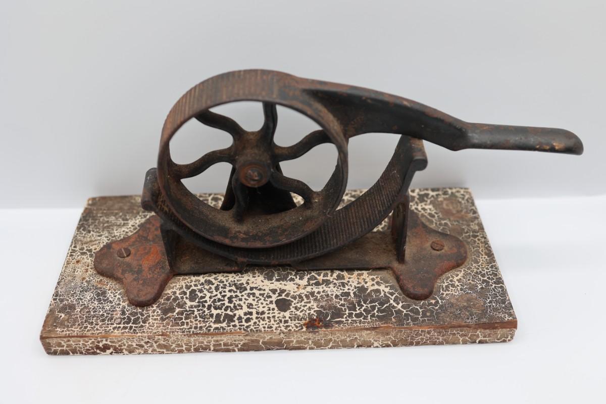 Mechanical Cast Iron Cork Press Tool Mounted on Wooden Plank