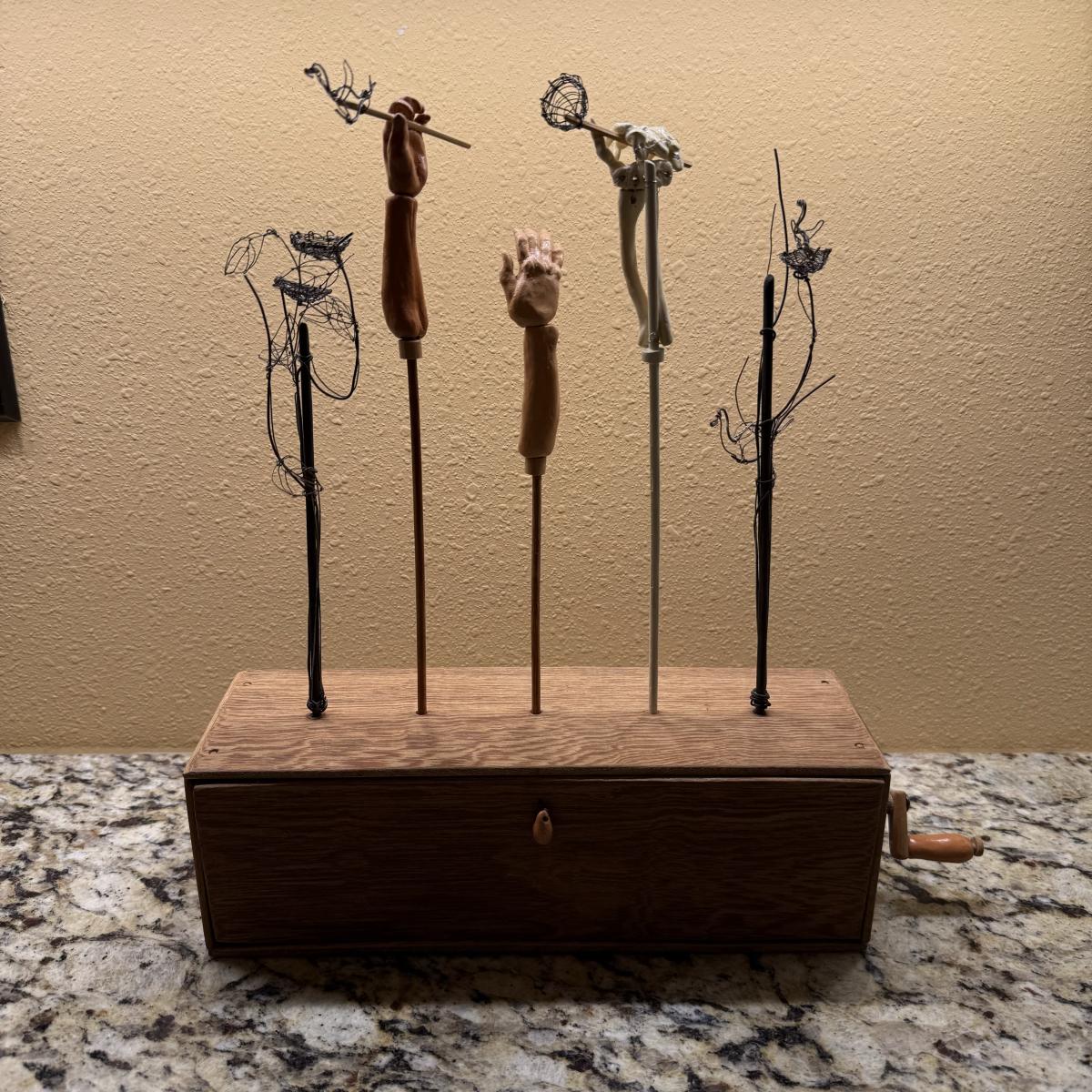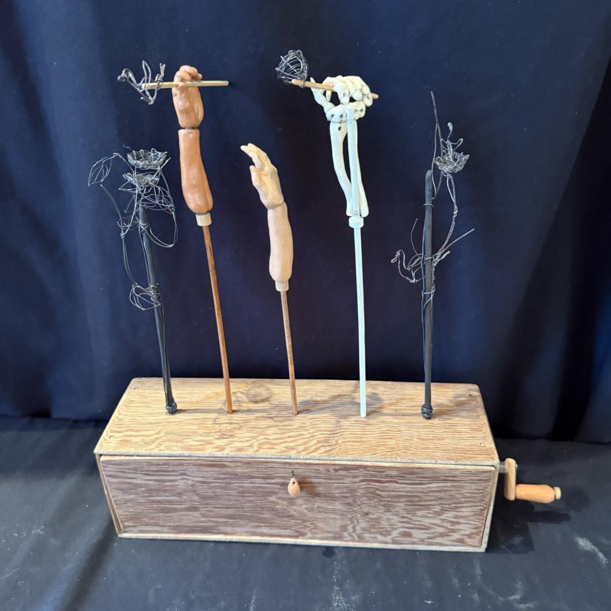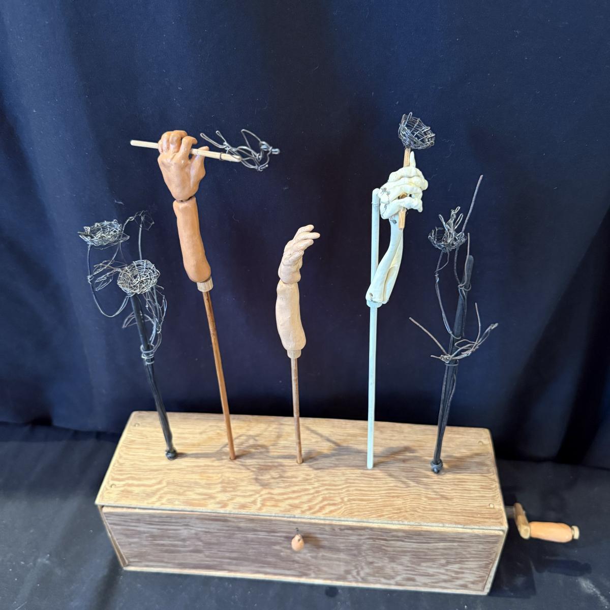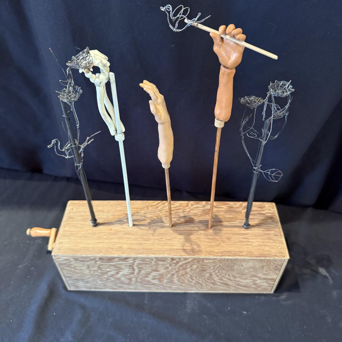 A very unusual mixed media mechanical sculpture comprised of hands and wire figures, mounted over a box, and attached to a gear-like mechanism inside the box that makes all of the pieces turn when cranked (on the side). The sculpture is signed ‘Janet Brome’.