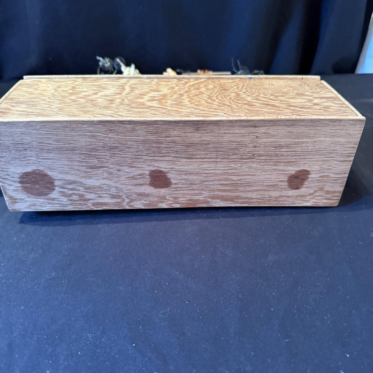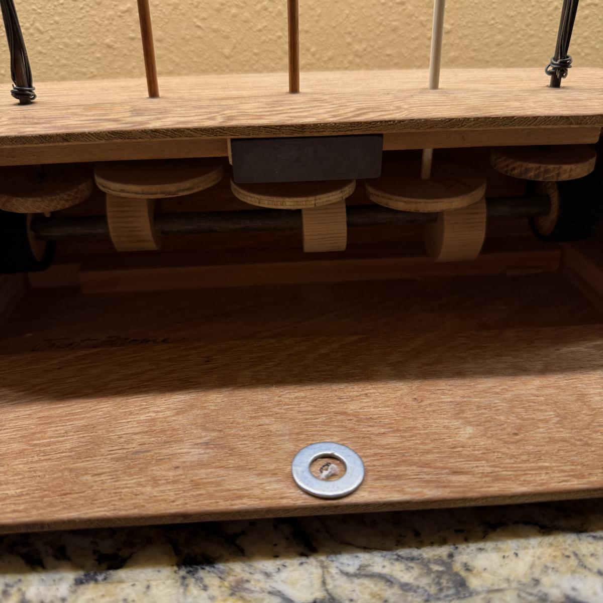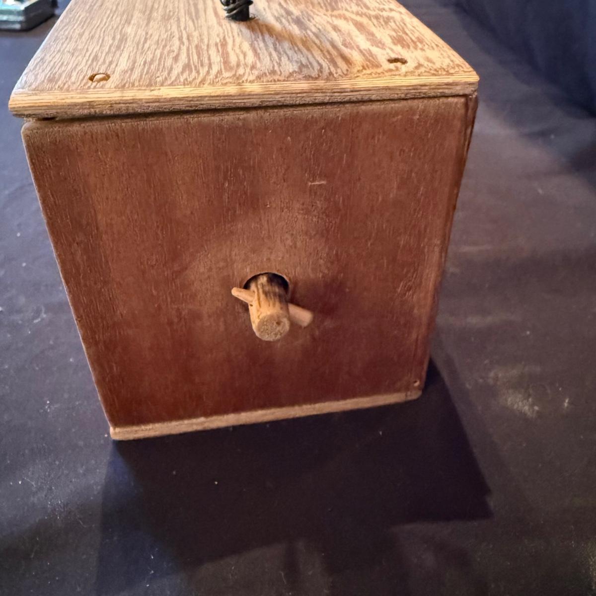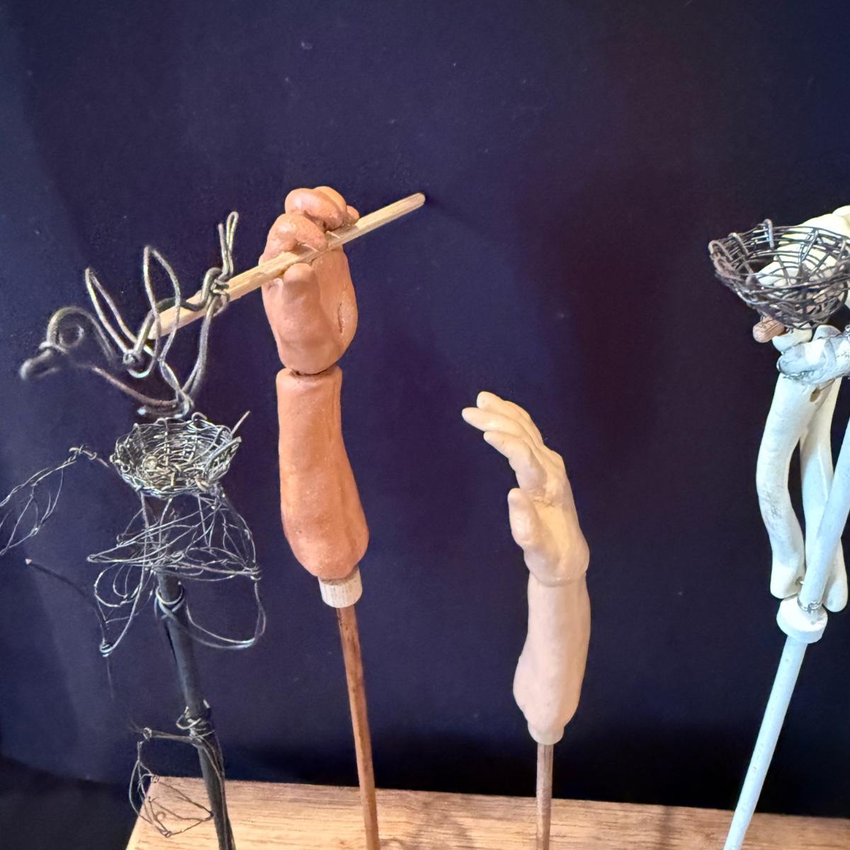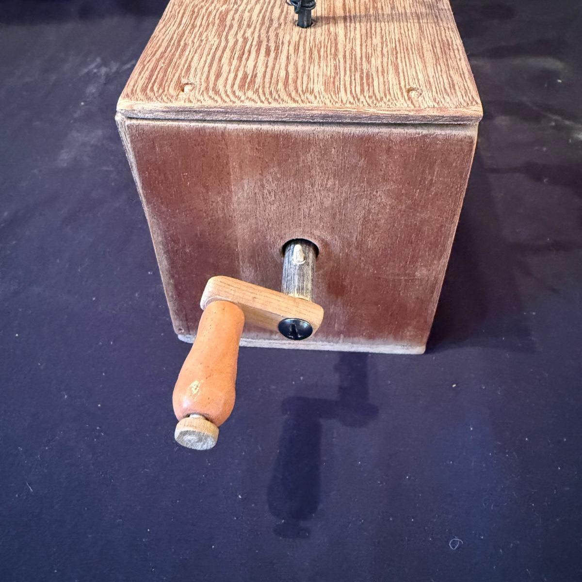A very unusual mixed media mechanical sculpture comprised of hands and wire figures, mounted over a box, and attached to a gear-like mechanism inside the box that makes all of the pieces turn when cranked (on the side). The sculpture is signed ‘Janet Brome’.