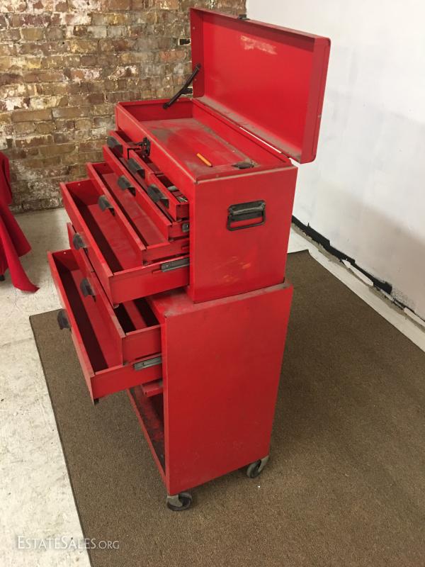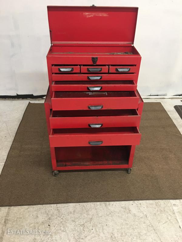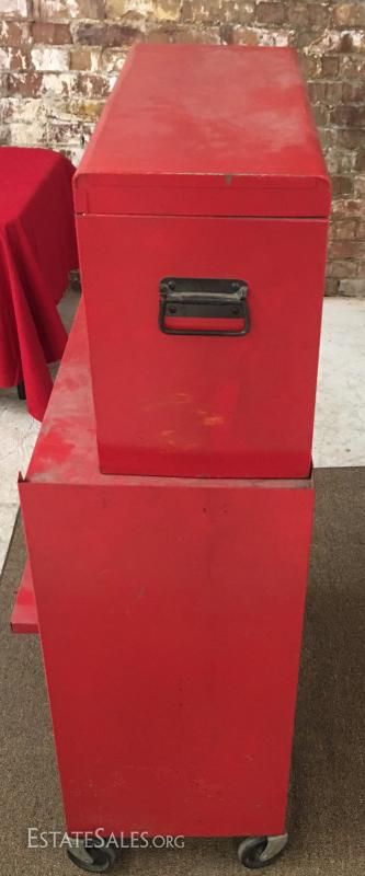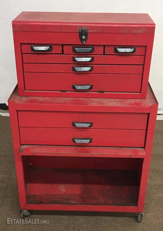 Vintage tool chest and rolling cabinet. No key for lock, all the drawers open cabinet dimensions 26x1329, upper chest 23x9x14.