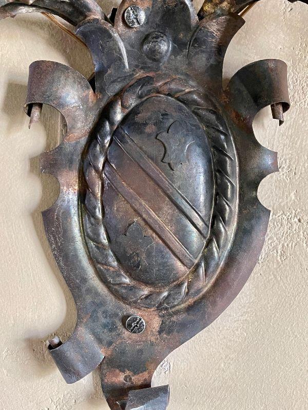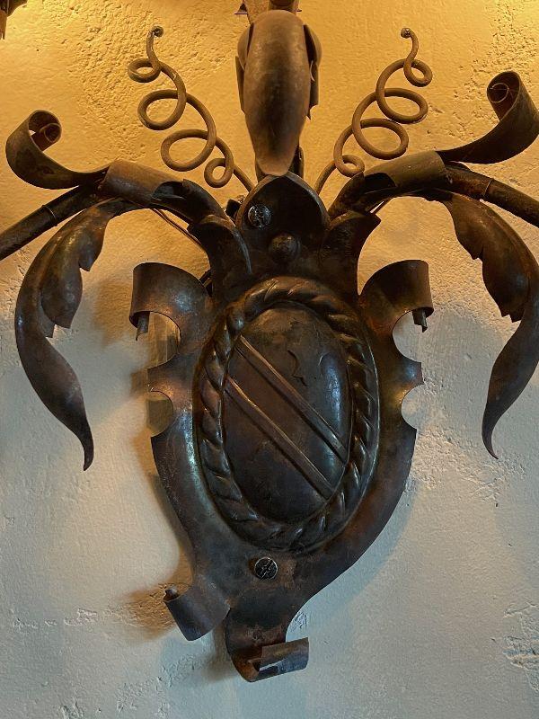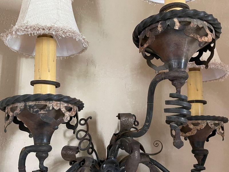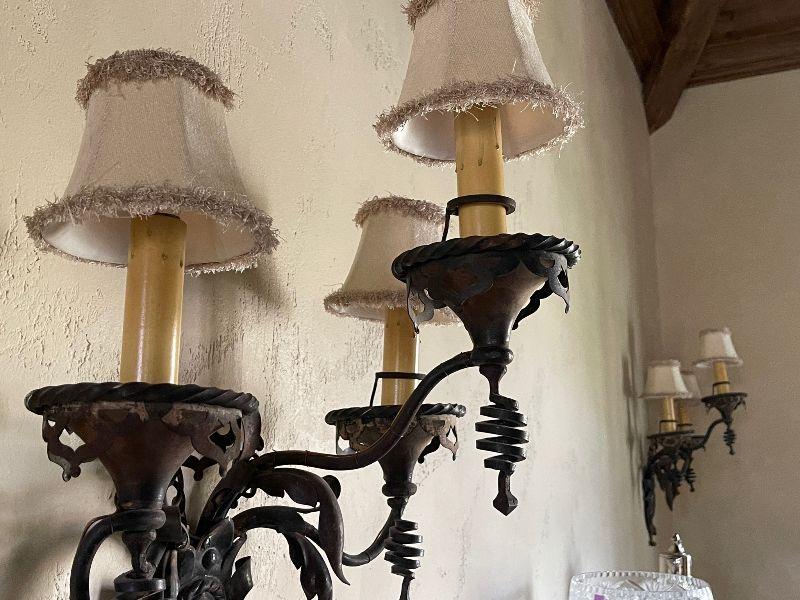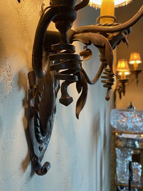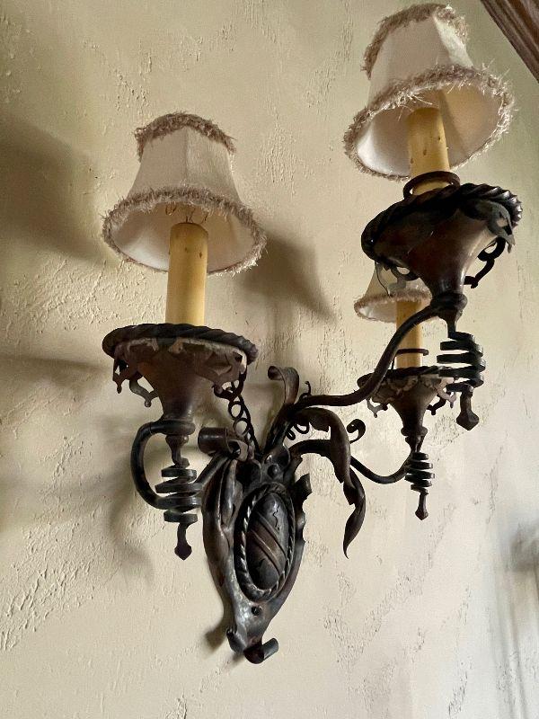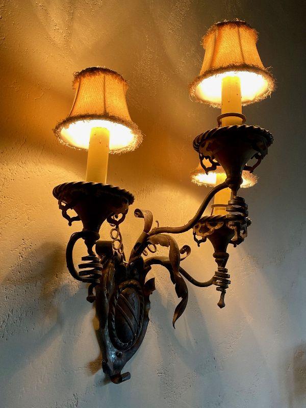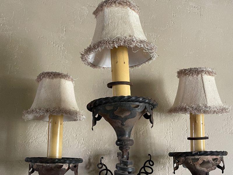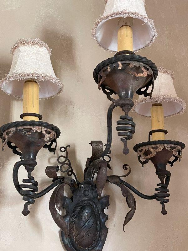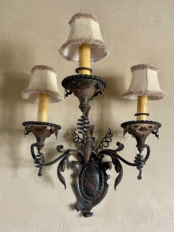 Pair of wonderfully fanciful and ornate wall sconces - each with 3 newer shade-mounted candle lights. Wired and ready to be installed. Metalwork shows it's age with a great patina and a bit of rust here and there, but is charming in it's rustic feel.