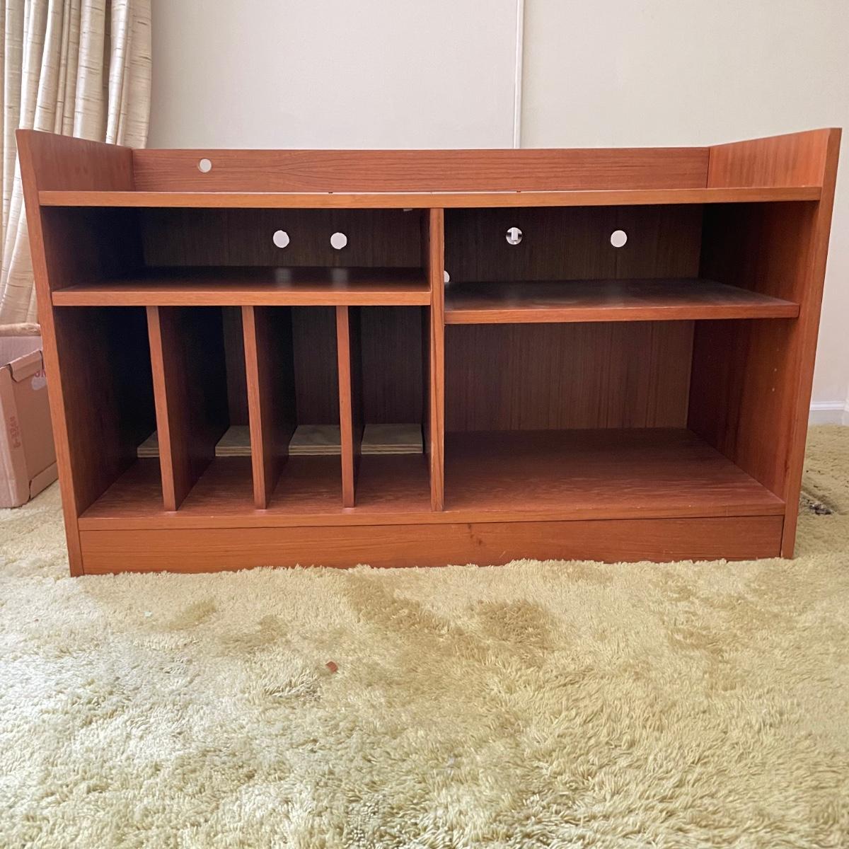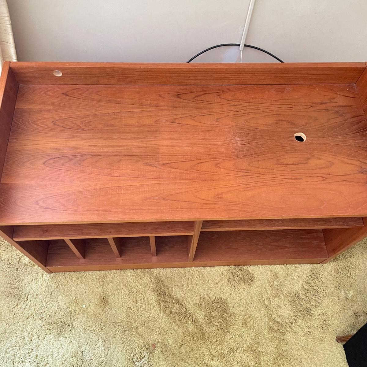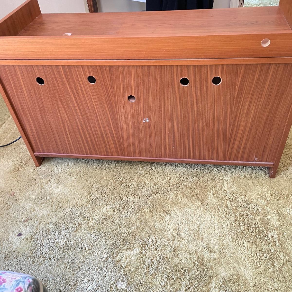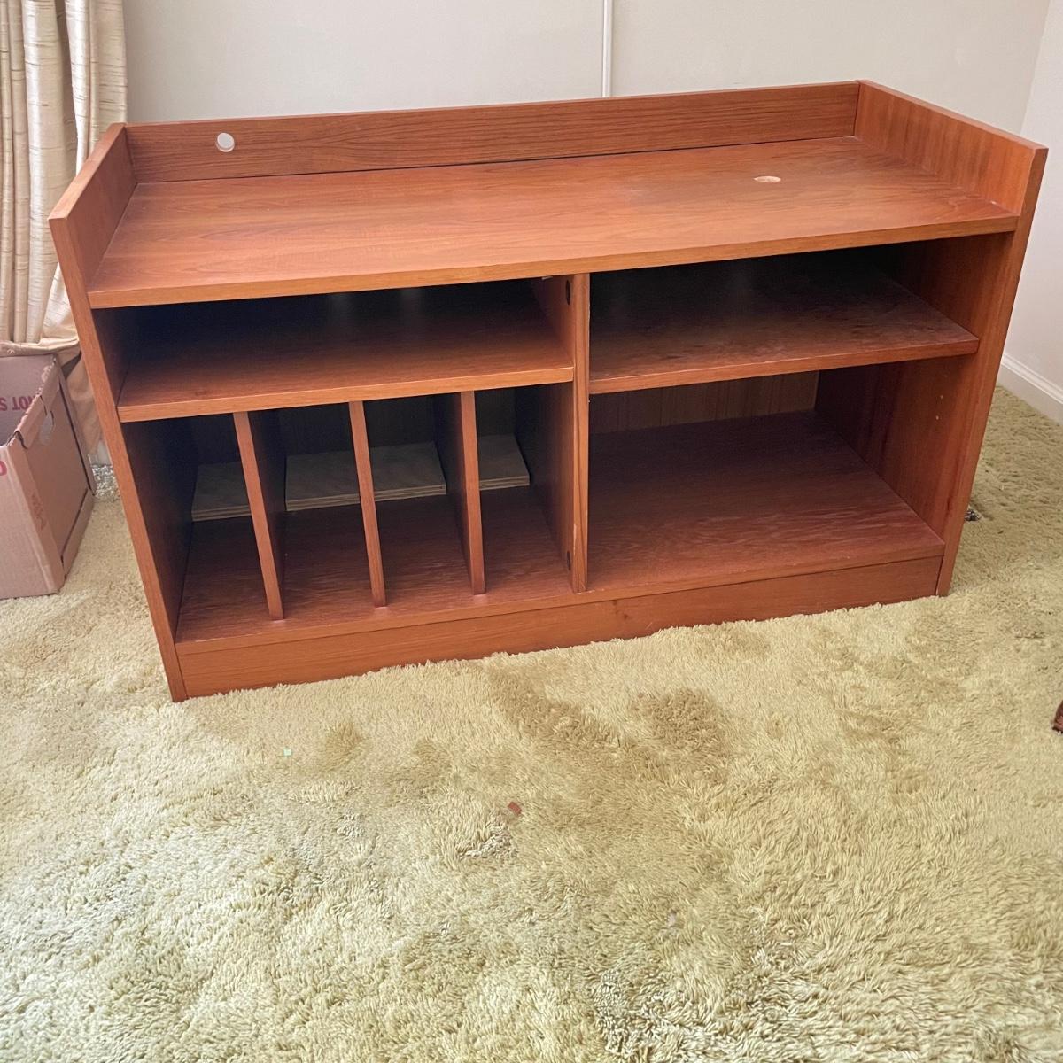 Media shelf with the perfect storage for vinyl And electronics. It has various cutouts for cords and an adjustable shelf on the right side. Included are four pieces of wood to keep your vinyl level up front and organized. This shelf measures 44” x 19” x 25.5” and appears to be manufactured wood. See images. Local pick up only, please bring help to load.