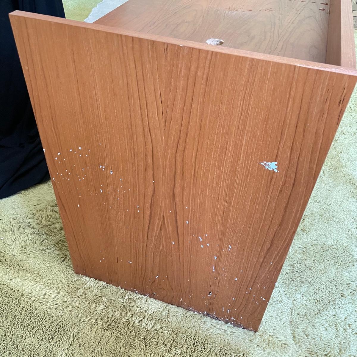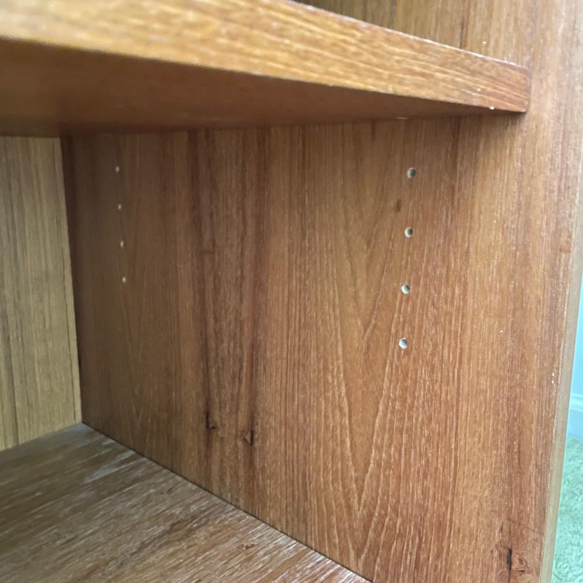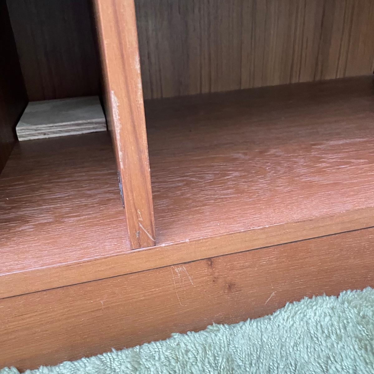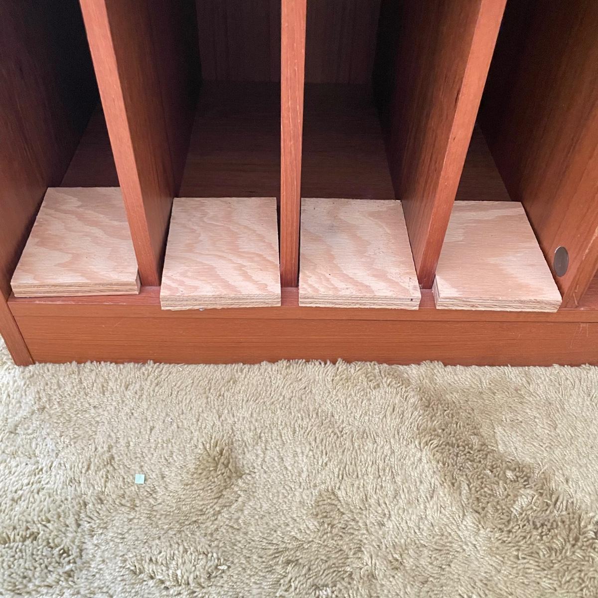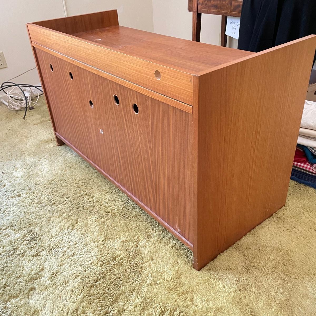 Media shelf with the perfect storage for vinyl And electronics. It has various cutouts for cords and an adjustable shelf on the right side. Included are four pieces of wood to keep your vinyl level up front and organized. This shelf measures 44” x 19” x 25.5” and appears to be manufactured wood. See images. Local pick up only, please bring help to load.