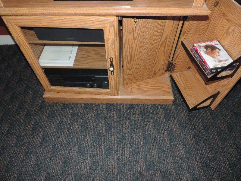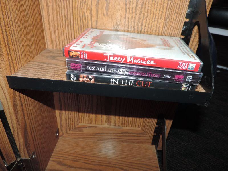 GLASS DOOR HAS SHELVING INSIDE WITH MOVIE STORAGE ON OTHER SIDE DVD MOVIES ARE INCLUDED IT MEASURES 35X20X34