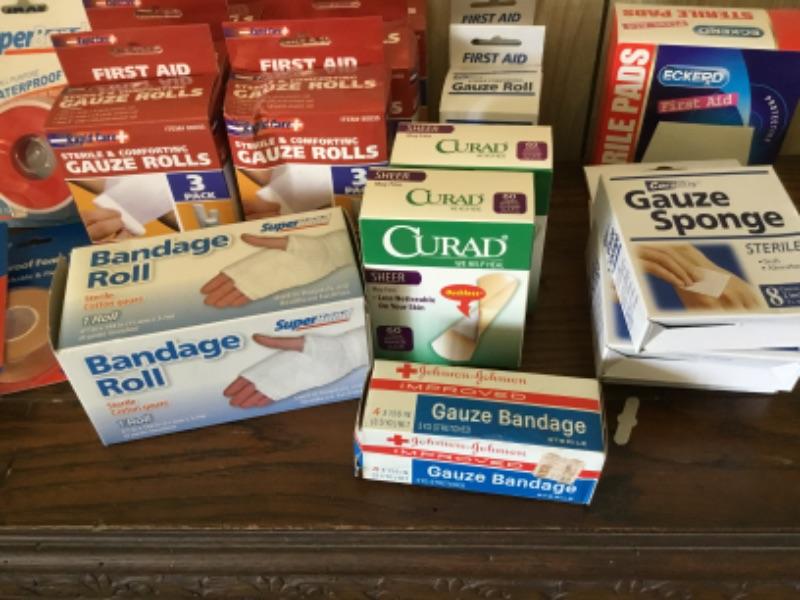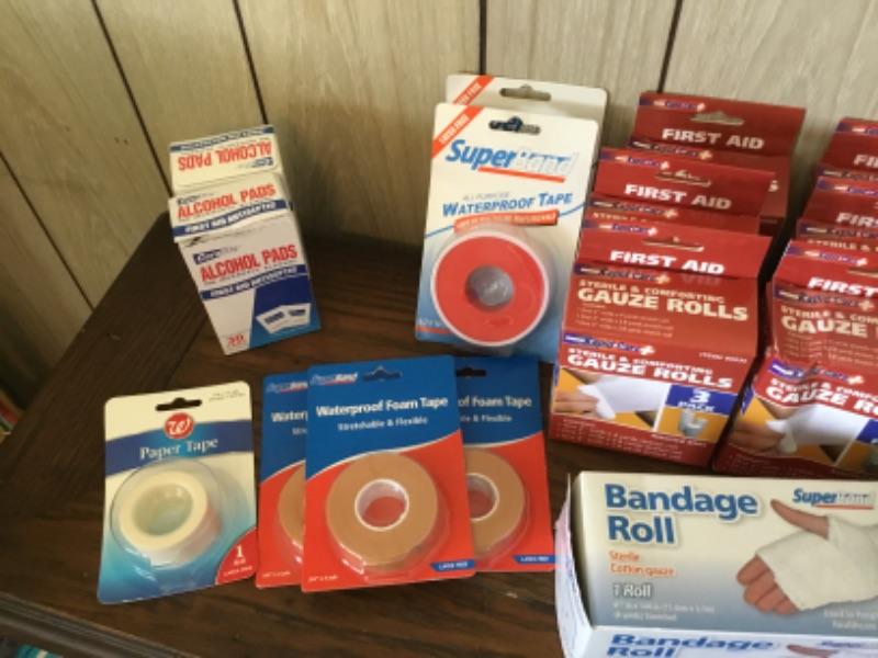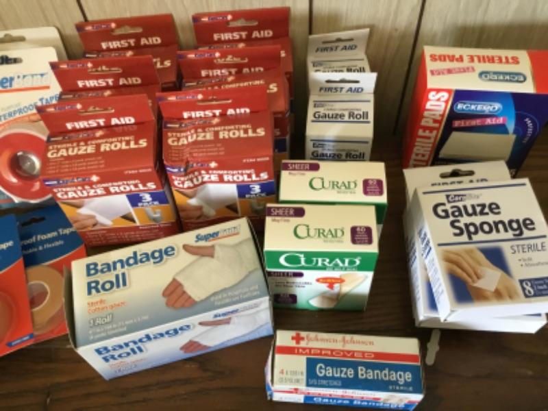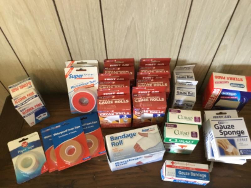 Lot of First Aid Supplies. Gauze, bandages, medical tape, and alcohol pads. Closed packages or partial individually wrapped items