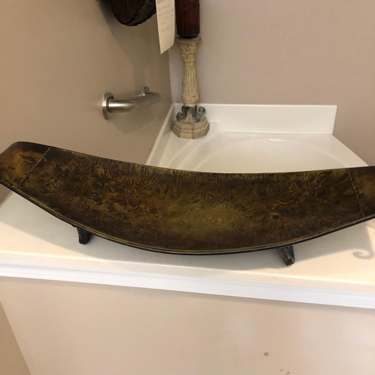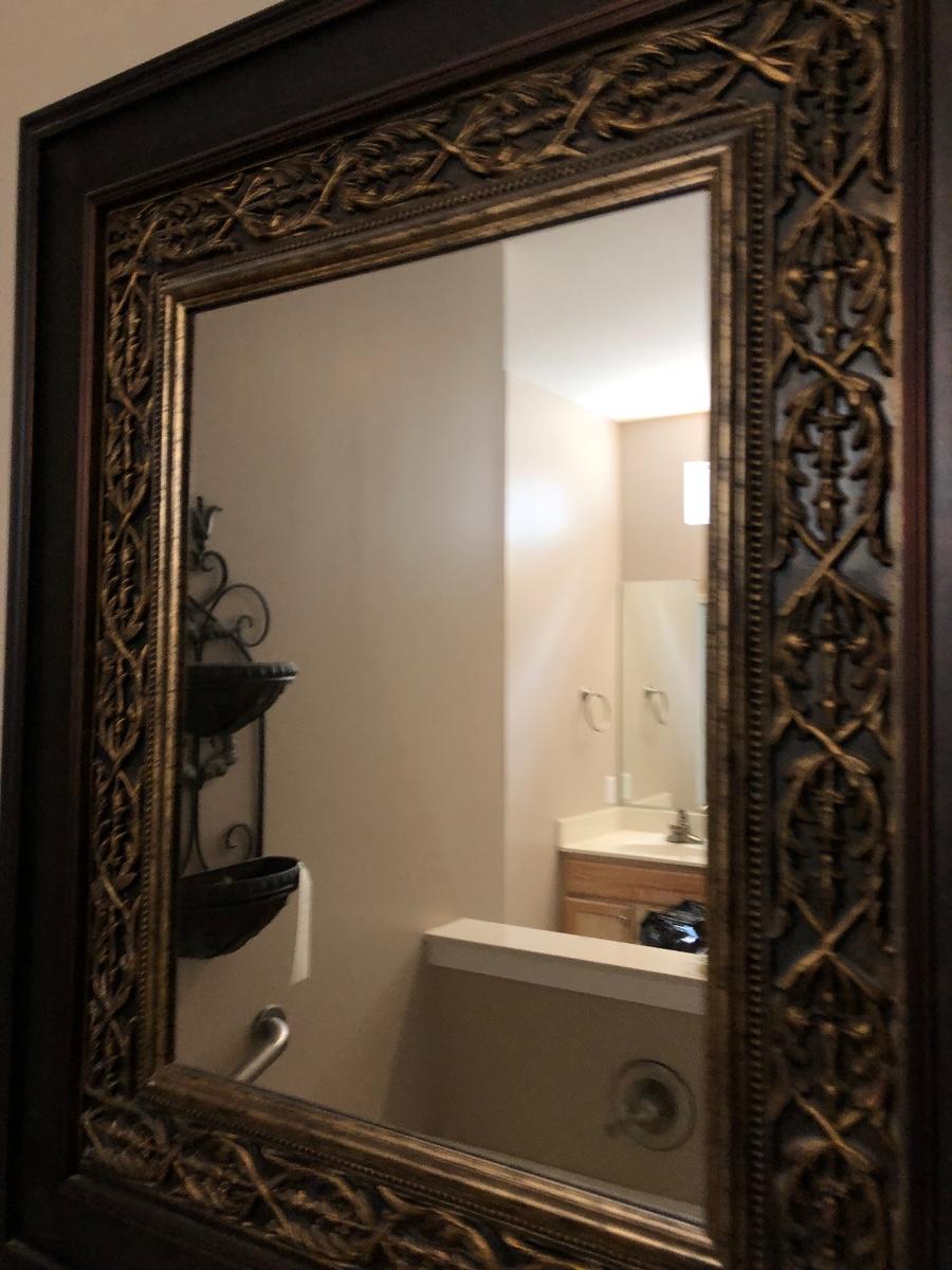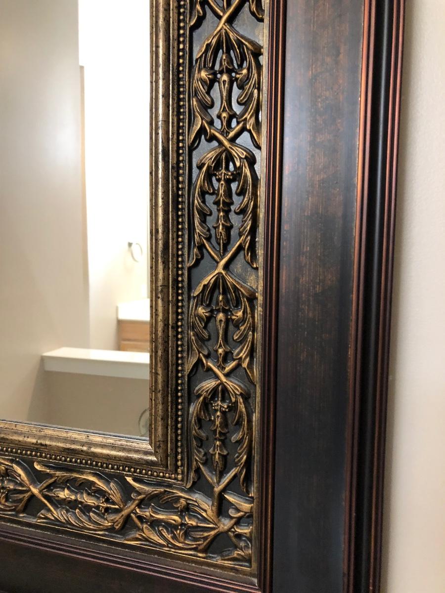 Wooden frame, the design trim on the mirror is plastic. Made to look guilded. The metal tray has a very unique pattern with unique legs and sides.