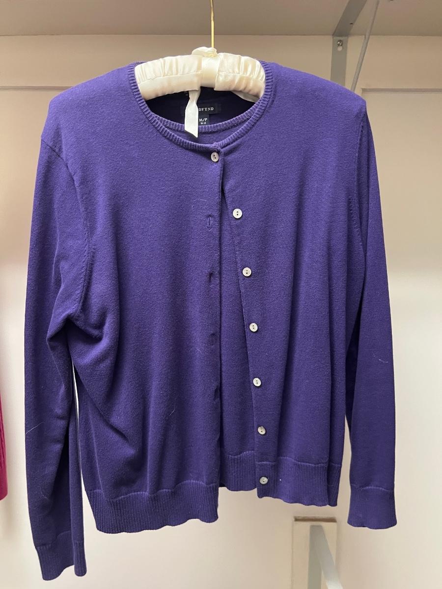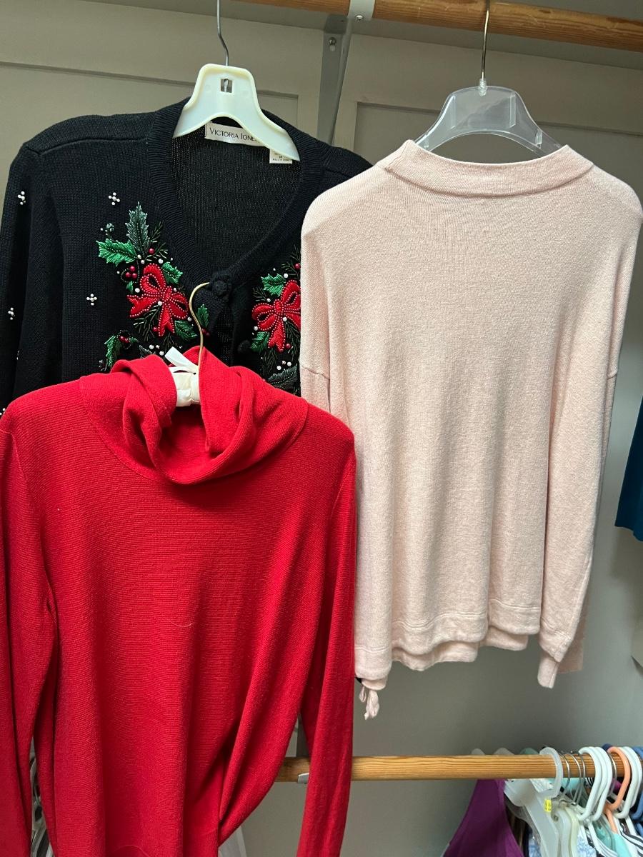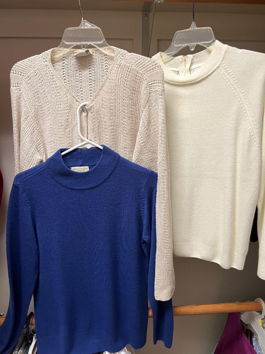 Twelve sweaters in this lot that include two that are two piece. All are size medium with the majority being petite sized. See photos for brands and labels.