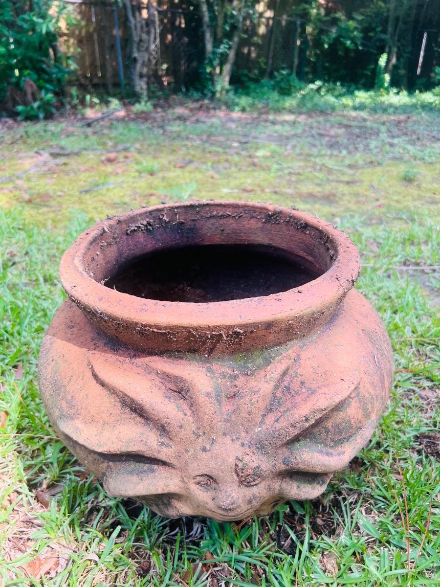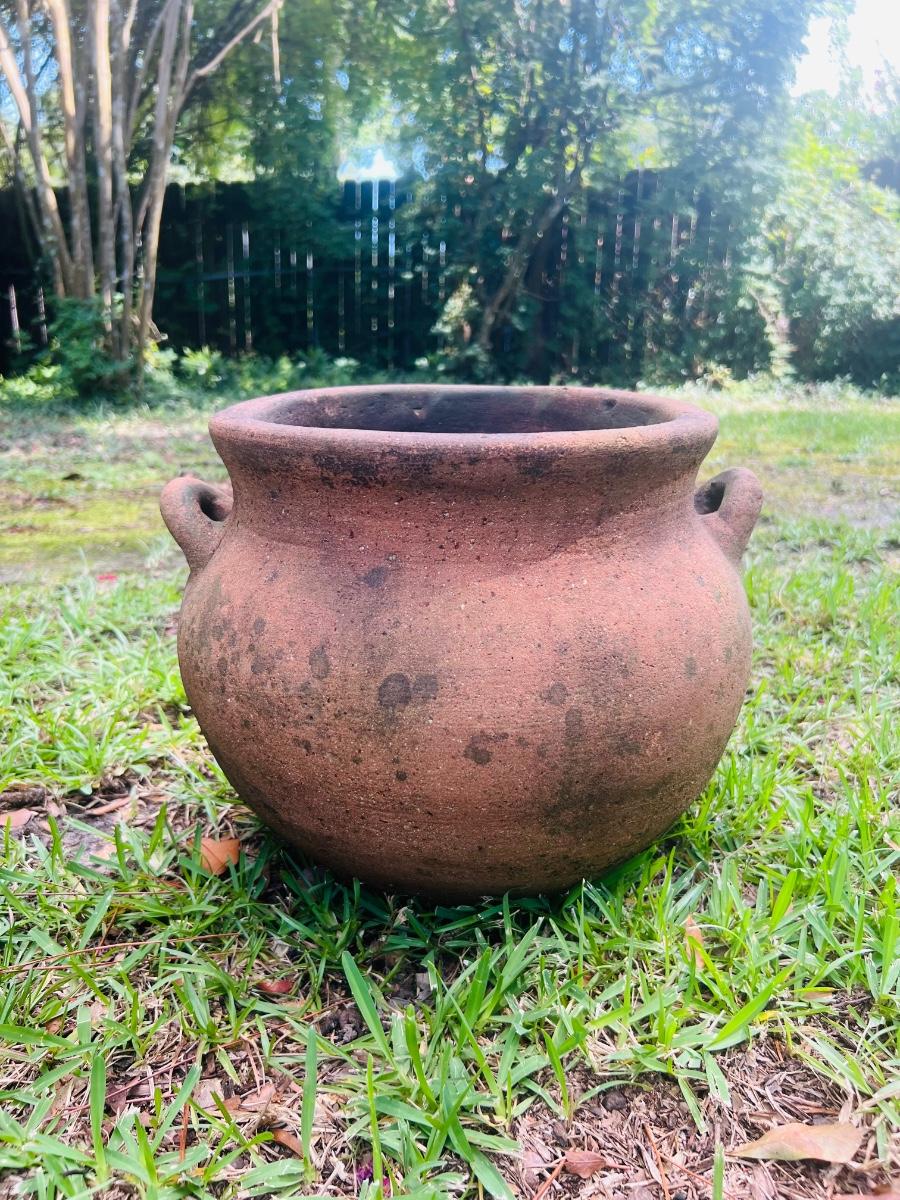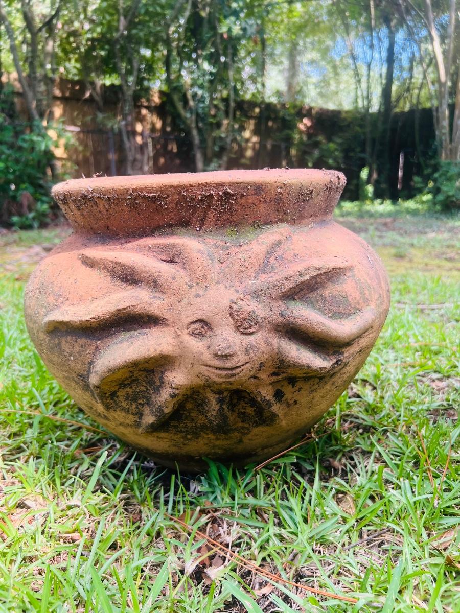 Three Medium size planters. Planter with sun measures 12 inches tall and approximately 15 inches round. Regular planter measures 12 inches tall and 14 inches round. Planter with handles measures 12 inches tall and 15 inches wide.