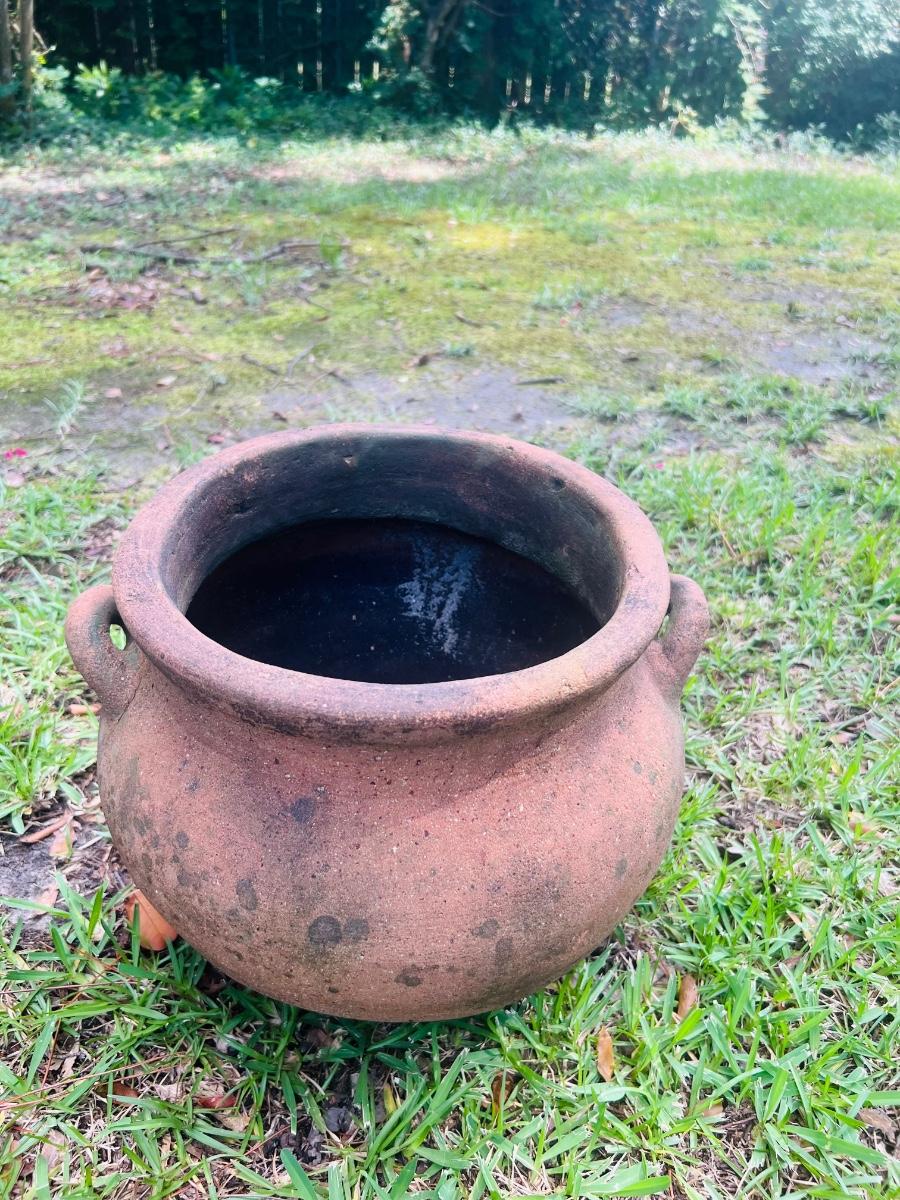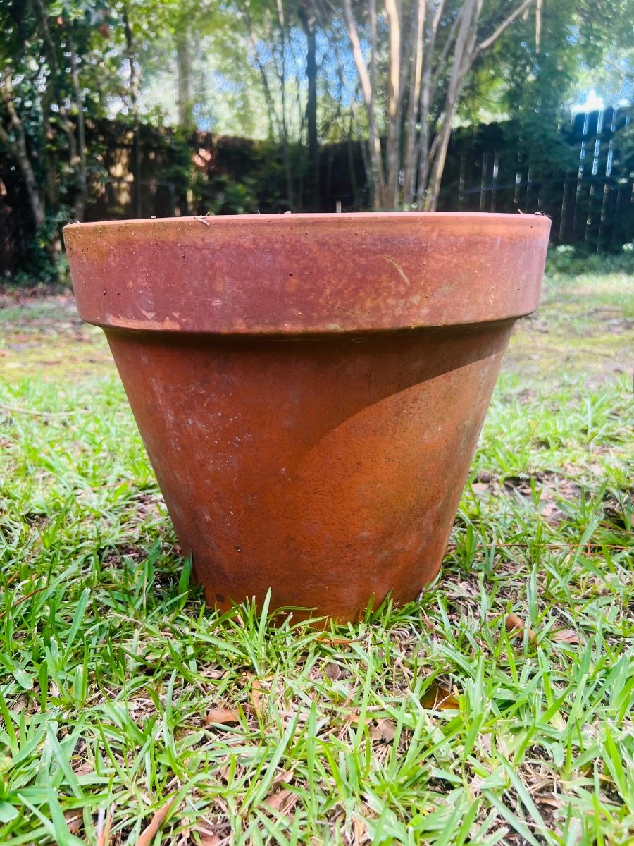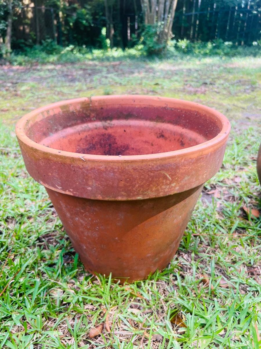 Three Medium size planters. Planter with sun measures 12 inches tall and approximately 15 inches round. Regular planter measures 12 inches tall and 14 inches round. Planter with handles measures 12 inches tall and 15 inches wide.