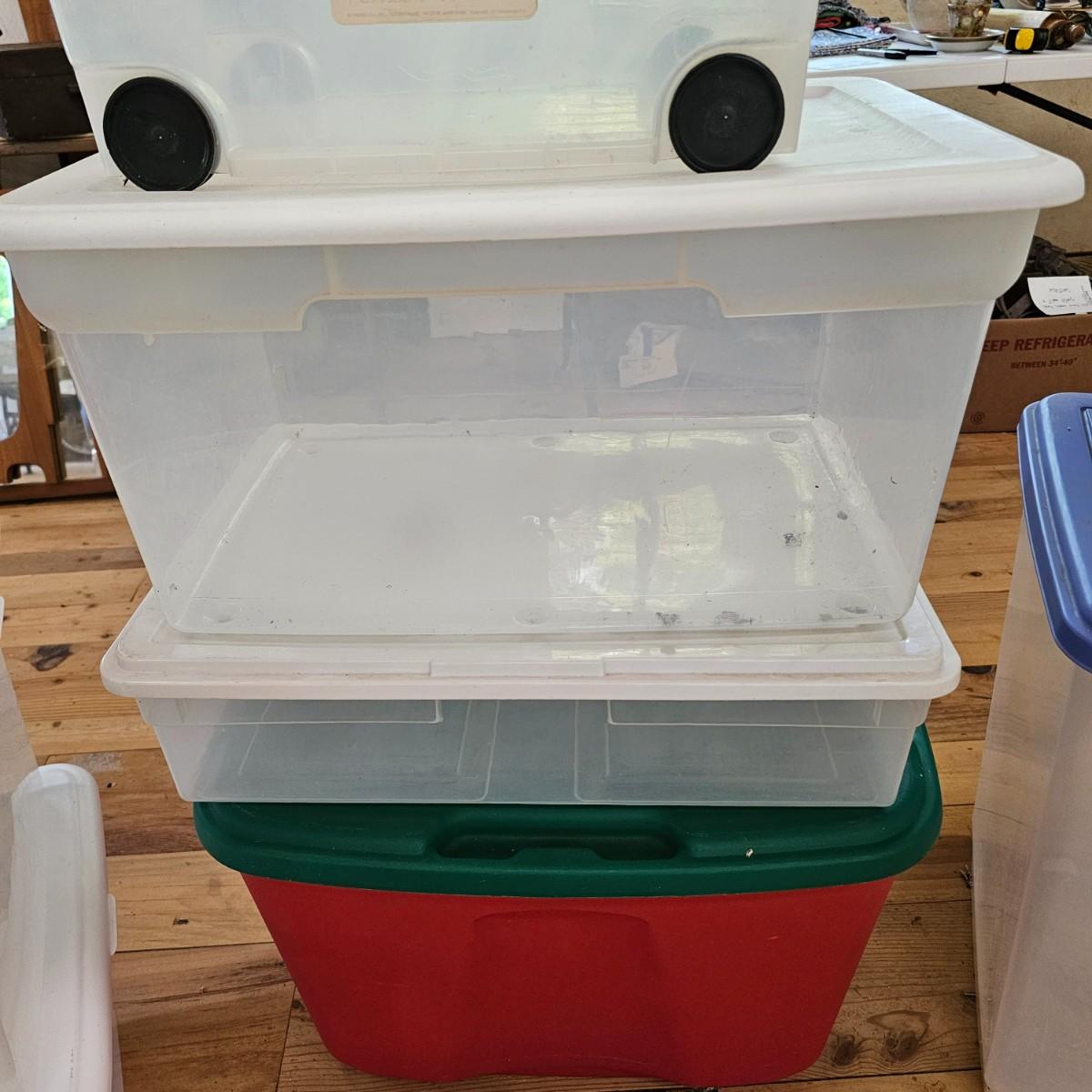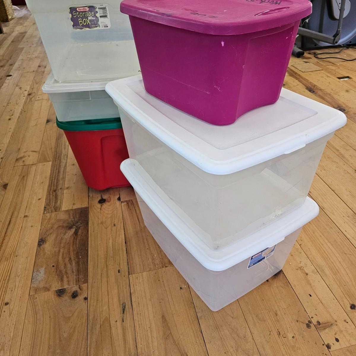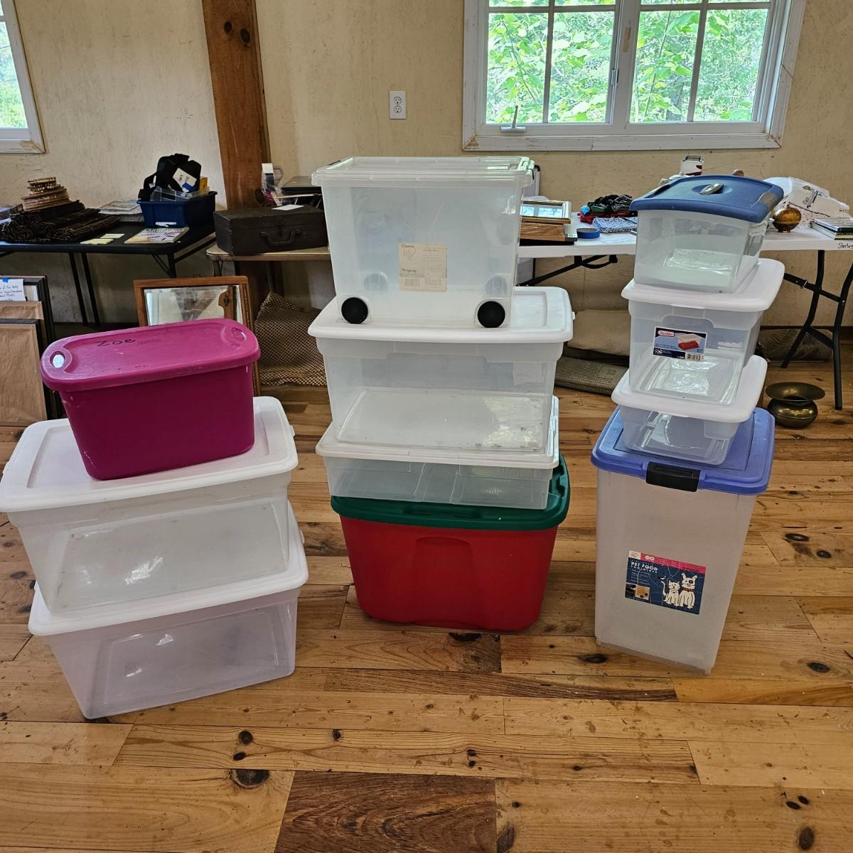 Eleven different bins for storage. All items have lids. Largest is 22" x 16" x 12"H, smallest is 15" x 10" x 7". See photos for details. Local pickup only.