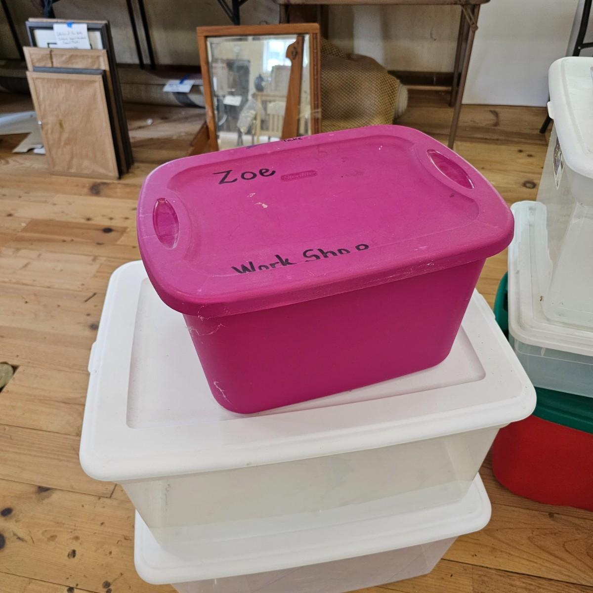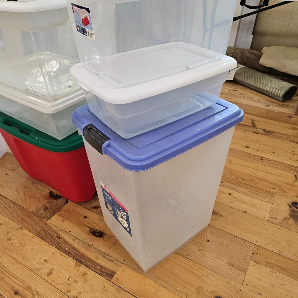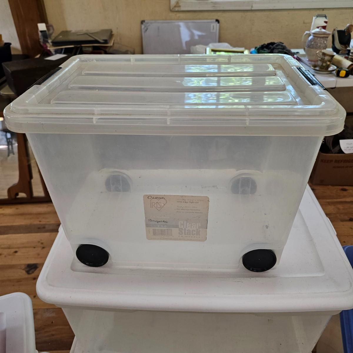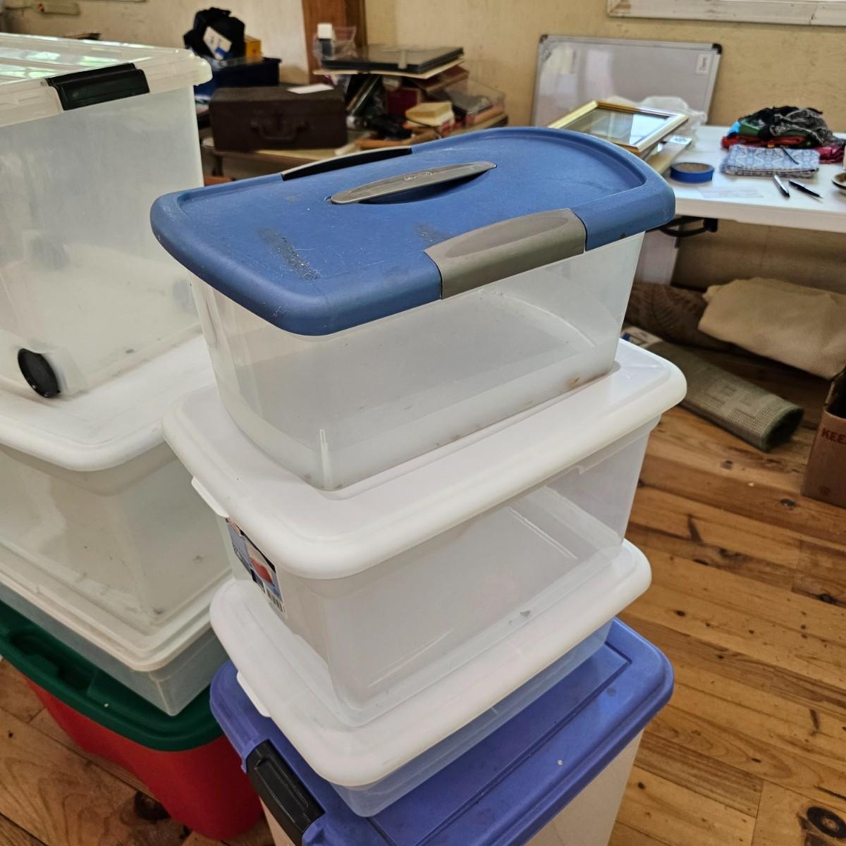 Eleven different bins for storage. All items have lids. Largest is 22" x 16" x 12"H, smallest is 15" x 10" x 7". See photos for details. Local pickup only.