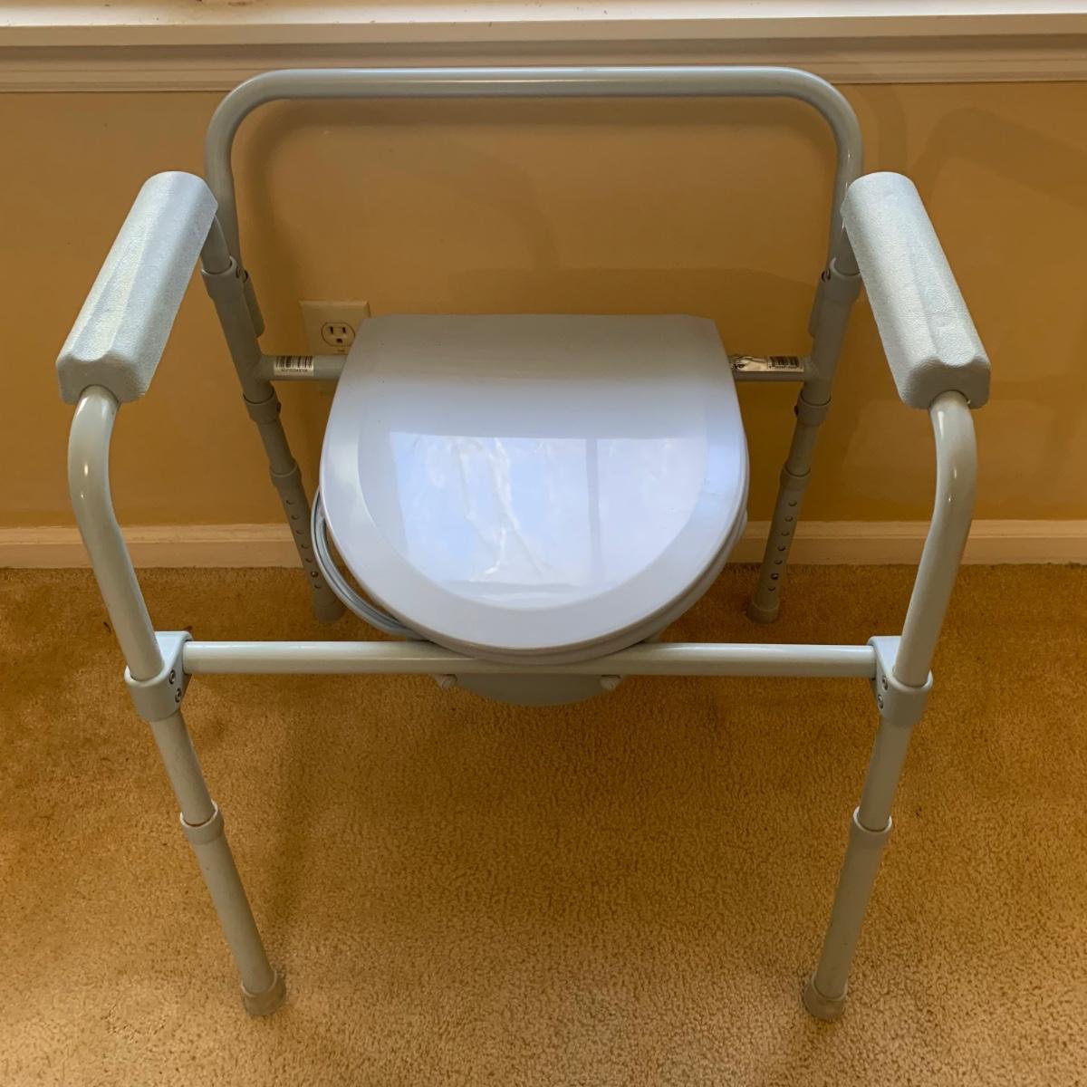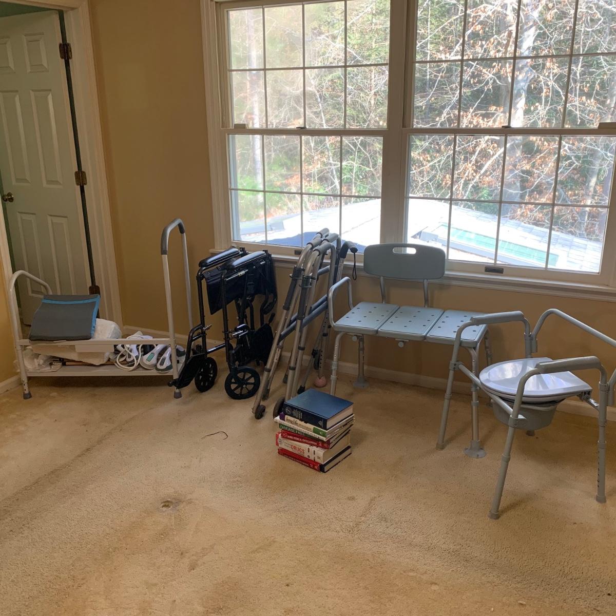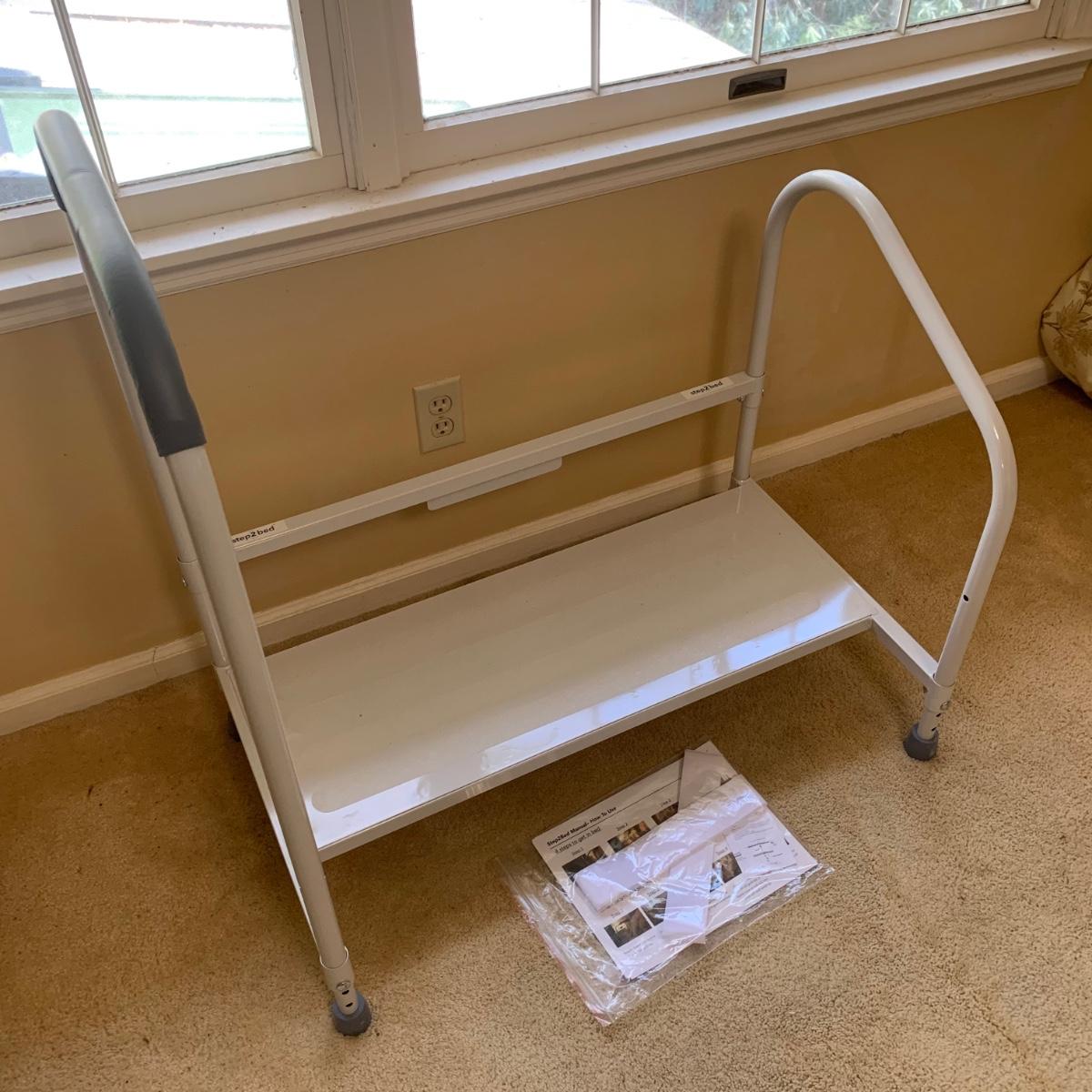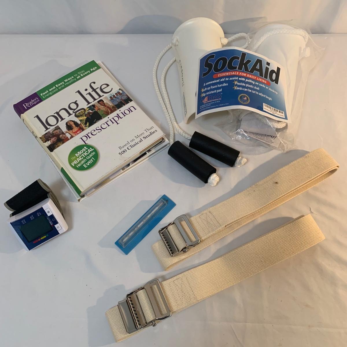 This medical device lot includes two walkers, a bedside commode, two gait belts, walking cane, a magnetic nightlight, blood pressure cuff, shower chair, suction-on handles, step 2 bed step ladder, Drive wheel chair, medical literature, and more! Brands include Medline, Drive, and more. Blood pressure cuff likely needs a new battery, otherwise lot is in good condition.