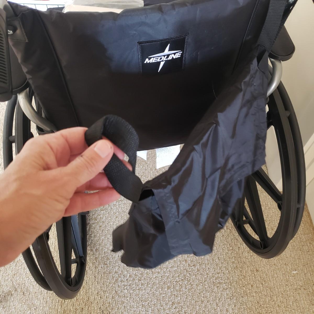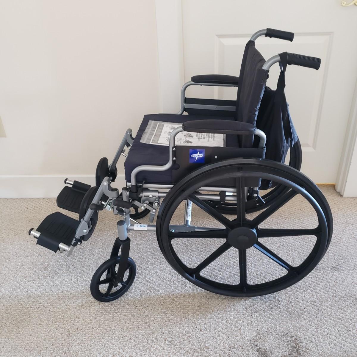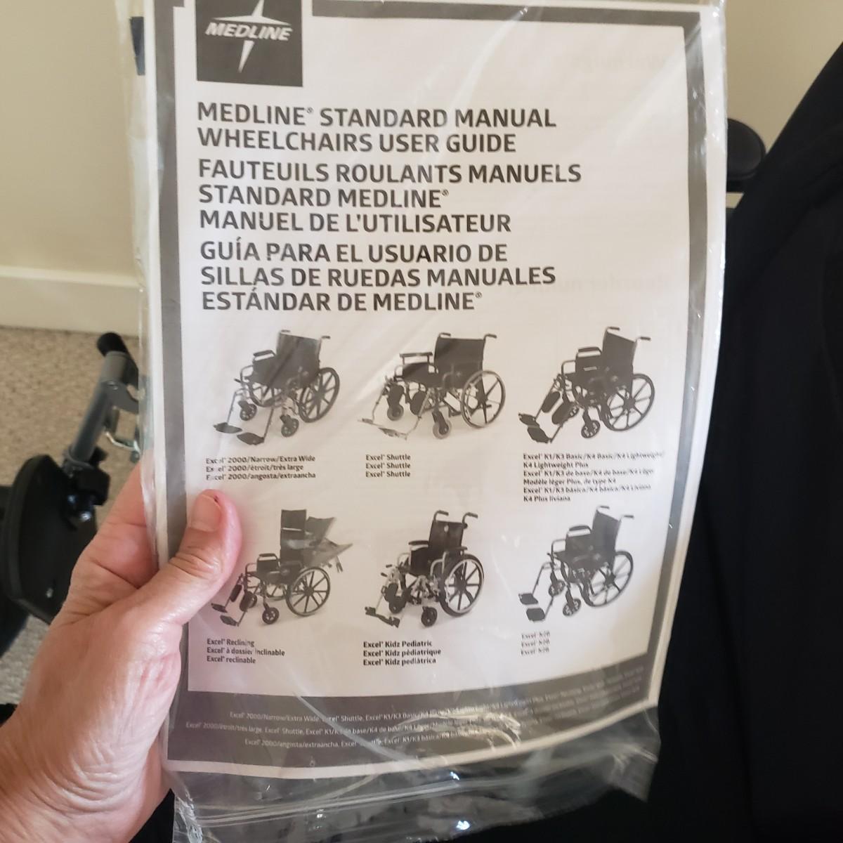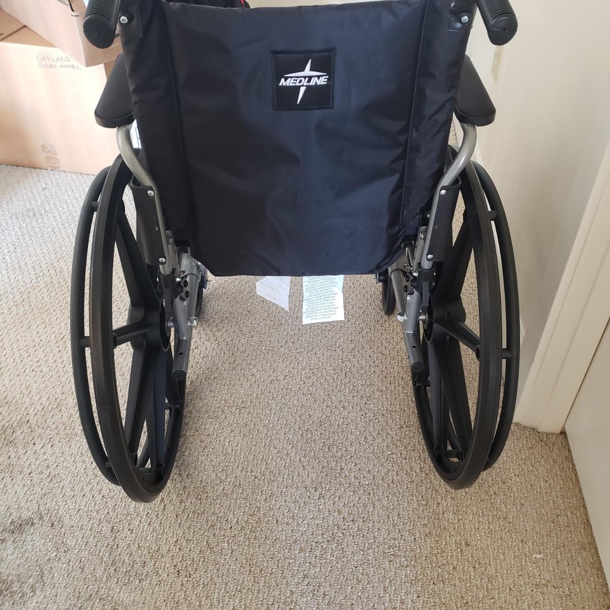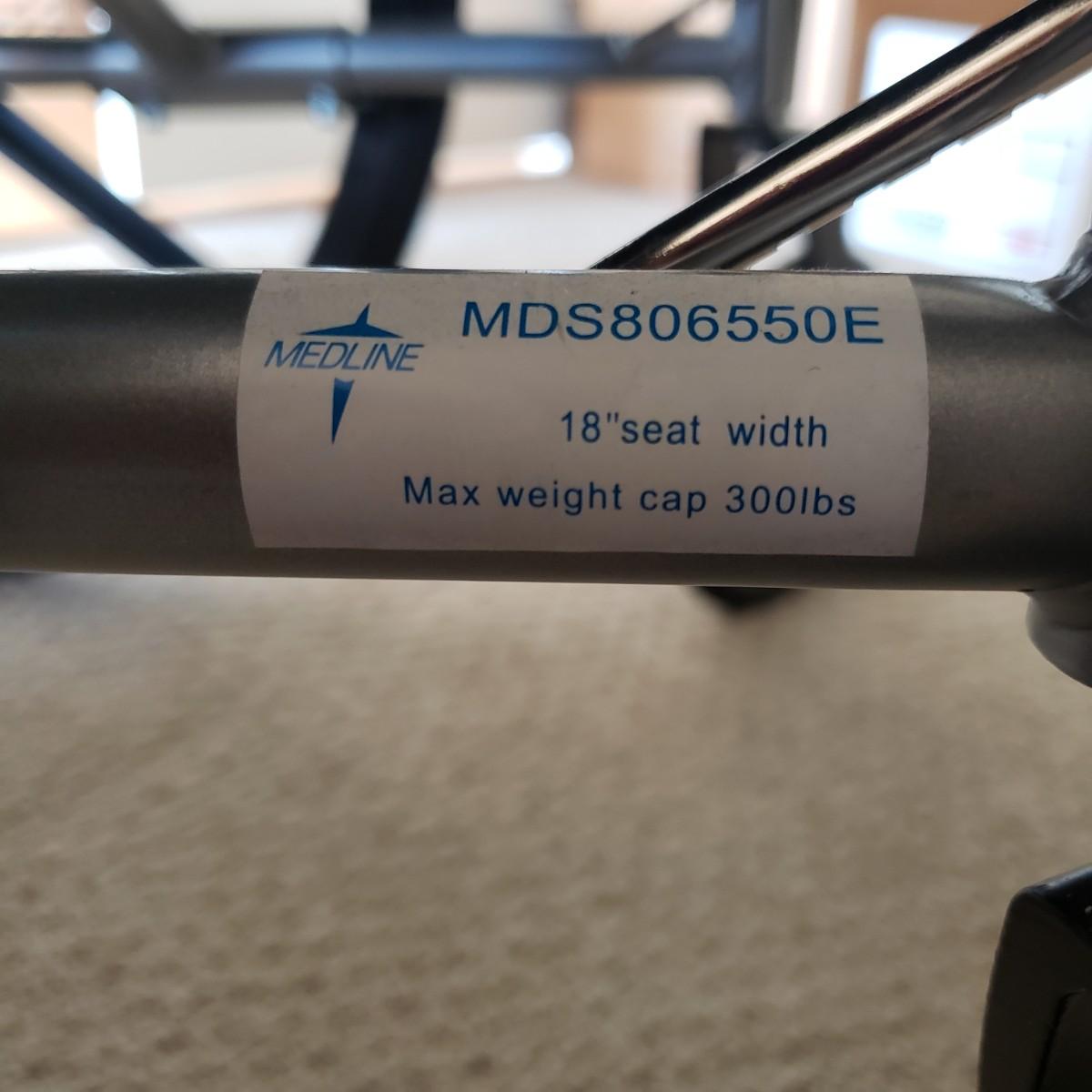 This is a Medline wheelchair. Chair comes with two removable foot rest and a nylon removable bag that hangs on handles. See pictures for measurements.