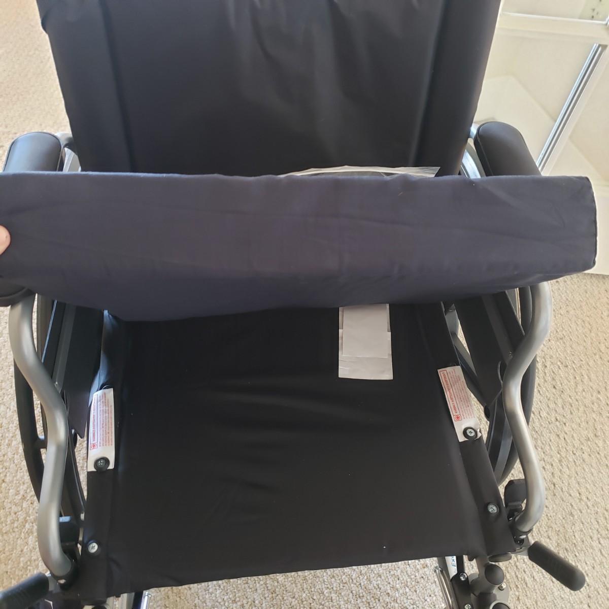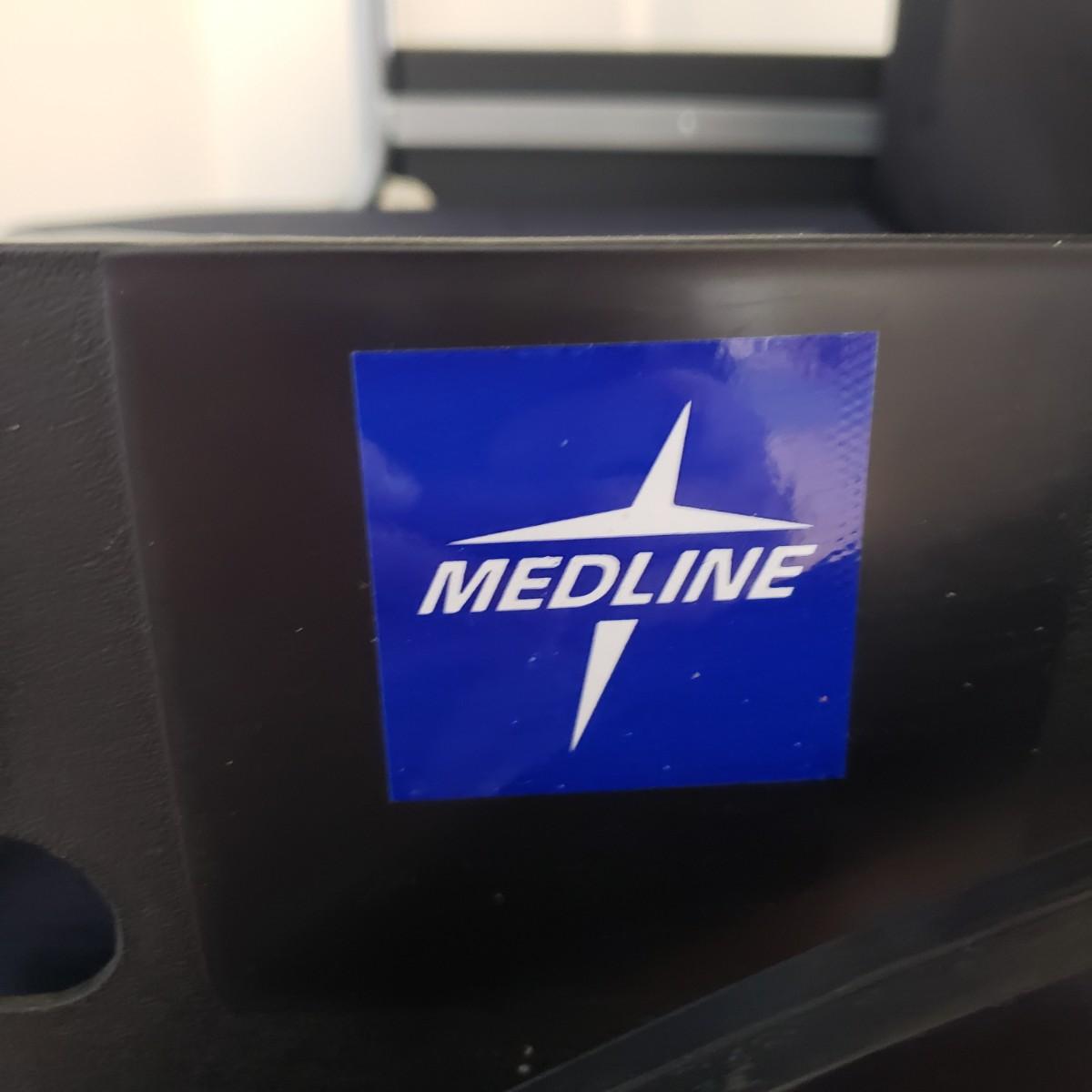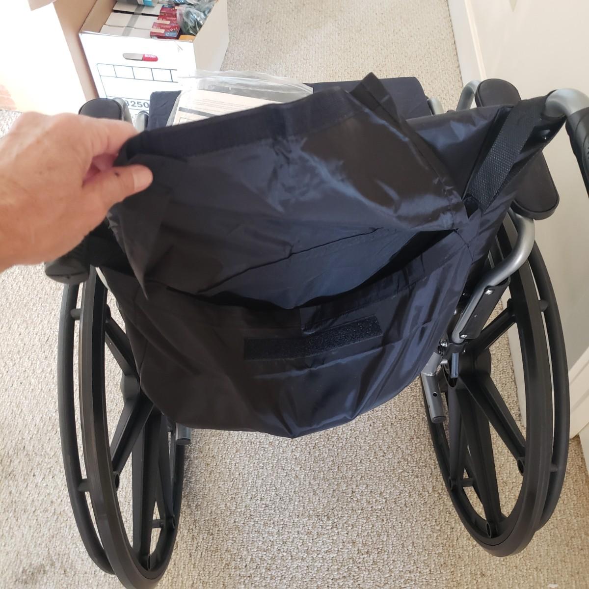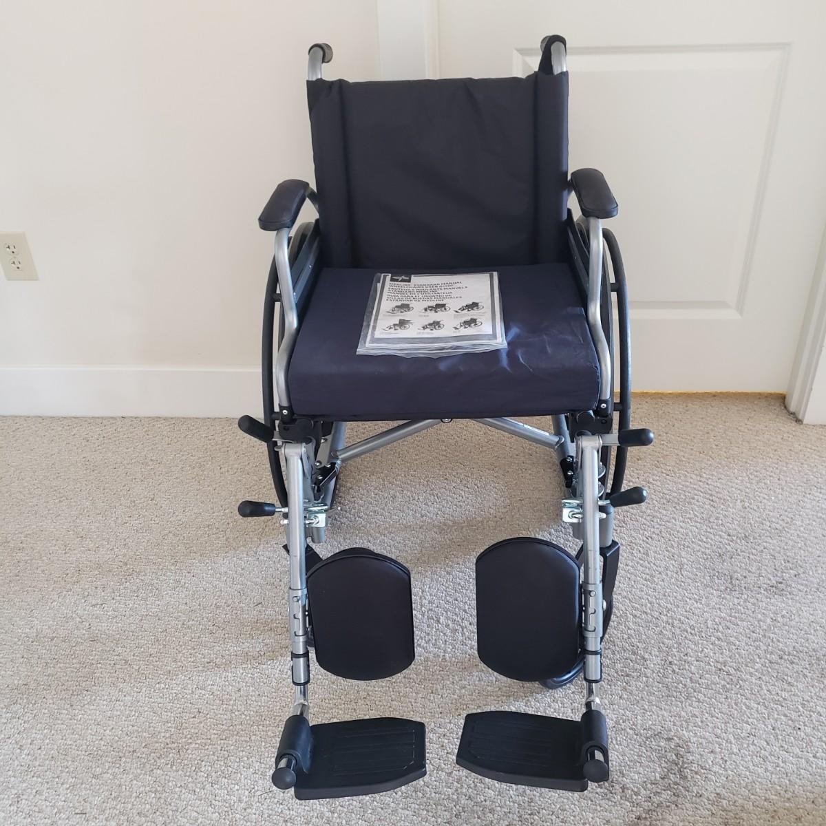 This is a Medline wheelchair. Chair comes with two removable foot rest and a nylon removable bag that hangs on handles. See pictures for measurements.