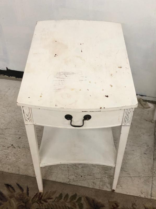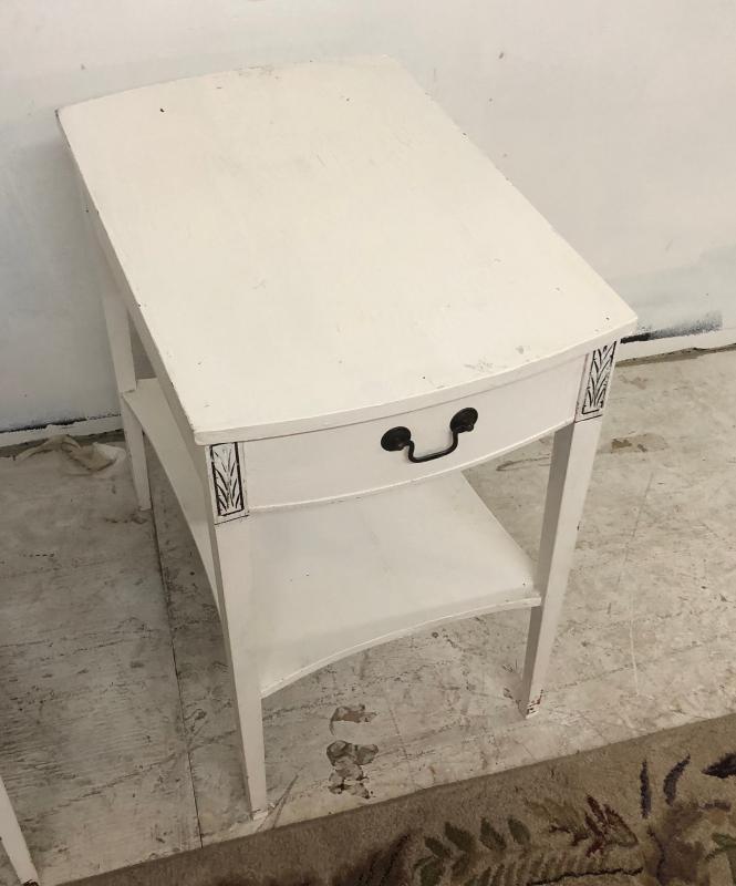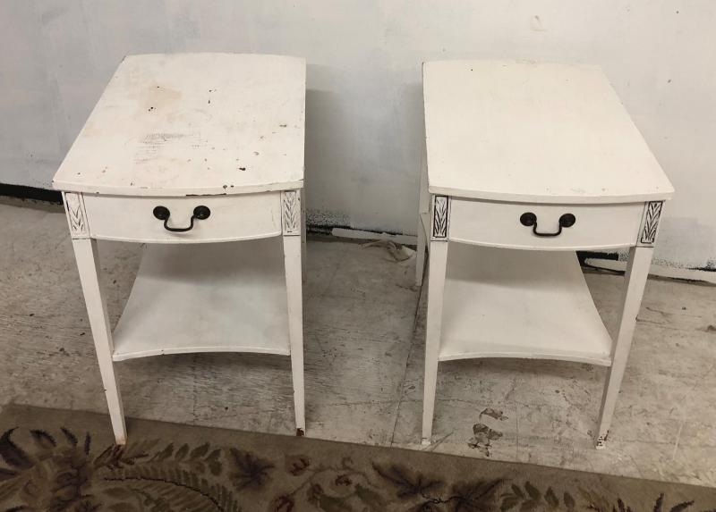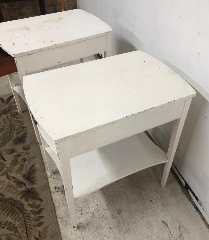 Here are a pair of quality wooden end tables from Meersman...They have been painted..Approx 24 x 16 x 25"...offered for restoration...
