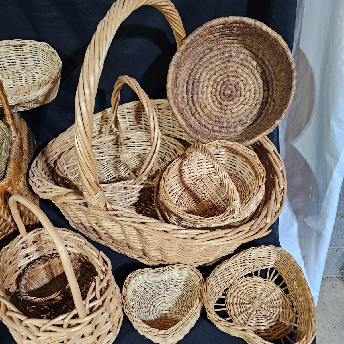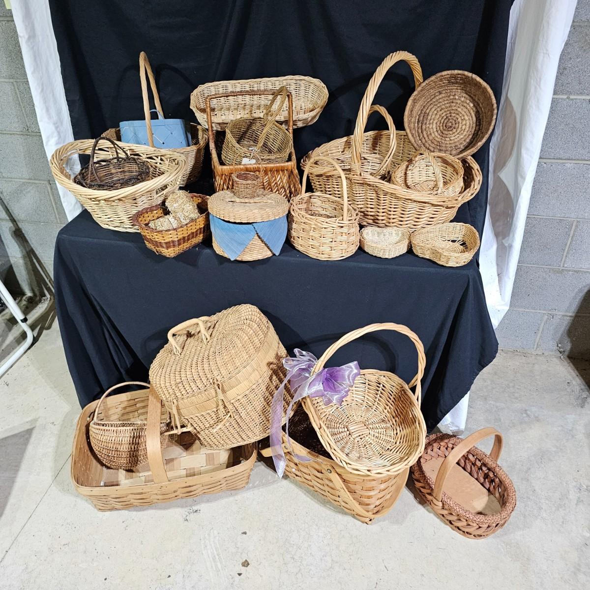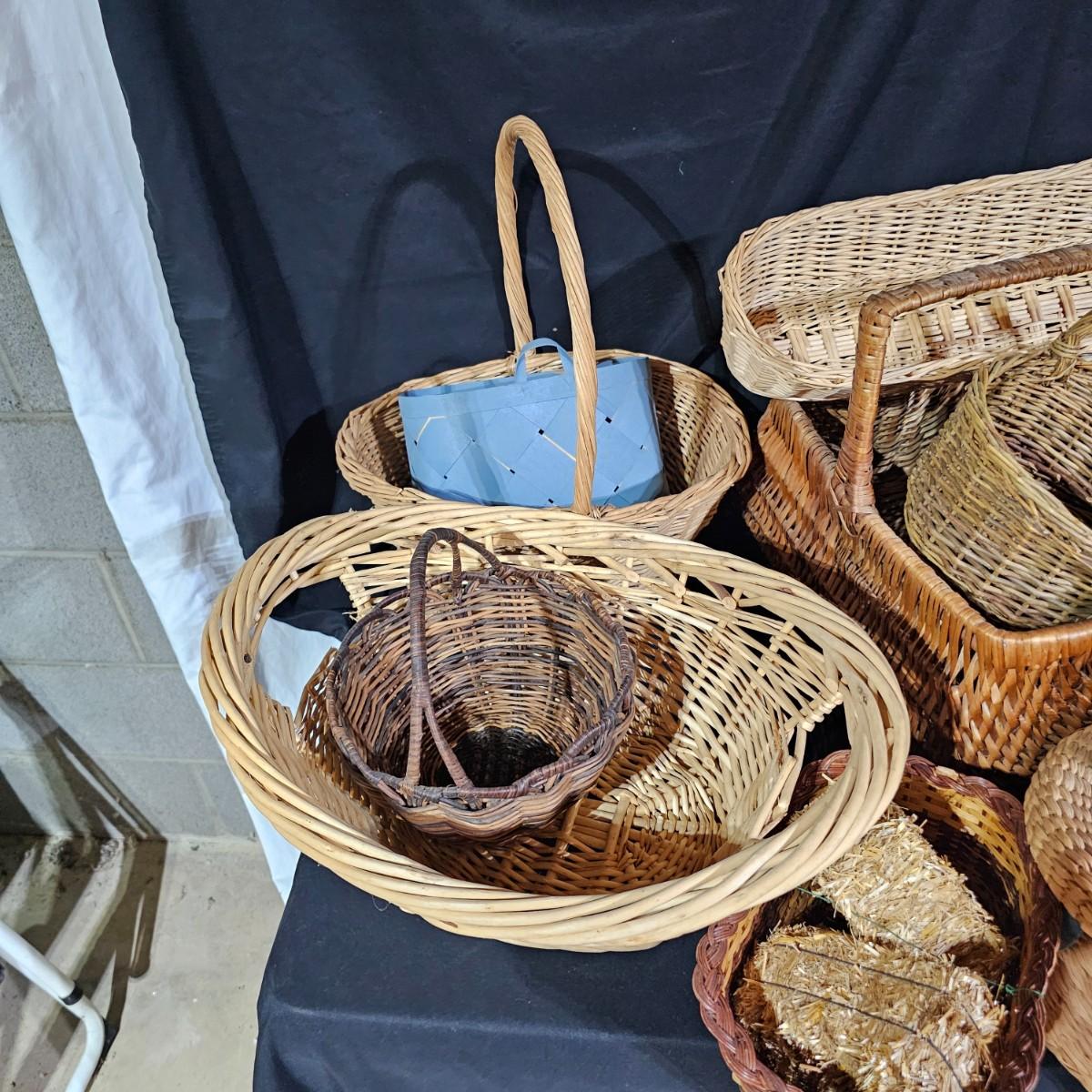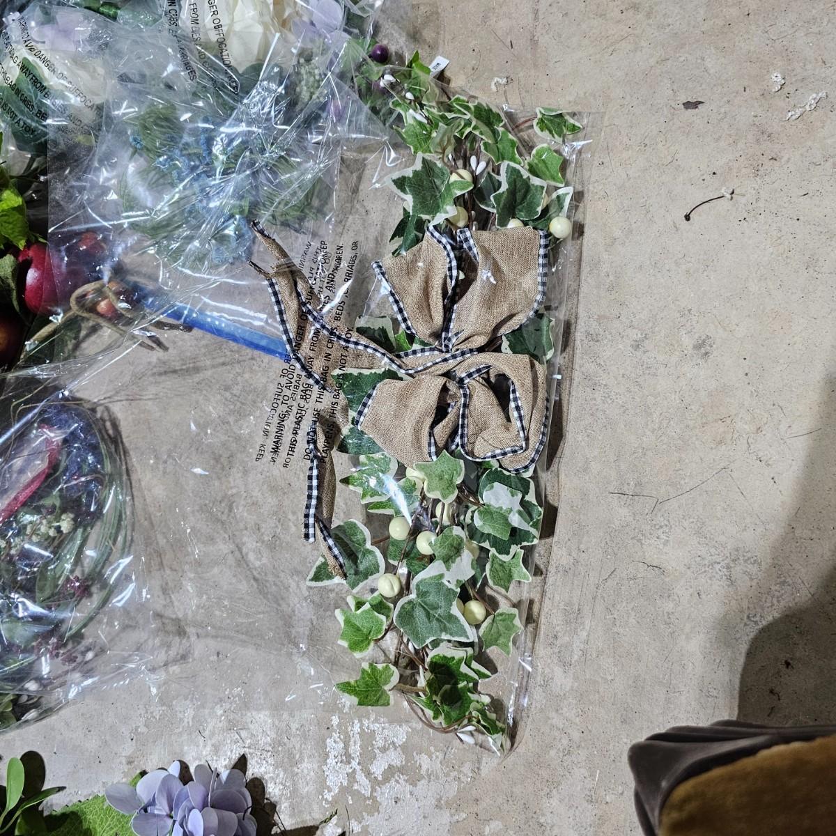 Huge mixture of garlands, candle rings, sprigs and more, plus baskets! Ivy, daisies, apples, and lots of others. Two centerpiece candle sets with flameless candles, battery operated, untested. Lot includes two dozen baskets of different shapes and sizes. Rattan and split wood styles, some with handles, and more. Basket in last photo measures 14” x 16” x 16”H. See photos for details. Local pickup only. This is a very large lot. Please plan accordingly for transportation.