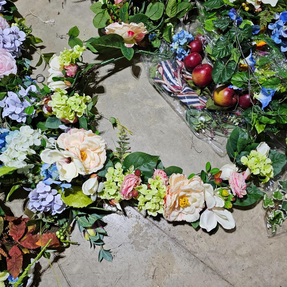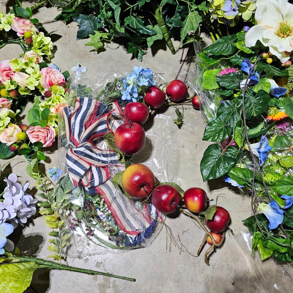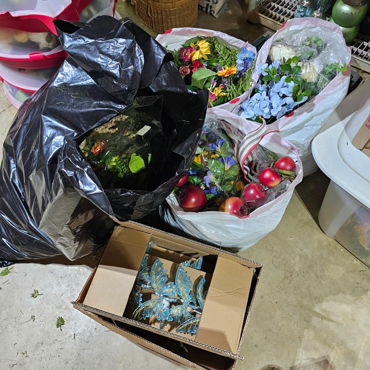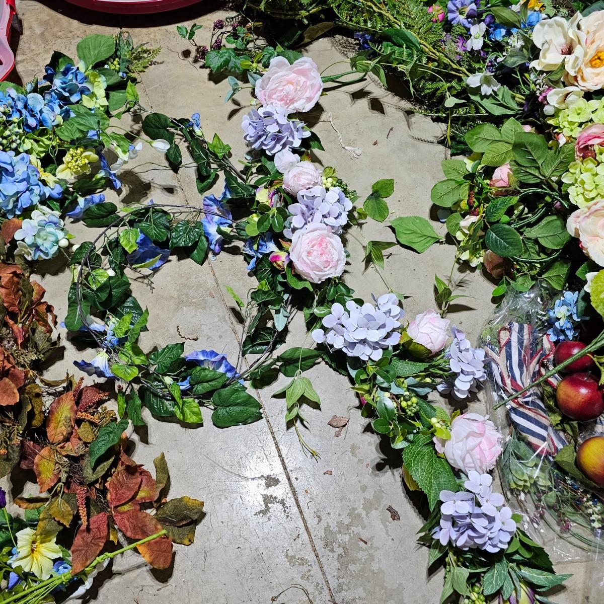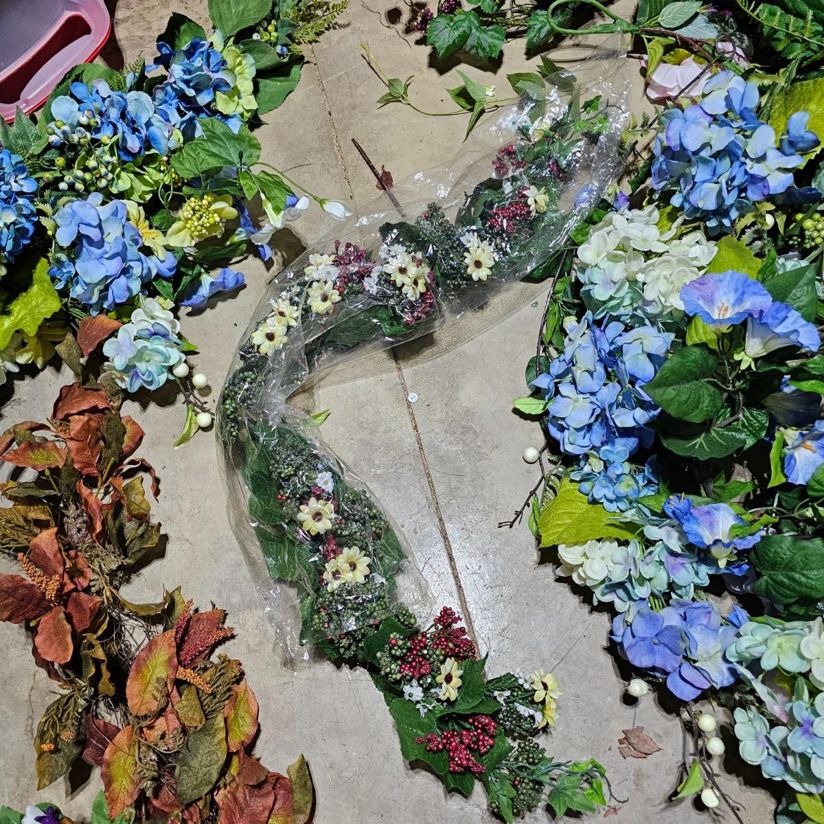 Huge mixture of garlands, candle rings, sprigs and more, plus baskets! Ivy, daisies, apples, and lots of others. Two centerpiece candle sets with flameless candles, battery operated, untested. Lot includes two dozen baskets of different shapes and sizes. Rattan and split wood styles, some with handles, and more. Basket in last photo measures 14” x 16” x 16”H. See photos for details. Local pickup only. This is a very large lot. Please plan accordingly for transportation.