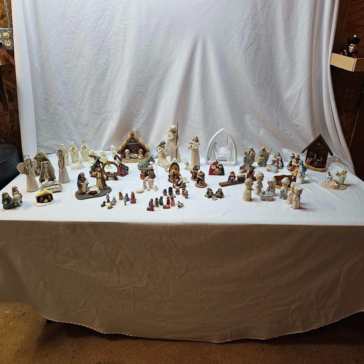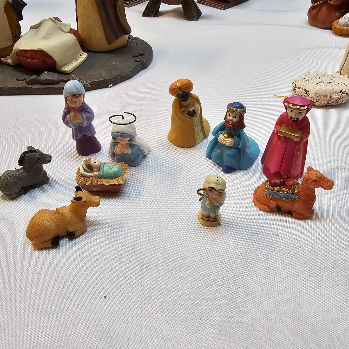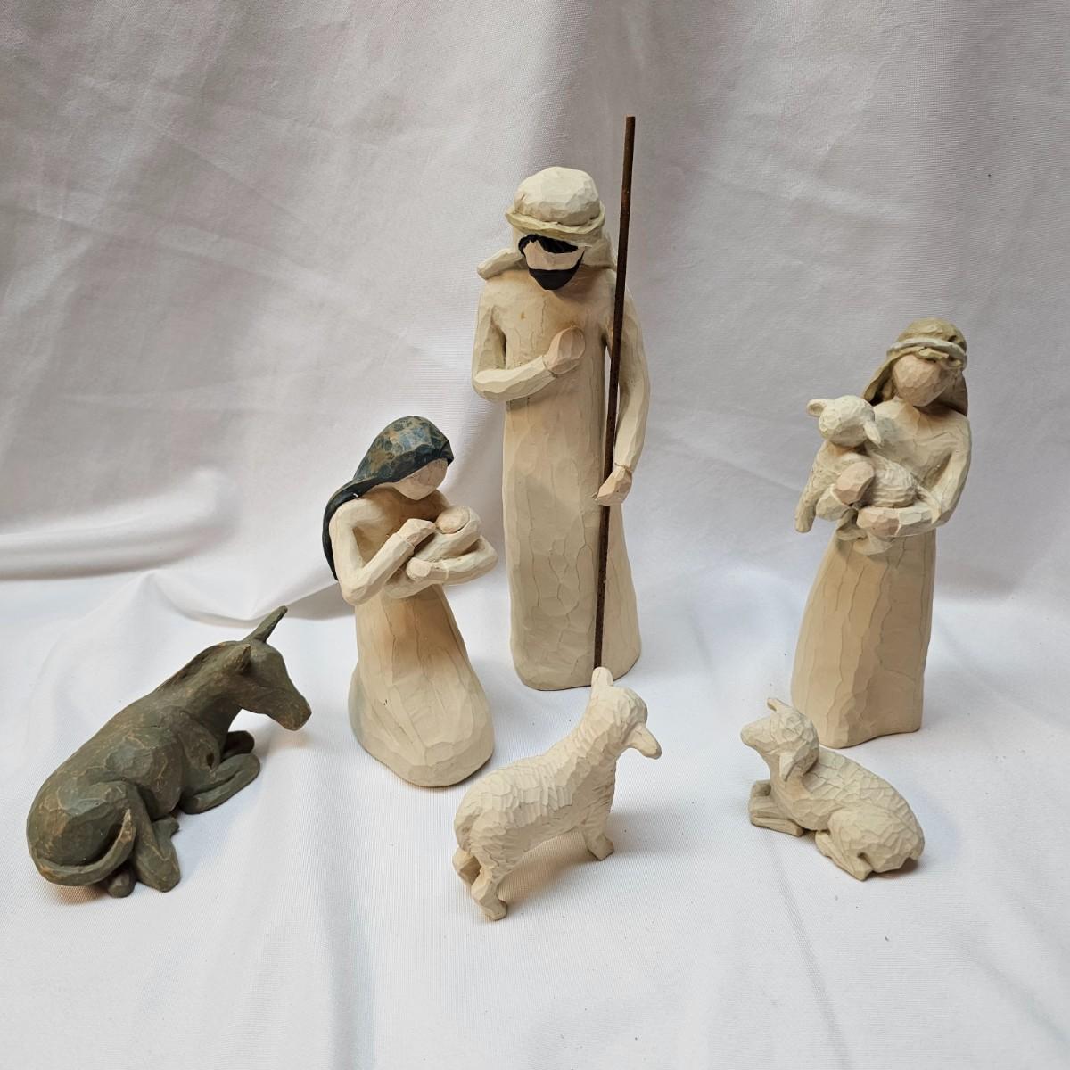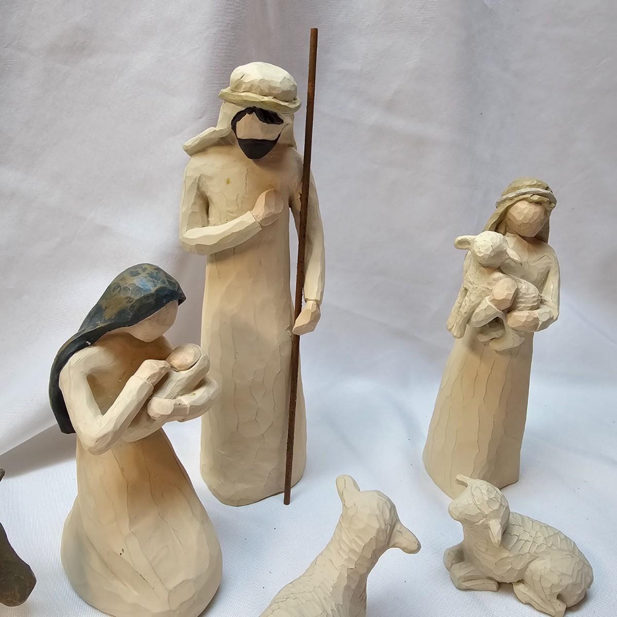 Twenty-seven examples of the Nativity. China, wood, porcelain, salt dough, all different sizes and shapes. Items by Hallmark, Willow Tree and others. Many items handmade. Sizes range from just over an inch tall to 9.5" H for the Willow Tree Demdaco Joseph. See photos for details. Shipping available.
