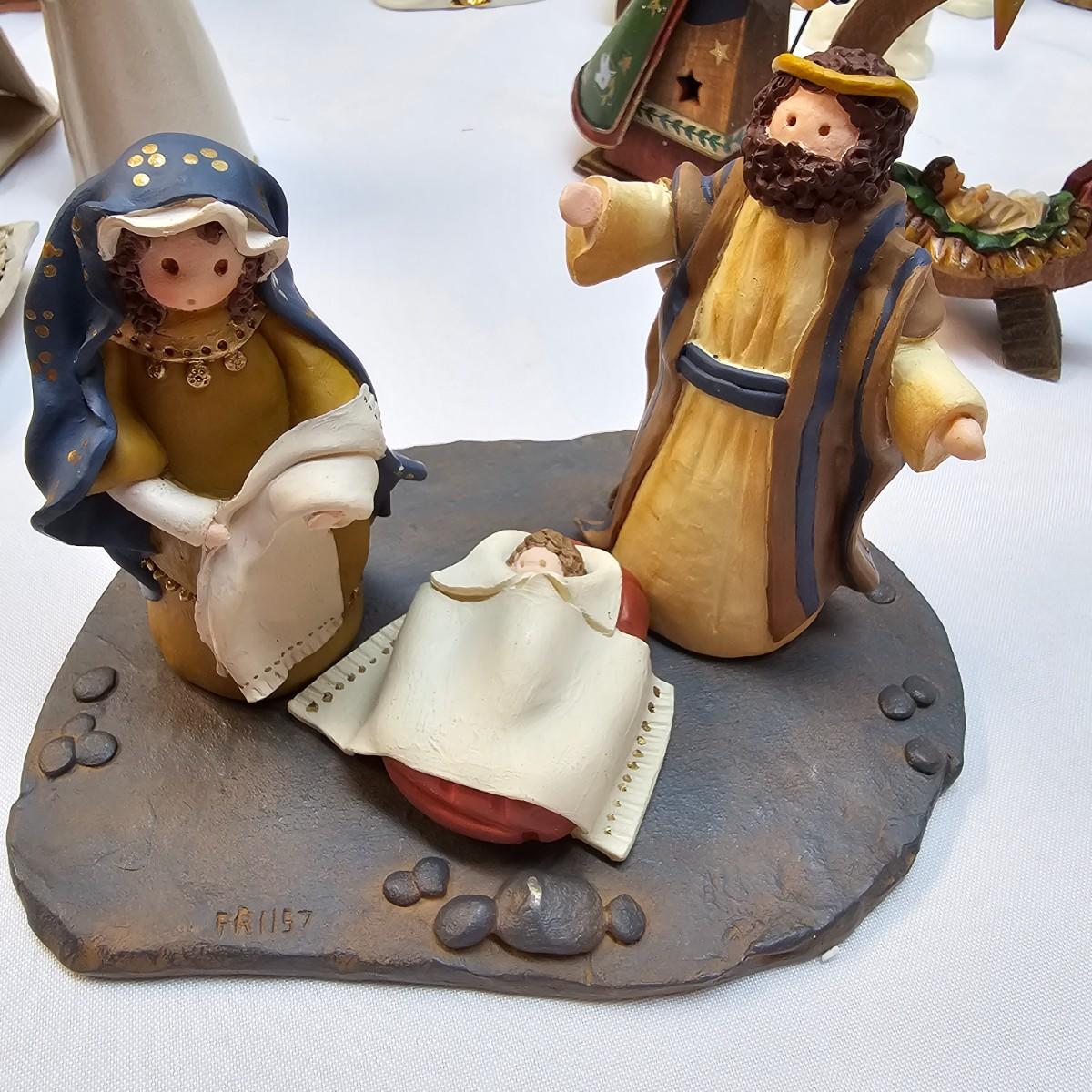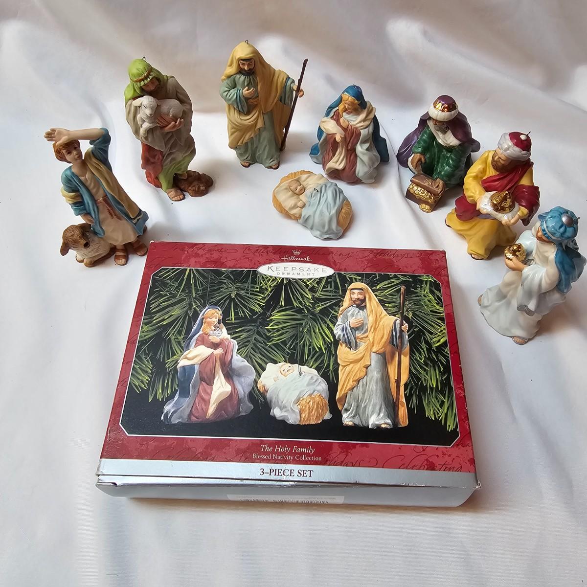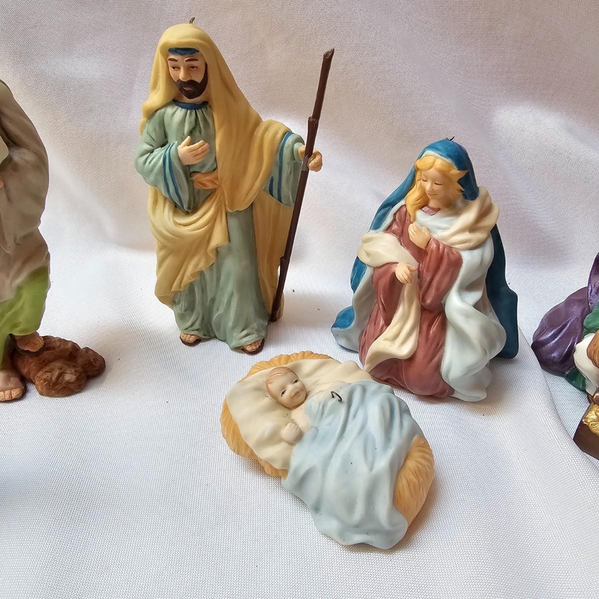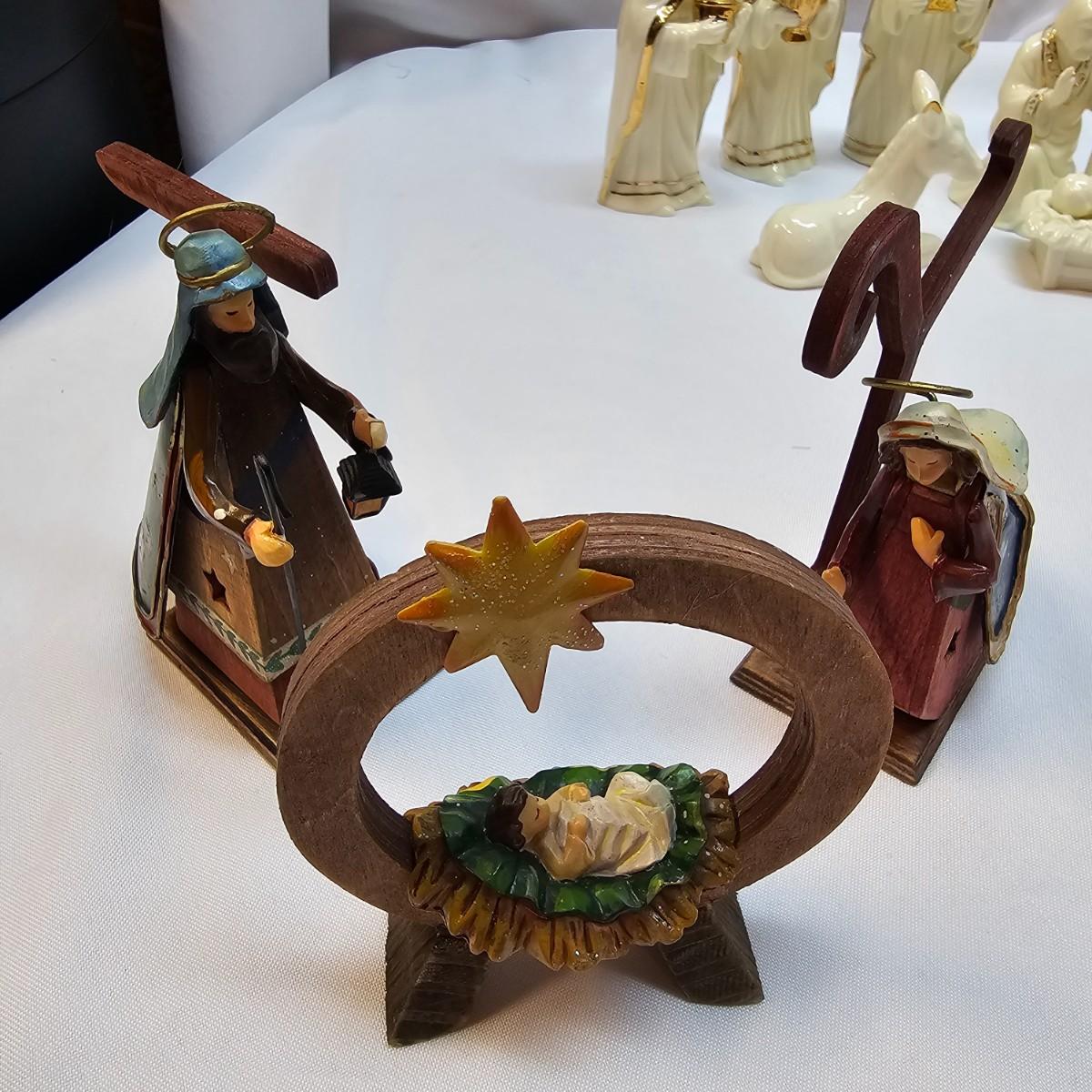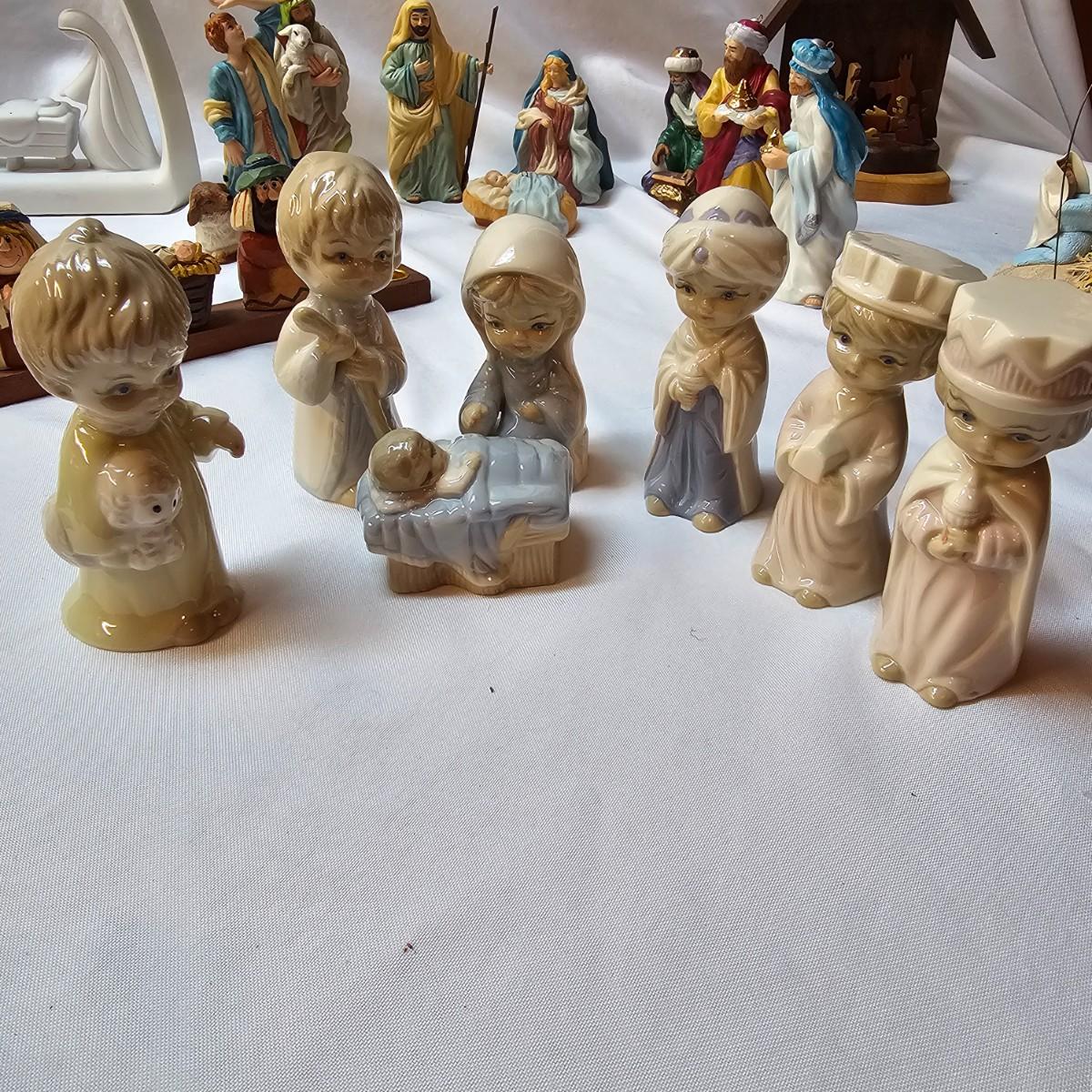 Twenty-seven examples of the Nativity. China, wood, porcelain, salt dough, all different sizes and shapes. Items by Hallmark, Willow Tree and others. Many items handmade. Sizes range from just over an inch tall to 9.5" H for the Willow Tree Demdaco Joseph. See photos for details. Shipping available.